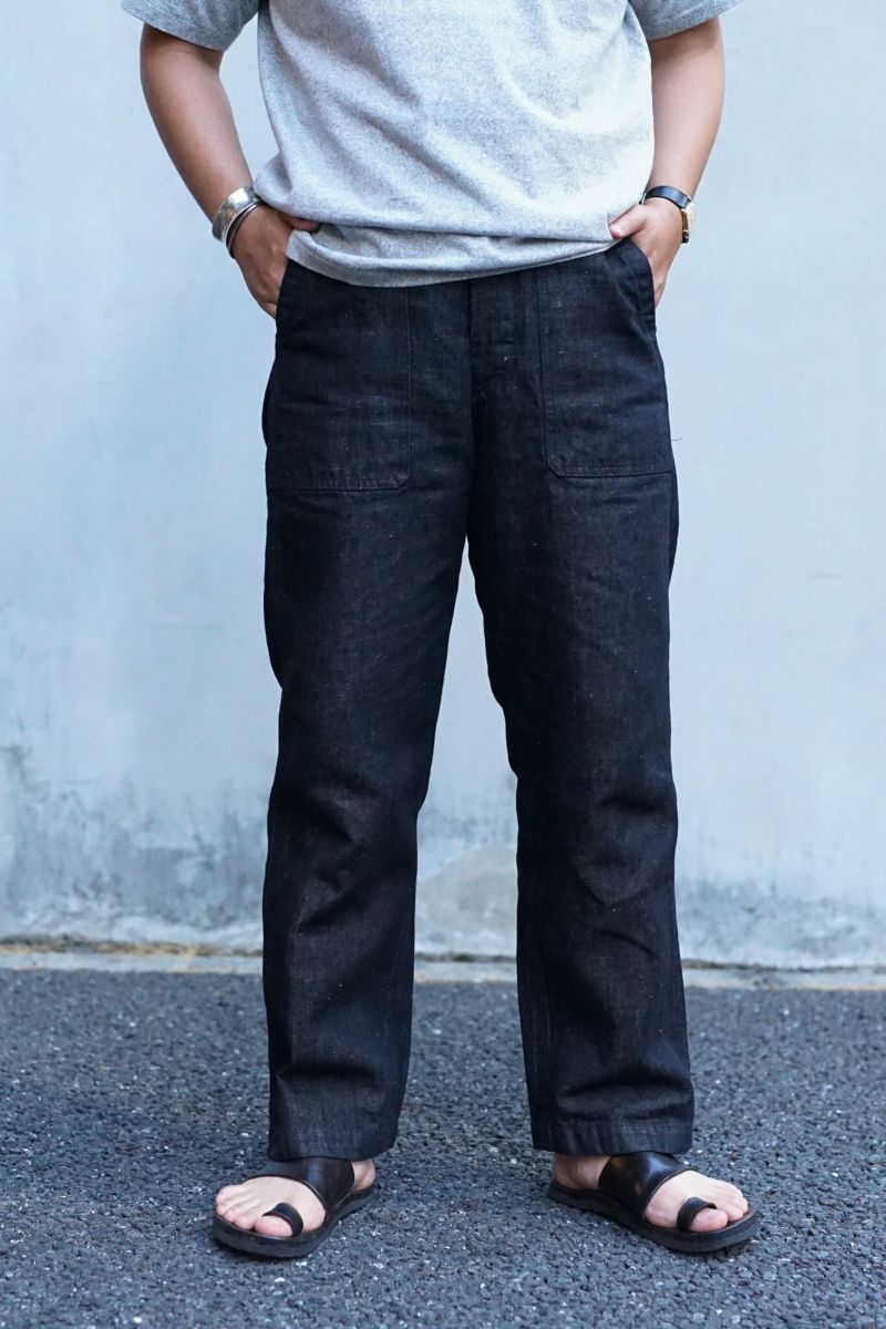 生地は、縦糸にコットン100%のロープ染色糸、緯糸にヘンプ100%を打ち込んだものを使用。緯糸にヘンプを打ち込むという非常にリスクの高い作業を経て織られた特別な生地は、ヴィンテージのワークパンツやカバーオールに近い生地感と雰囲気があります。