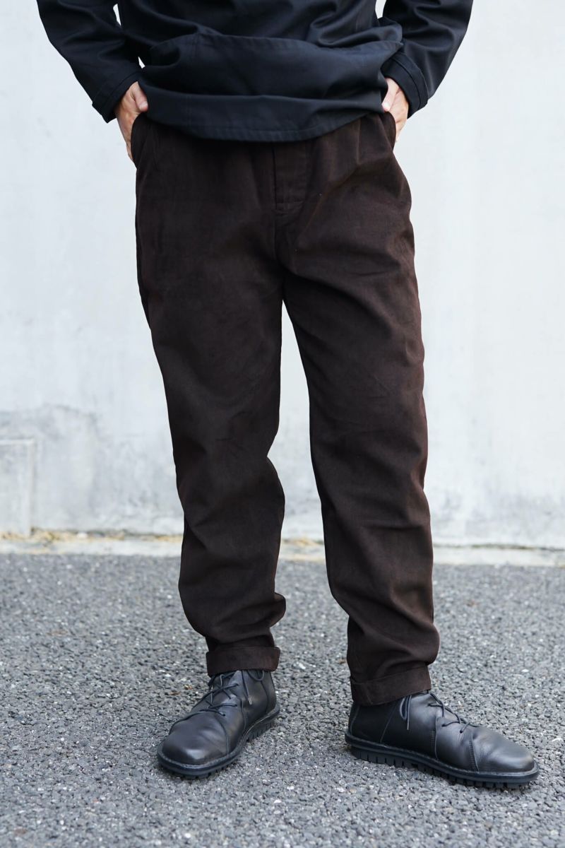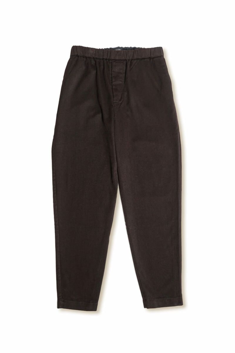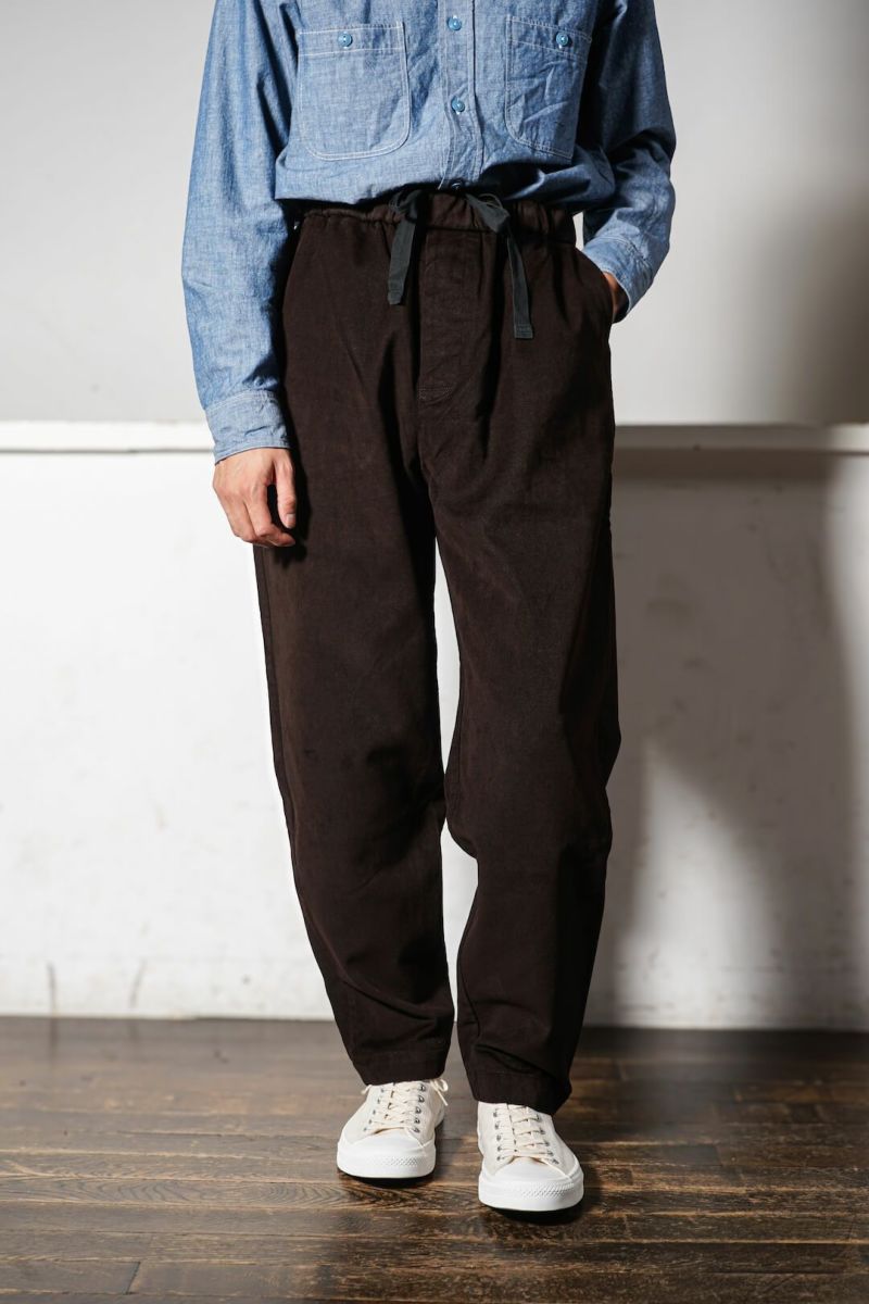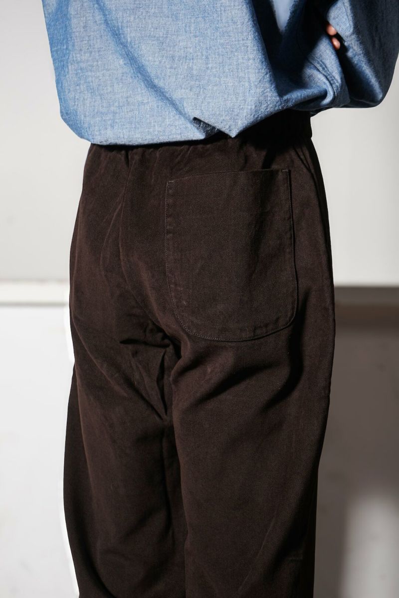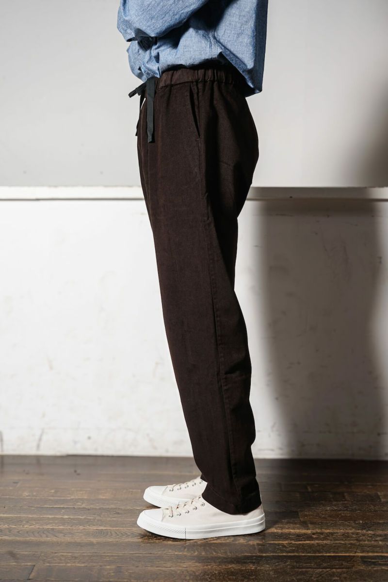 スタイリッシュで洗練されたシルエットのイージーパンツ。シンプルながら、ボタンフライ、スラッシュフロントポケット、バックパッチポケットと充分な機能性を備えたデザイン。素材は、通気性があり、柔らかな質感のコットン×リヨセル混紡生地を使用しています。ウエストは伸縮性があり、内側のドローストリングで調整可能です。