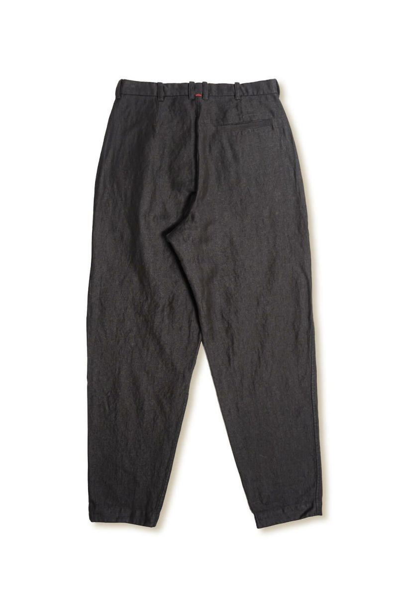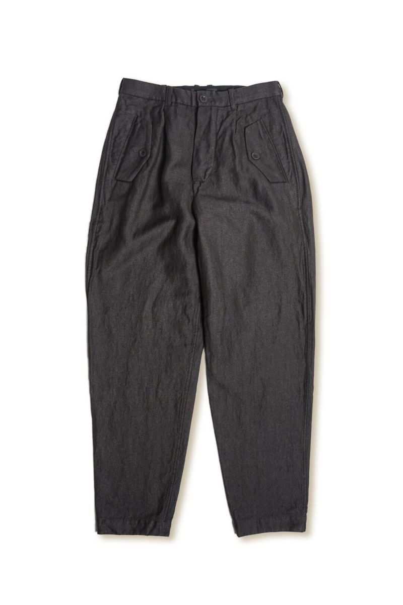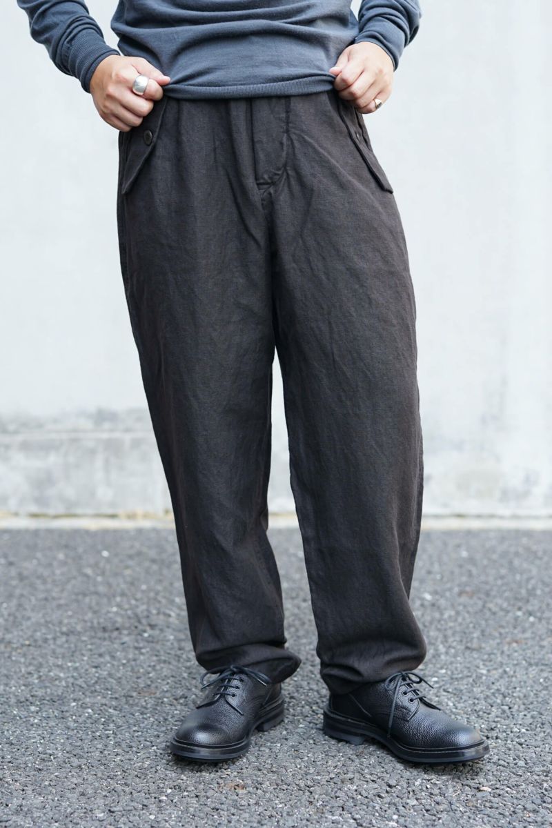 ミリタリーパンツを彷彿とさせるデザインとスタイリッシュなシルエットを備えたパンツ。素材はリネンの通気性とバージンウールの暖かさを両立した混紡生地を使用しています。深みのある風合い豊かな生地感が魅力的です。