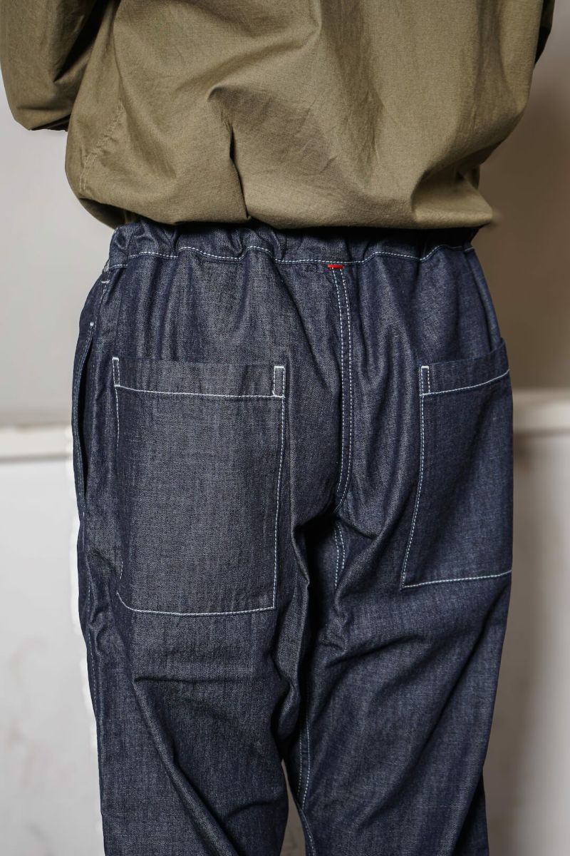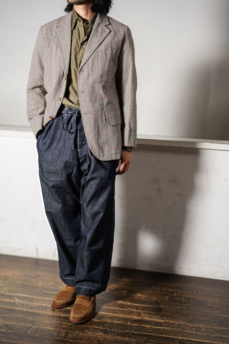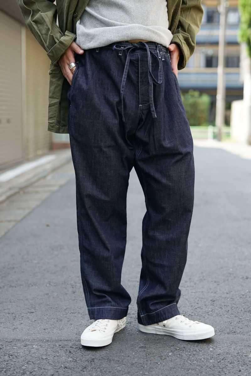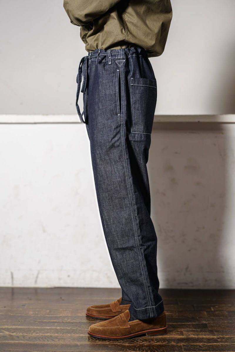 ウエストに共地のベルトが付属するデニムパンツ。ゆったりとしたシルエットと股下のガゼットクロッチ、ライトオンスのデニム生地が相まったリラックススタイルの一本。デニムならではのエイジングを楽しめるのも魅力です。