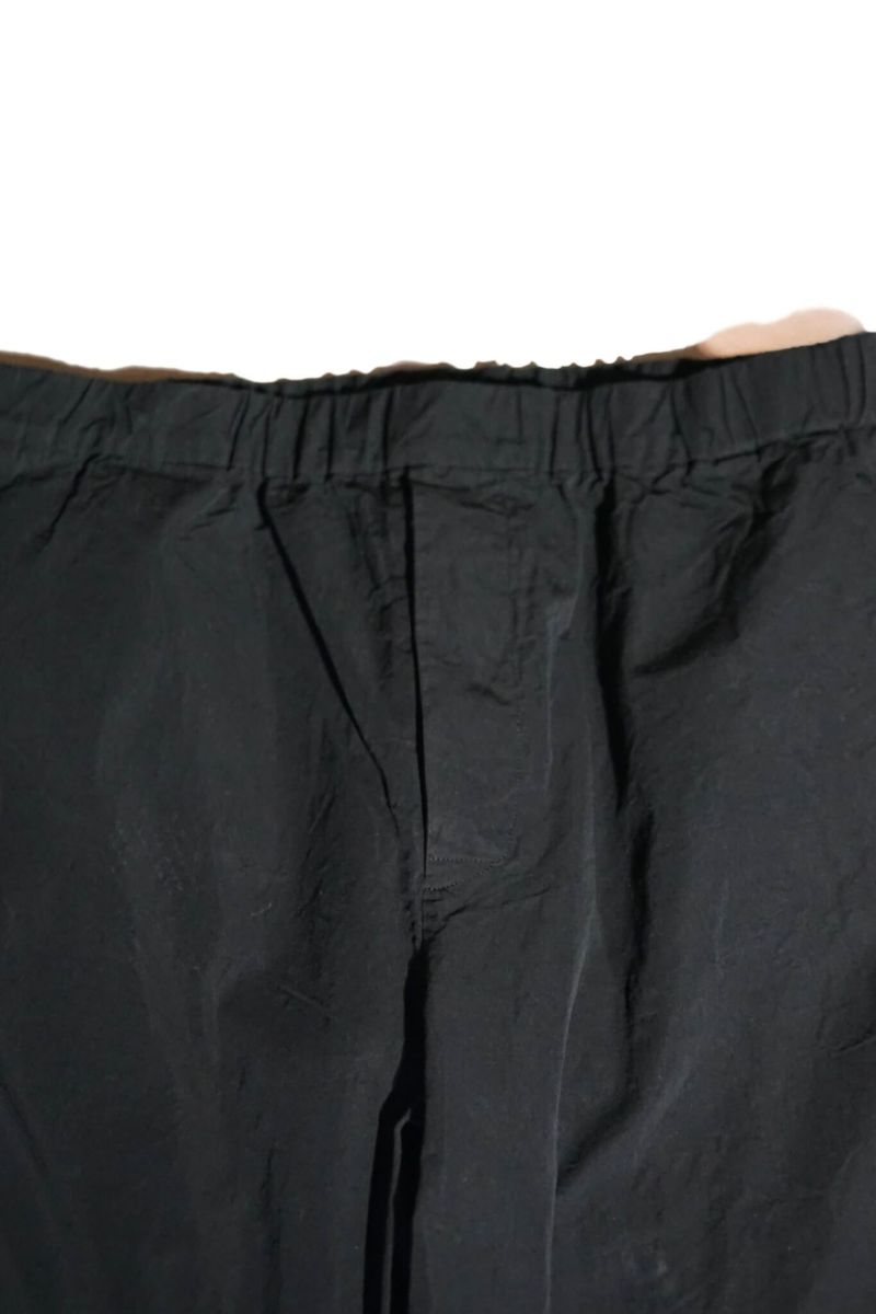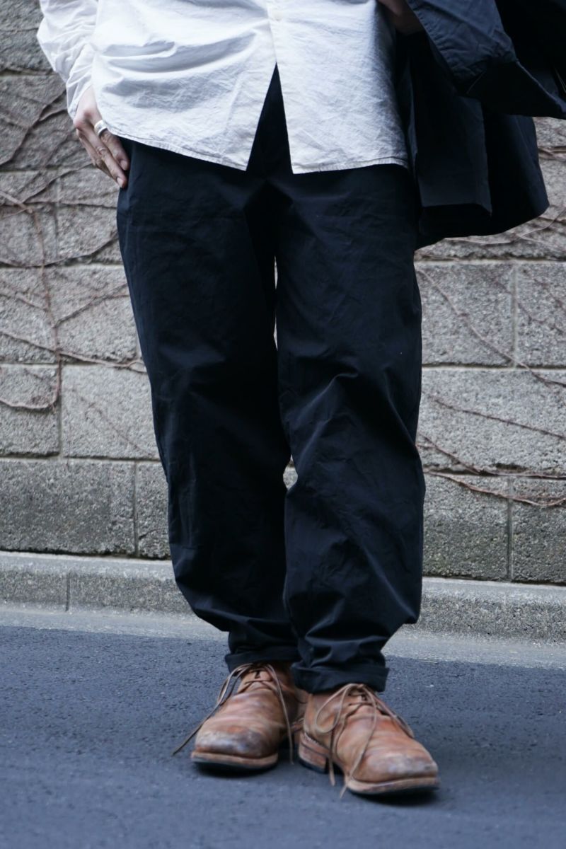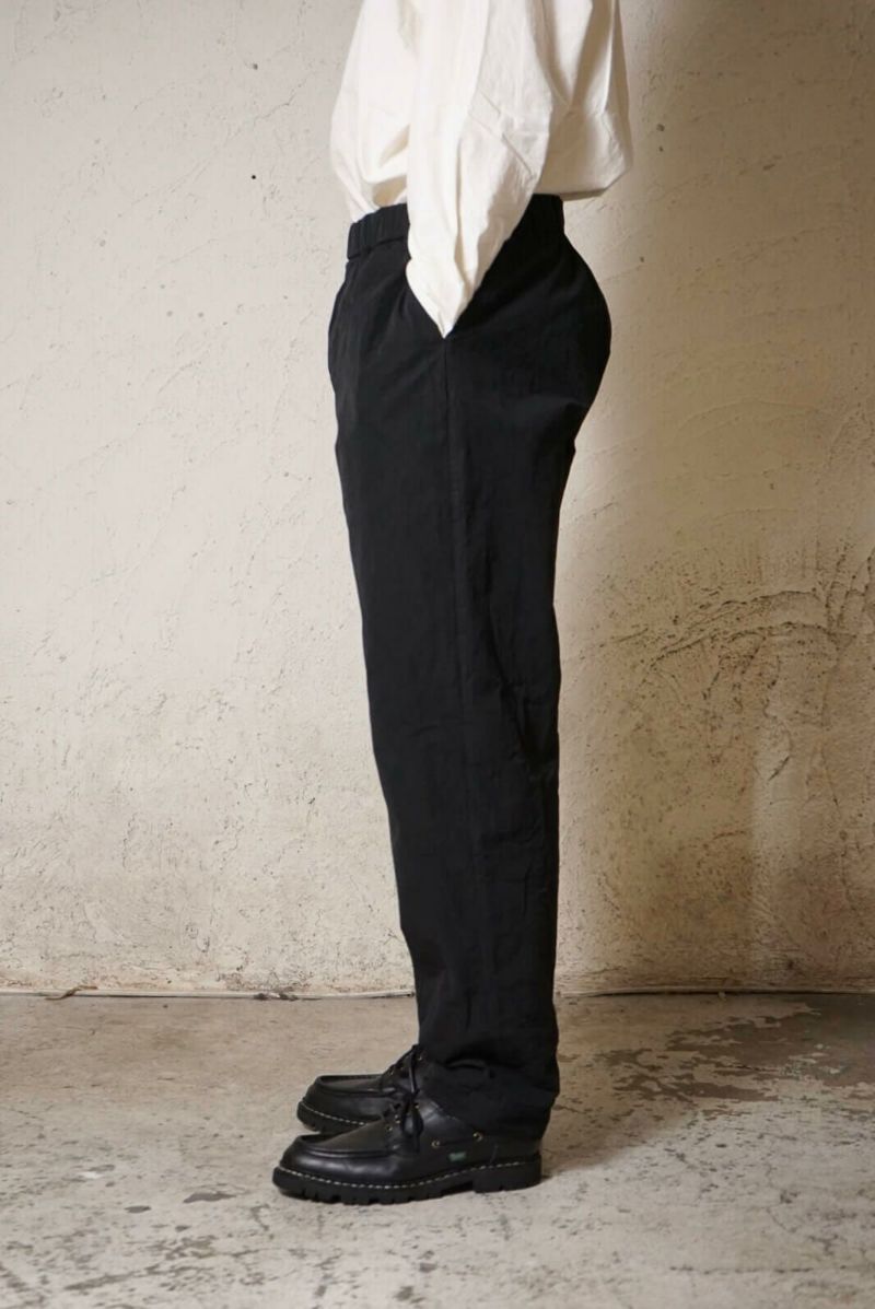 ブランドを象徴する生地であるペーパーコットンを使用したイージーパンツ。ゆとりのある腰回りに対して細めの裾幅が特徴的なシルエットを生み出しています。軽くてハリのある質感とウォッシュ仕上げによるシワ感が特徴です。リラックス感がありながらも洗練された雰囲気を醸し出す一本。