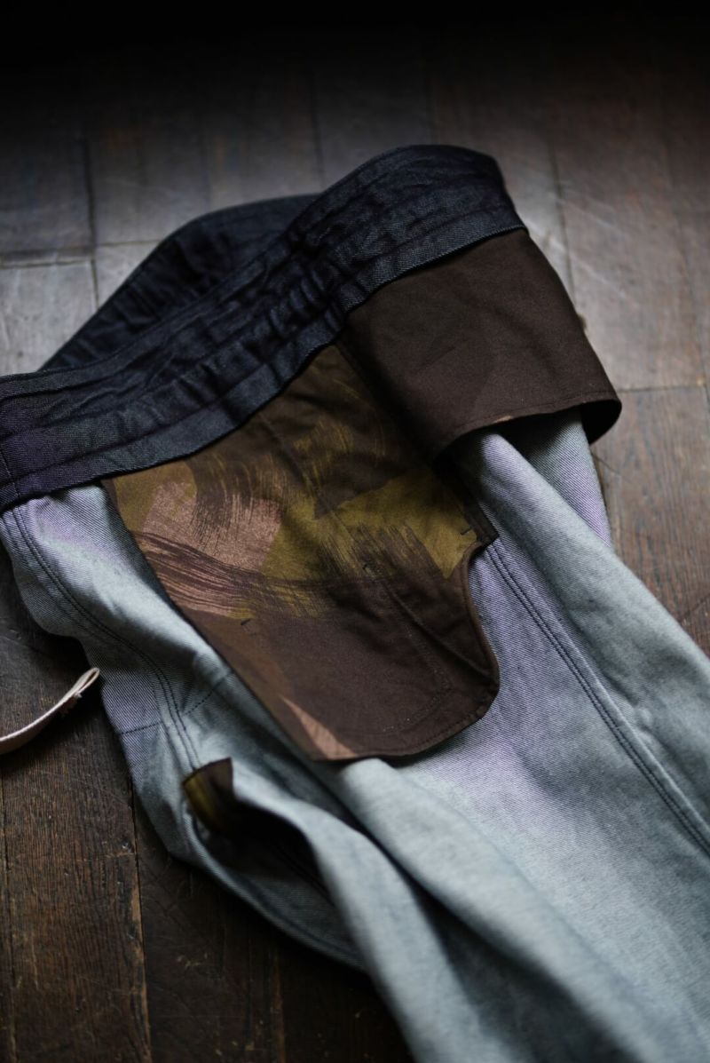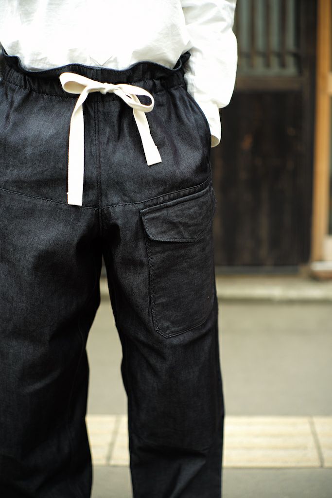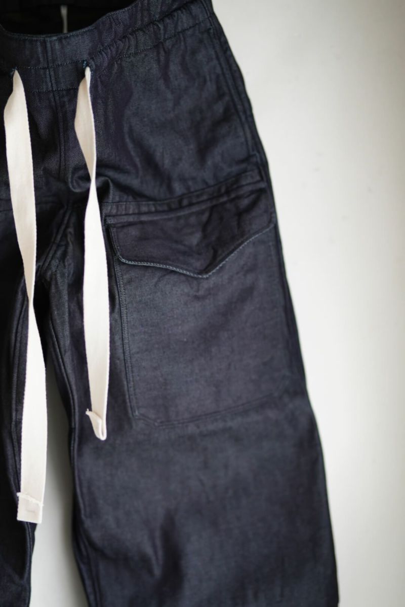 様々なヨーロッパミリタリーパンツから着想を得て製作した、SUS-SOUS大定番のMK-1トラウザーズ。スーピマコットンのデニム生地を使用し、ゆったりとしたワイドシルエットに仕上がっている。
