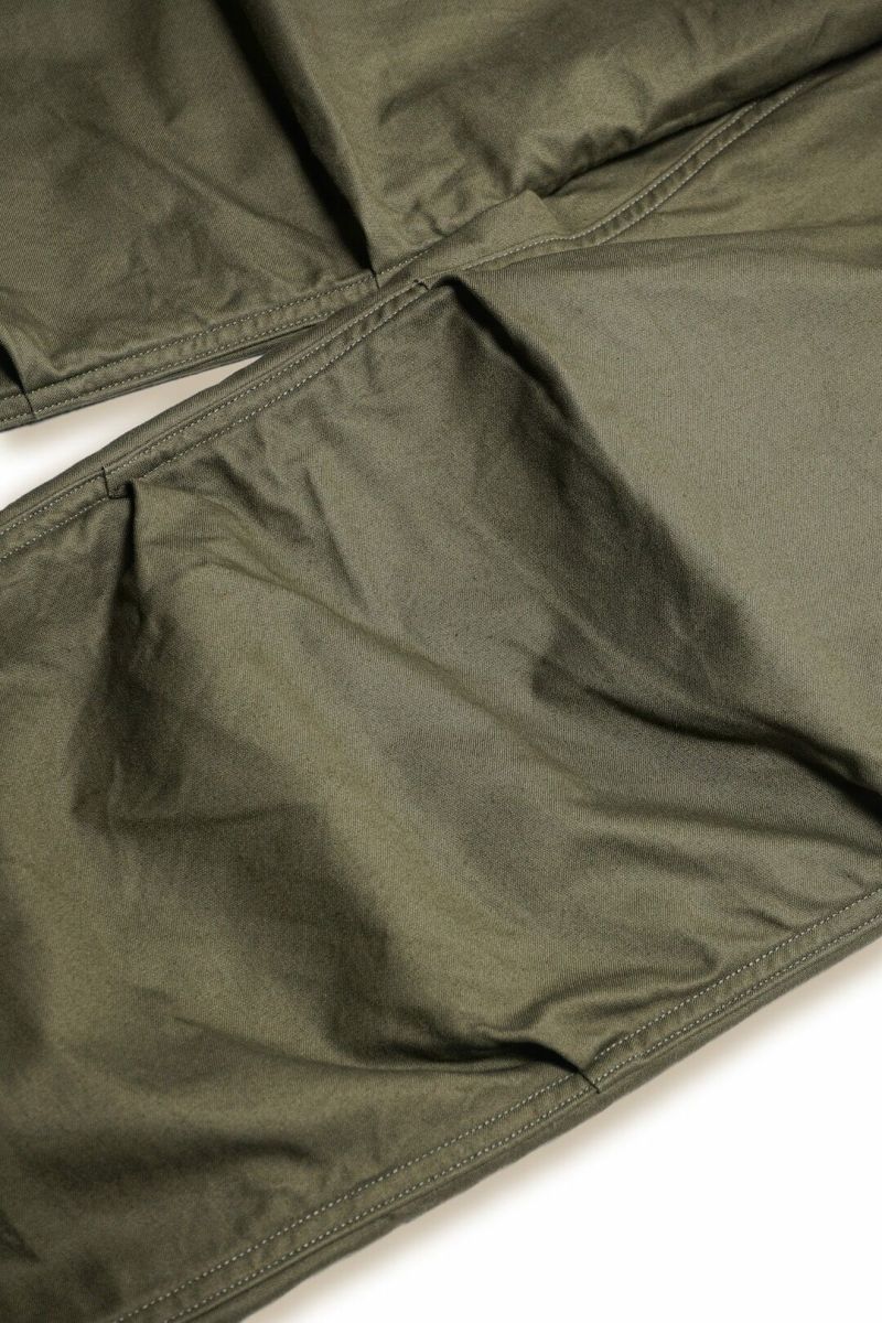 フロントに大きなマチ付きポケットを配した定番のファティーグトラウザーです。素材は緯糸にムラ糸を打ち込み、スレンで染めた高密度バックサテン。初めは若干艶感がありますが、履きこむことで自然なエイジングが楽しめる素材です。膝に4か所タックを入れた立体的なパターンに。