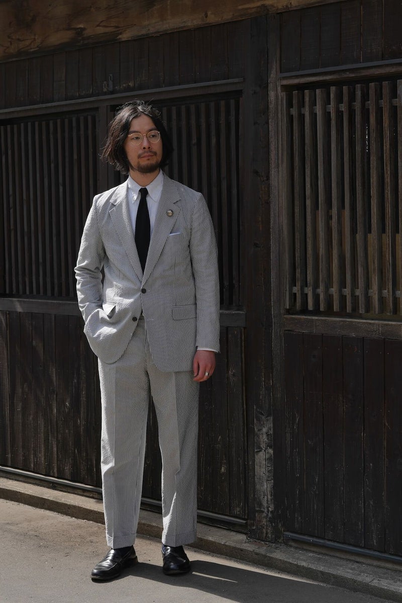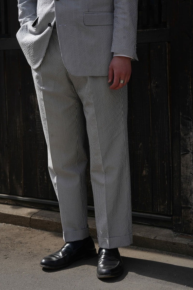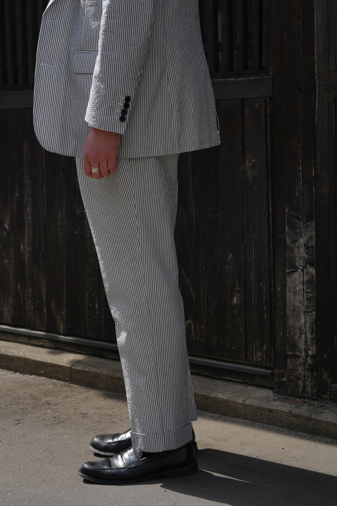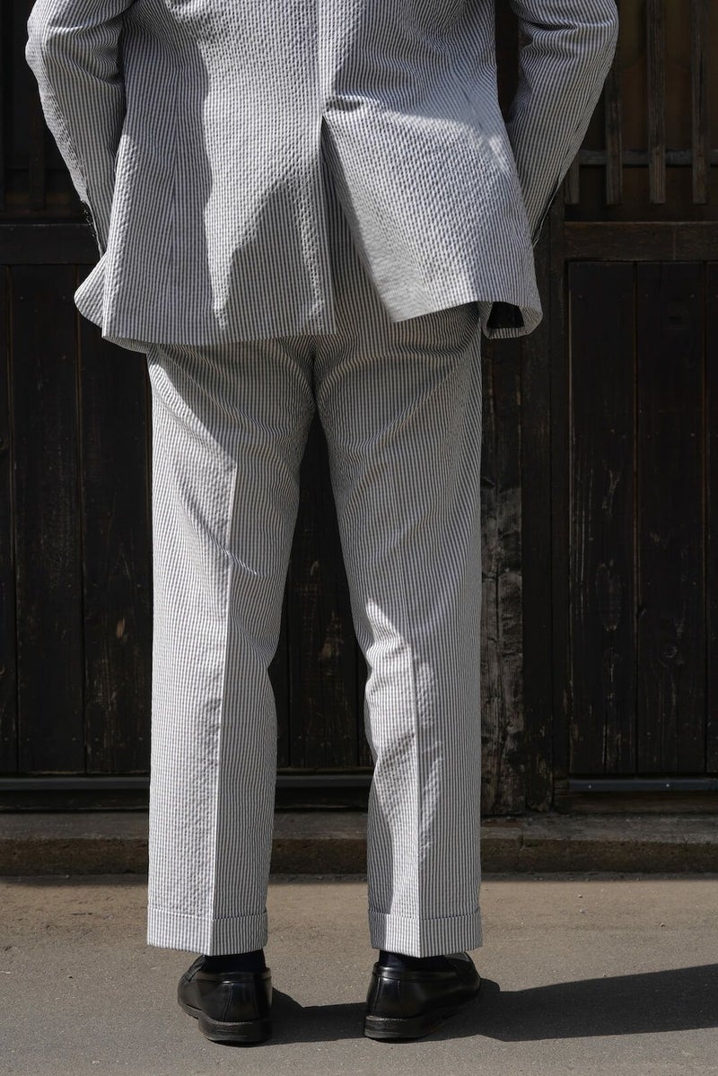 KENNETH FIELD(ケネスフィールド)の2プリーツトラウザーズ。 素材は、北イタリアの毛織物産地であるビエラにありAngelico(アンジェリコ)社のシアサッカー生地を使用しています。ウール混のシアサッカーはしなやかで強度があり、型崩れしづらくシワになりにくい特徴があります。また、冬のイメージがあるウール混生地ですが、実は放熱、放湿性に優れており、コットンウールのシアサッカーは、汗ばむ夏場に最適な素材です。 同素材のスポーツコートとセットアップでも単品でも着用頂けます。当店のみの展開となるエクスクルーシブモデルです。 Body : 60% Wool / 40% Cotton Lining : 100% Cupro KENNETH FIELD / 2P Trouser Angelico Seersucker(Arch Exclusive) Price ¥38,500(税込)