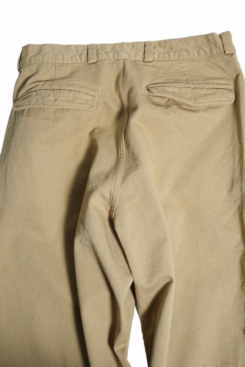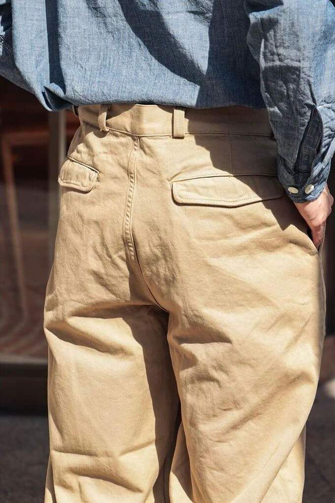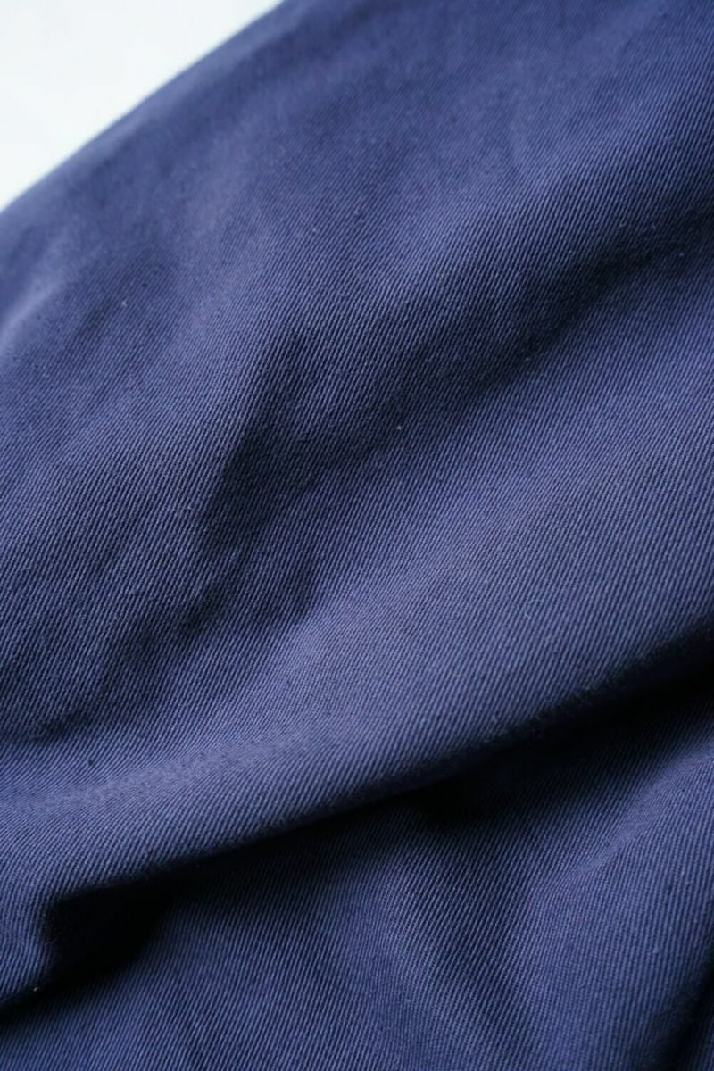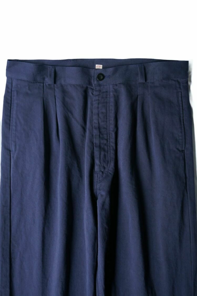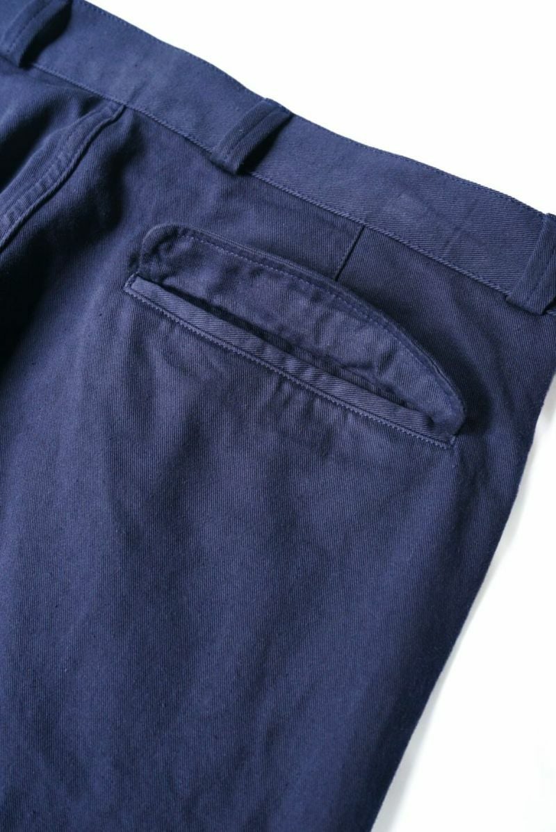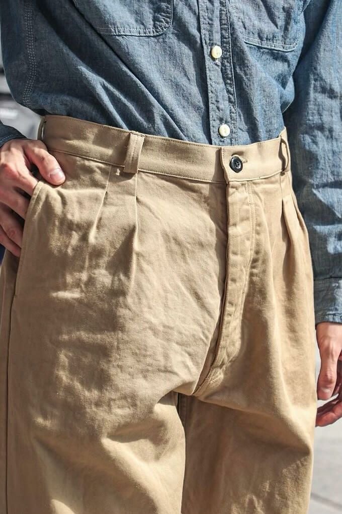 50年代のフランス軍チノパンツがデザインベース。経糸にギリシャピマコットンの単糸を、緯糸にインドスビンコットンの双糸を使用し作成した最高級オリジナルチノ素材です。経糸に程よいムラ感があるため綾目が立体的になっています。ゆとりのある、ボリューム感ある一本です。