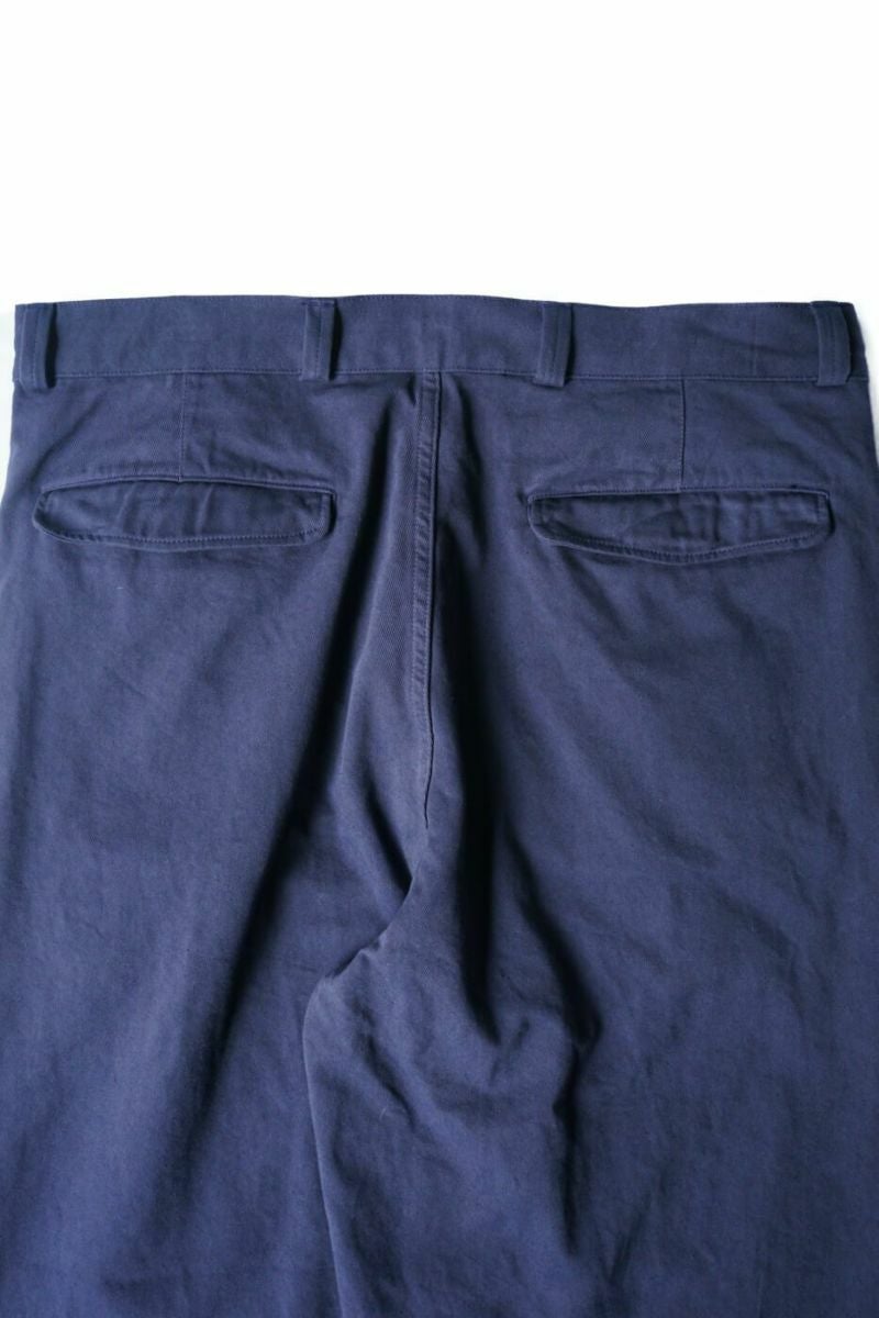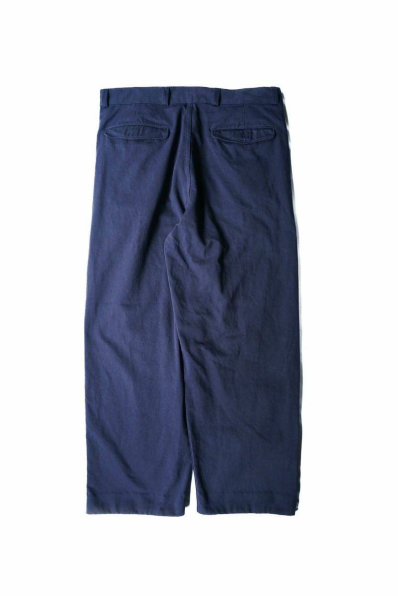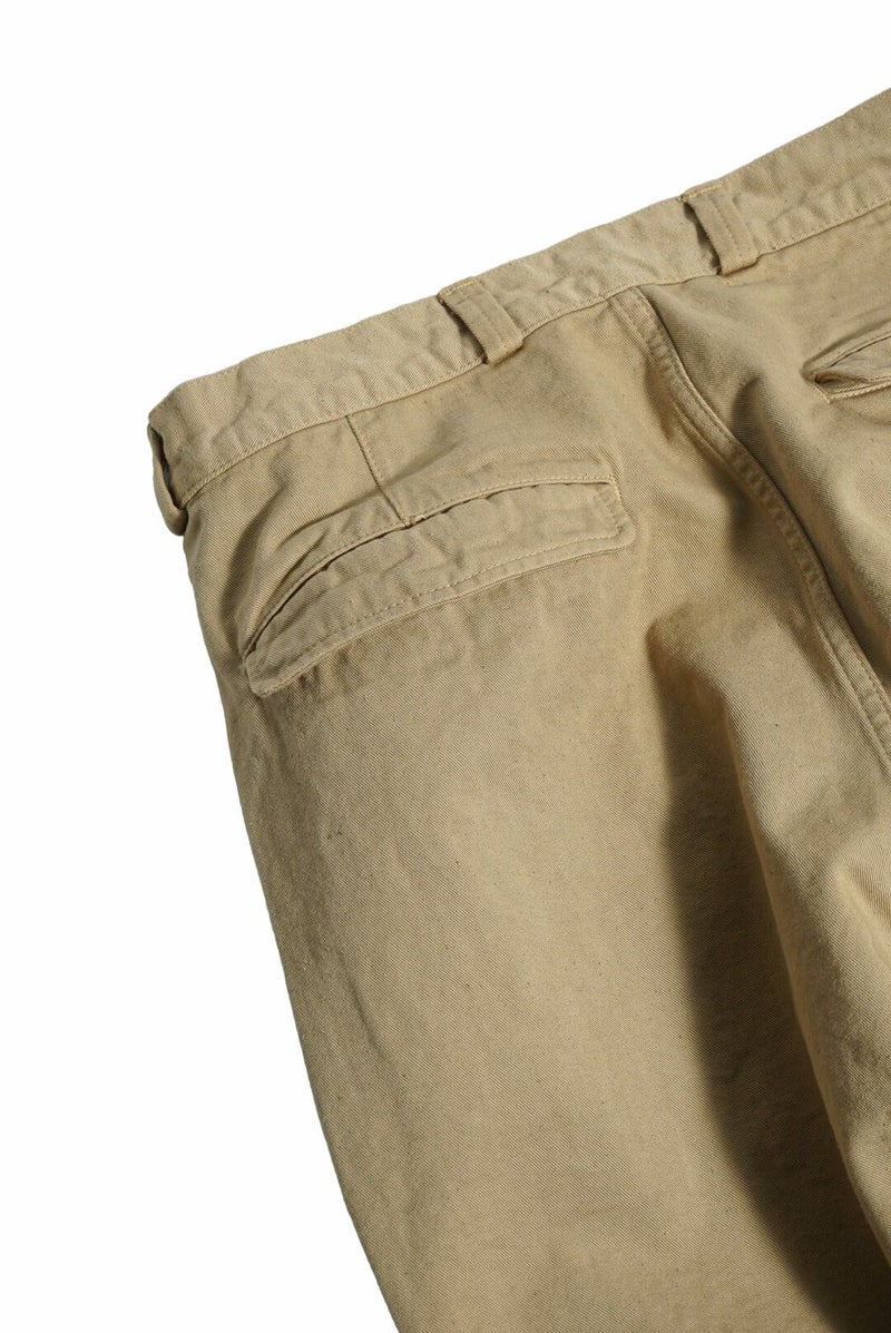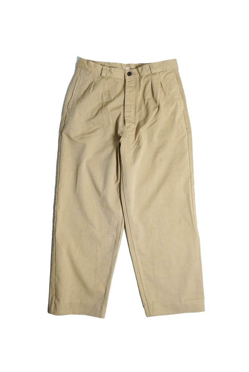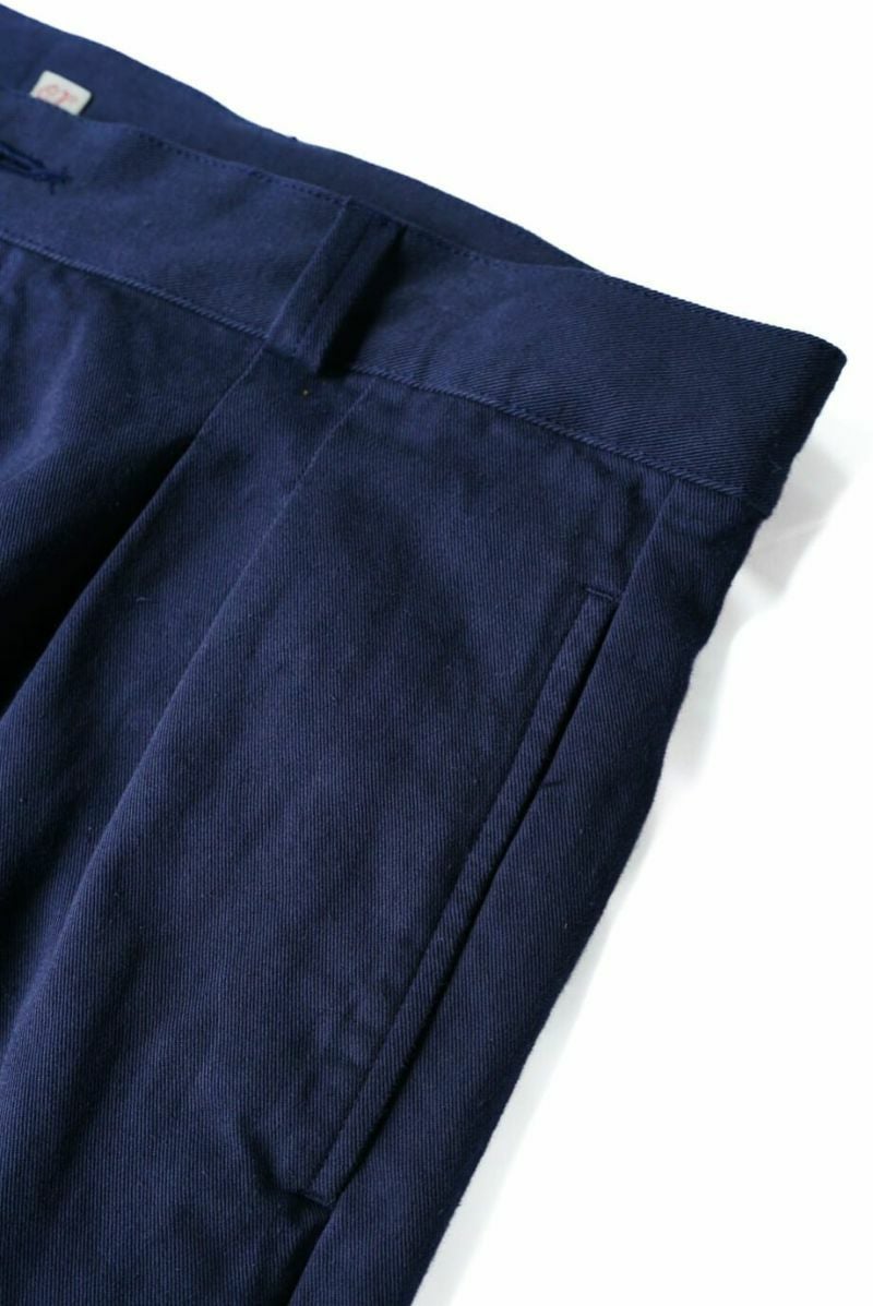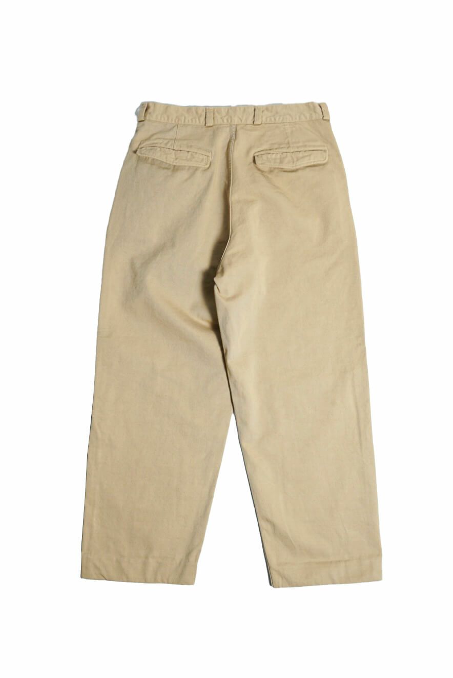 50年代のフランス軍チノパンツがデザインベース。経糸にギリシャピマコットンの単糸を、緯糸にインドスビンコットンの双糸を使用し作成した最高級オリジナルチノ素材です。経糸に程よいムラ感があるため綾目が立体的になっています。ゆとりのある、ボリューム感ある一本です。