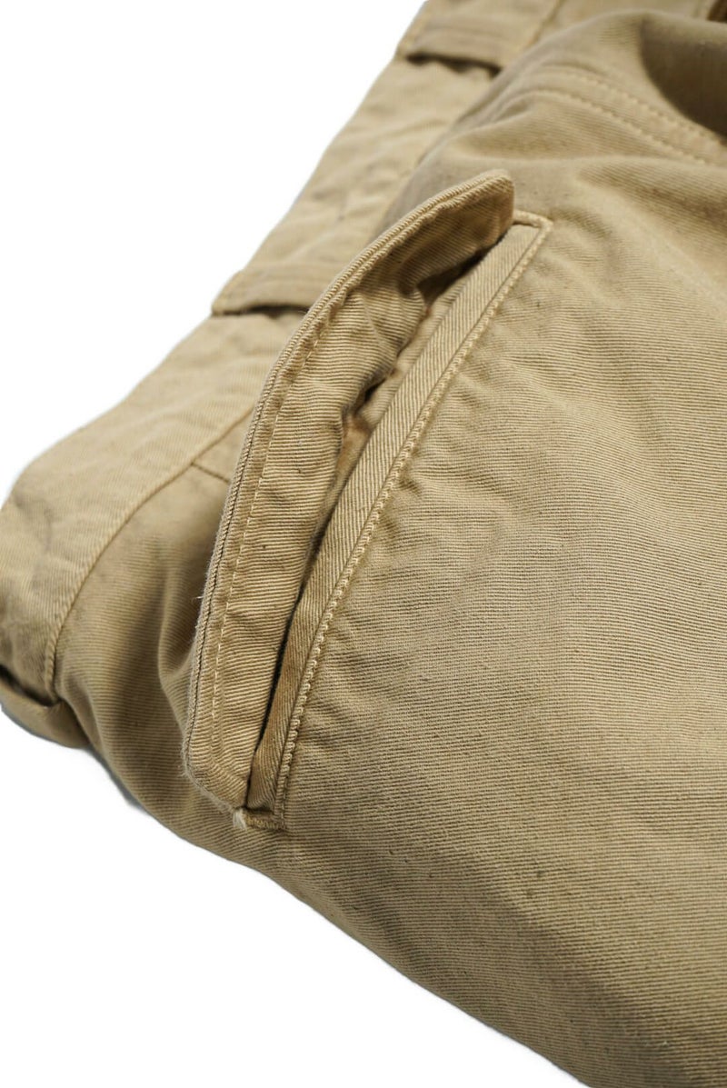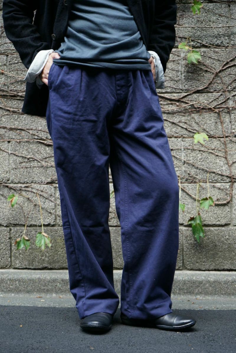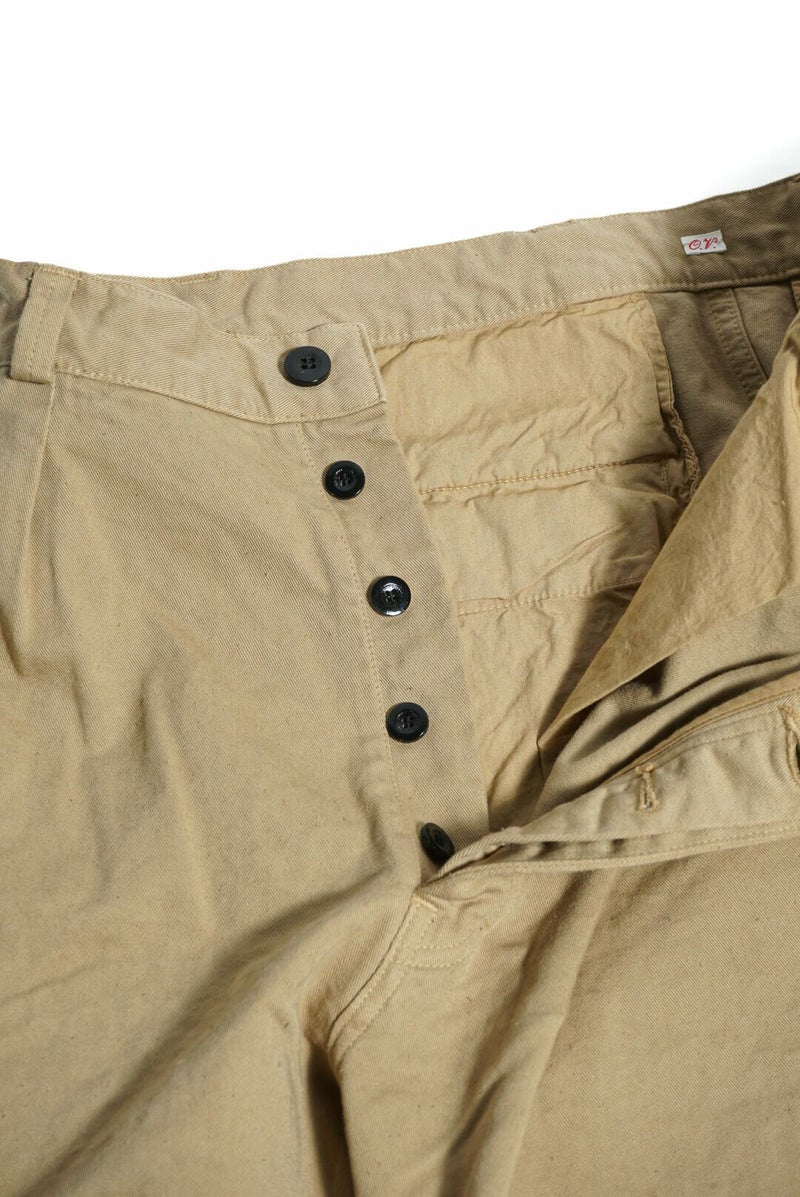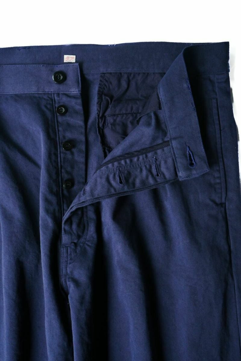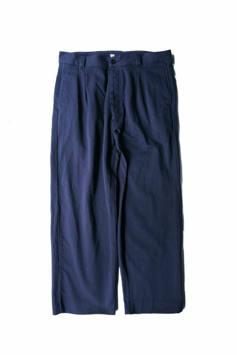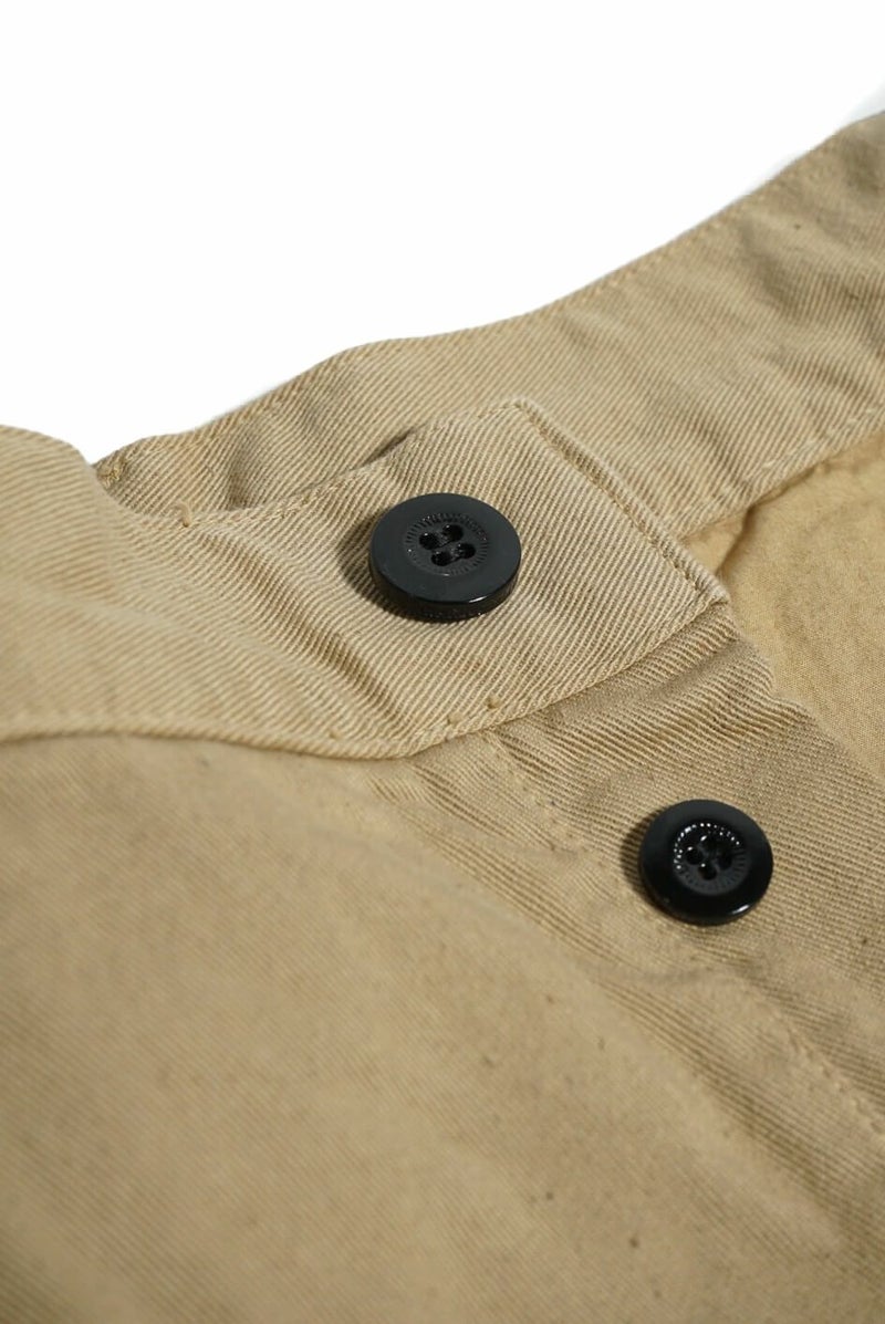 50年代のフランス軍チノパンツがデザインベース。経糸にギリシャピマコットンの単糸を、緯糸にインドスビンコットンの双糸を使用し作成した最高級オリジナルチノ素材です。経糸に程よいムラ感があるため綾目が立体的になっています。ゆとりのある、ボリューム感ある一本です。