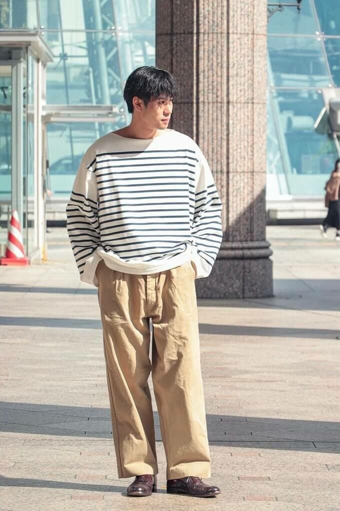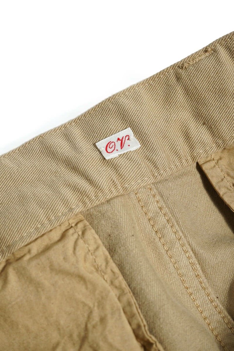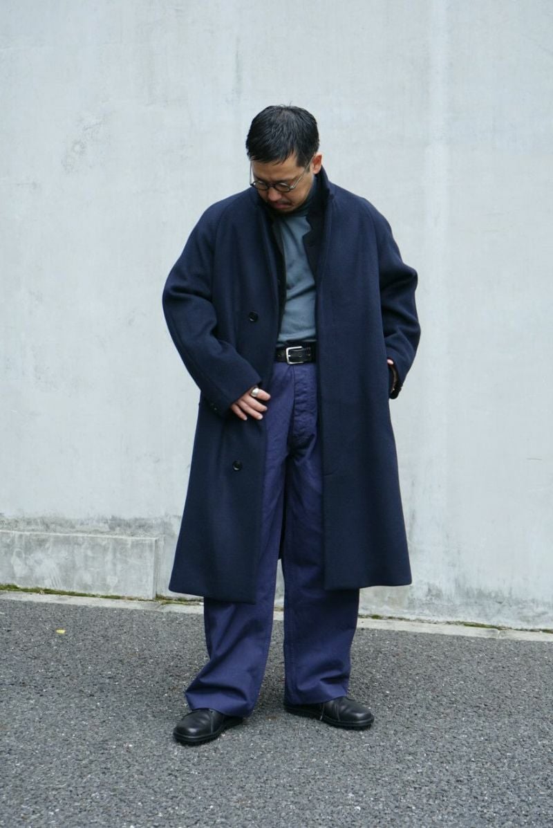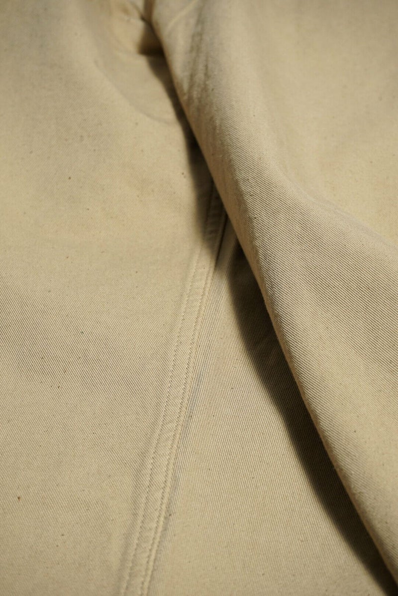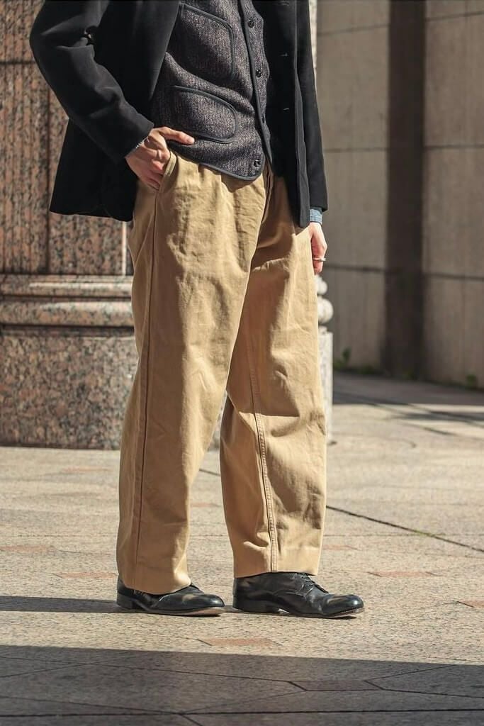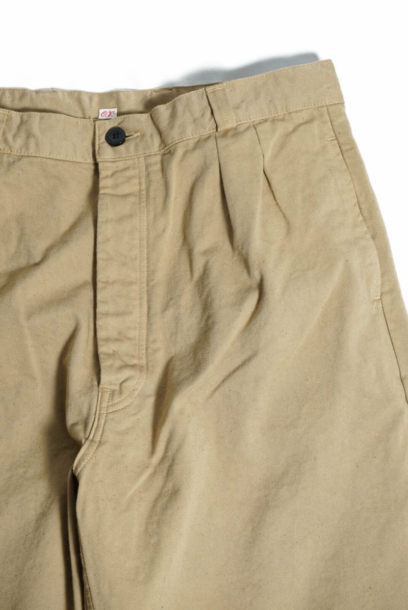 50年代のフランス軍チノパンツがデザインベース。経糸にギリシャピマコットンの単糸を、緯糸にインドスビンコットンの双糸を使用し作成した最高級オリジナルチノ素材です。経糸に程よいムラ感があるため綾目が立体的になっています。ゆとりのある、ボリューム感ある一本です。