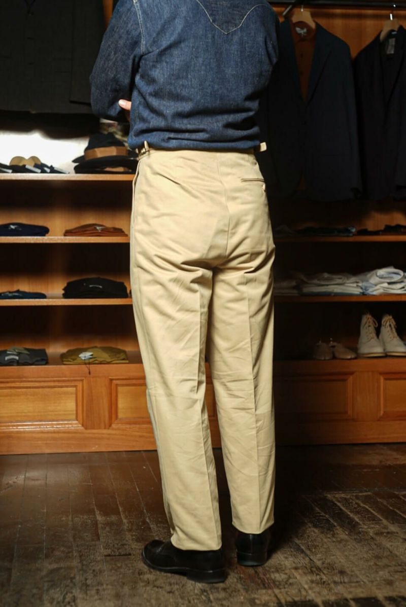ウエストバンドはフックアンドバークロージャーの仕様で、フロントはボタンフライ、サイドにはフィット感を高めるアジャスター、そしてマーベルト(腰裏)にはブレイシーズボタンが付属するクラシックな作りです。