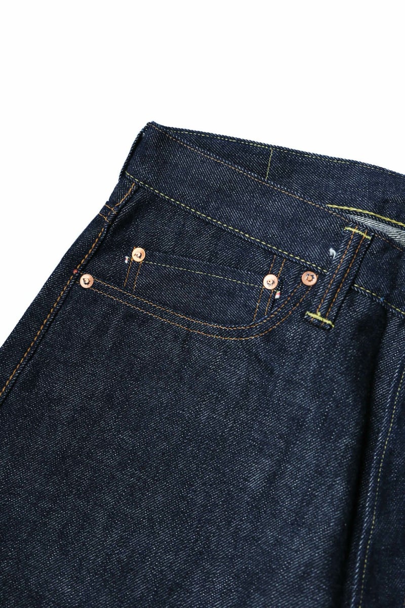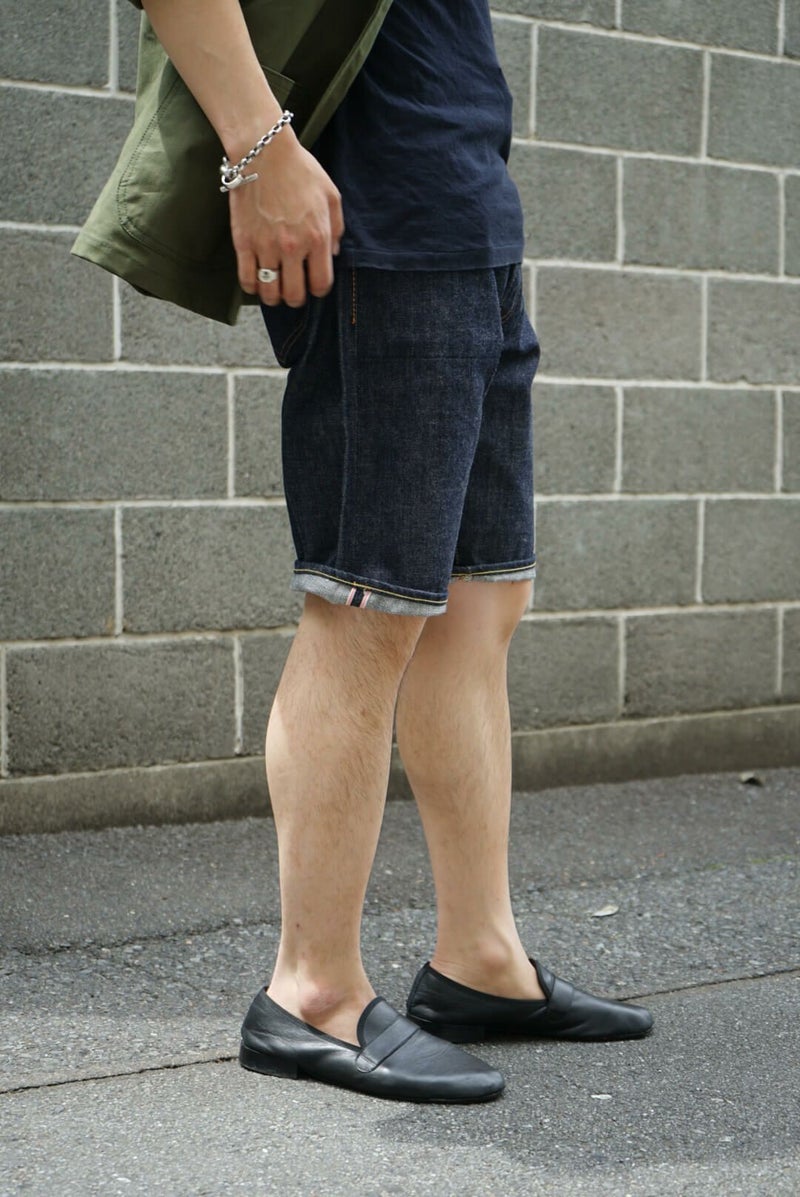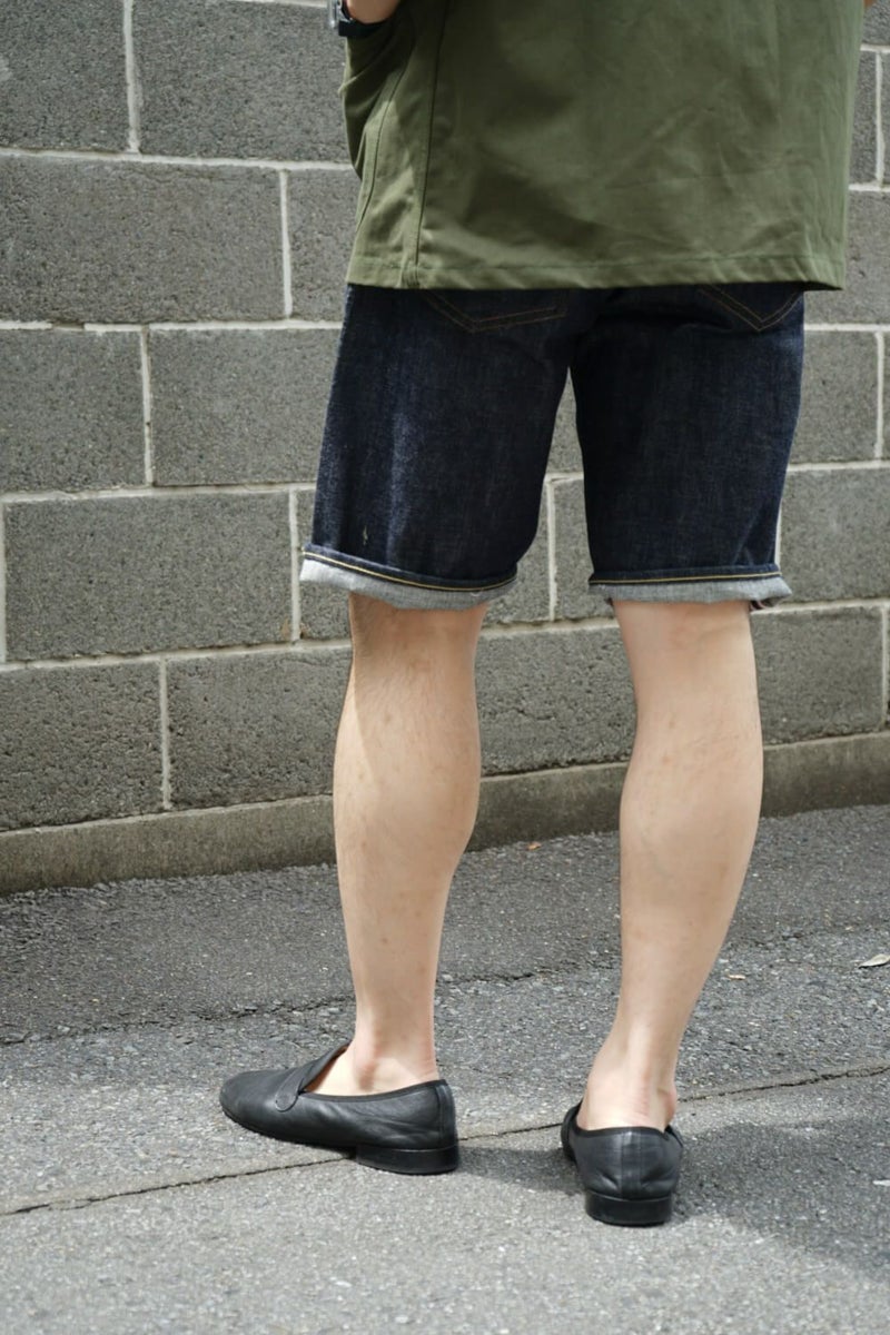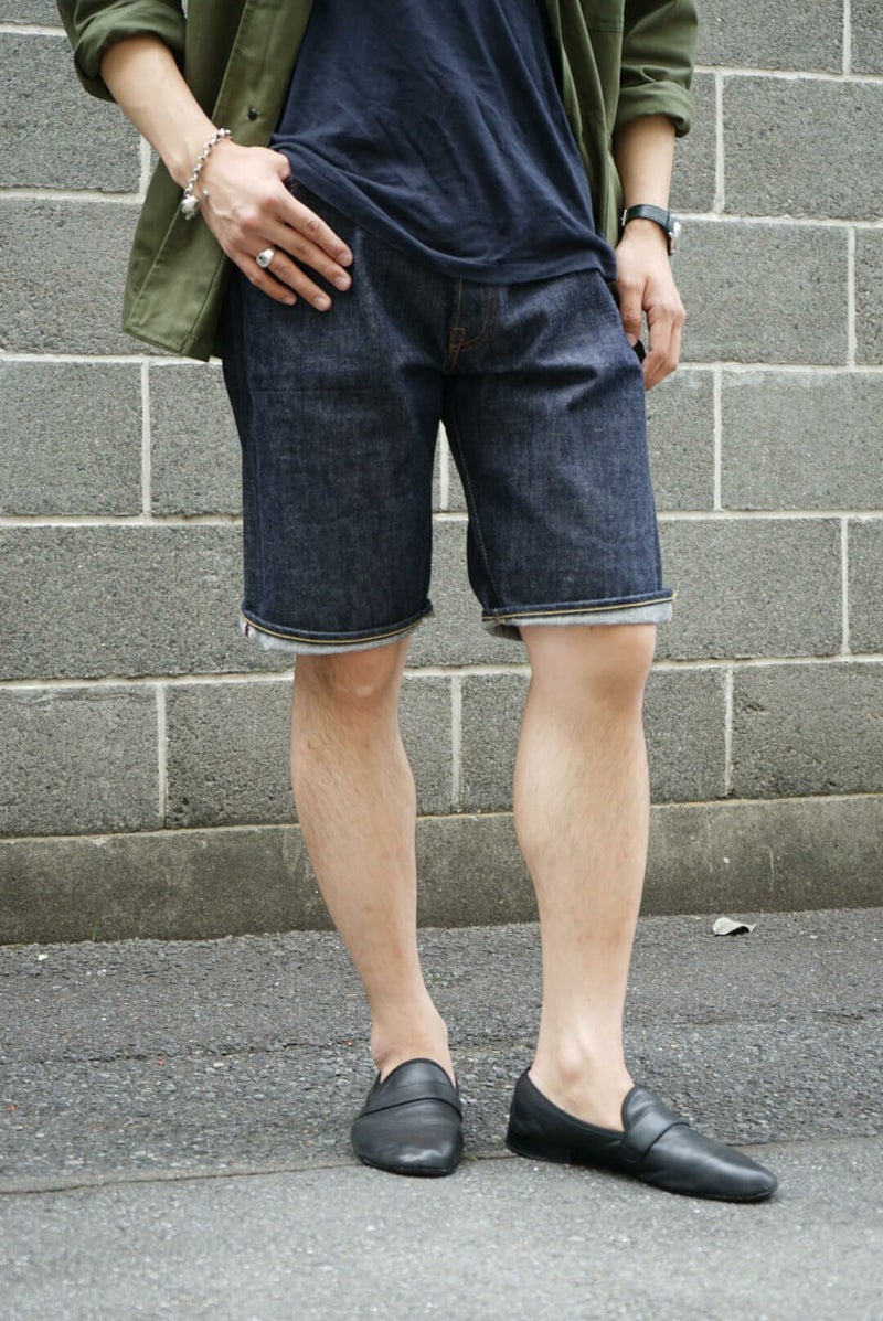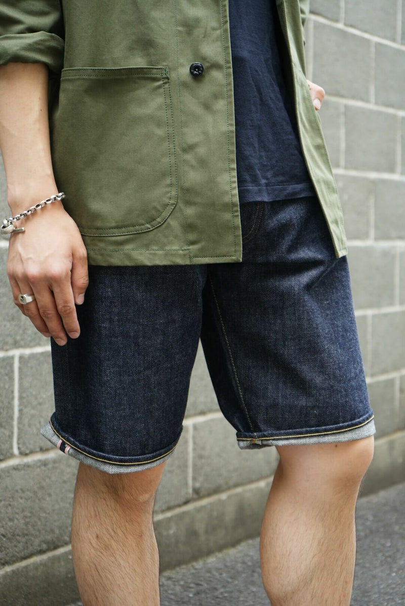 デッドストックセルビッチデニムを使用したショートパンツ。オリジナルイケ綿デニムとはまた違った独特の風合いがあります。アウトシームは耳仕様なので少し裾を折り返して耳を見せることも可能です。勿論フルレングスと同じく、こだわりのオリジナルパーツを使用しているので着込んでいく毎にエイジングしていきます。