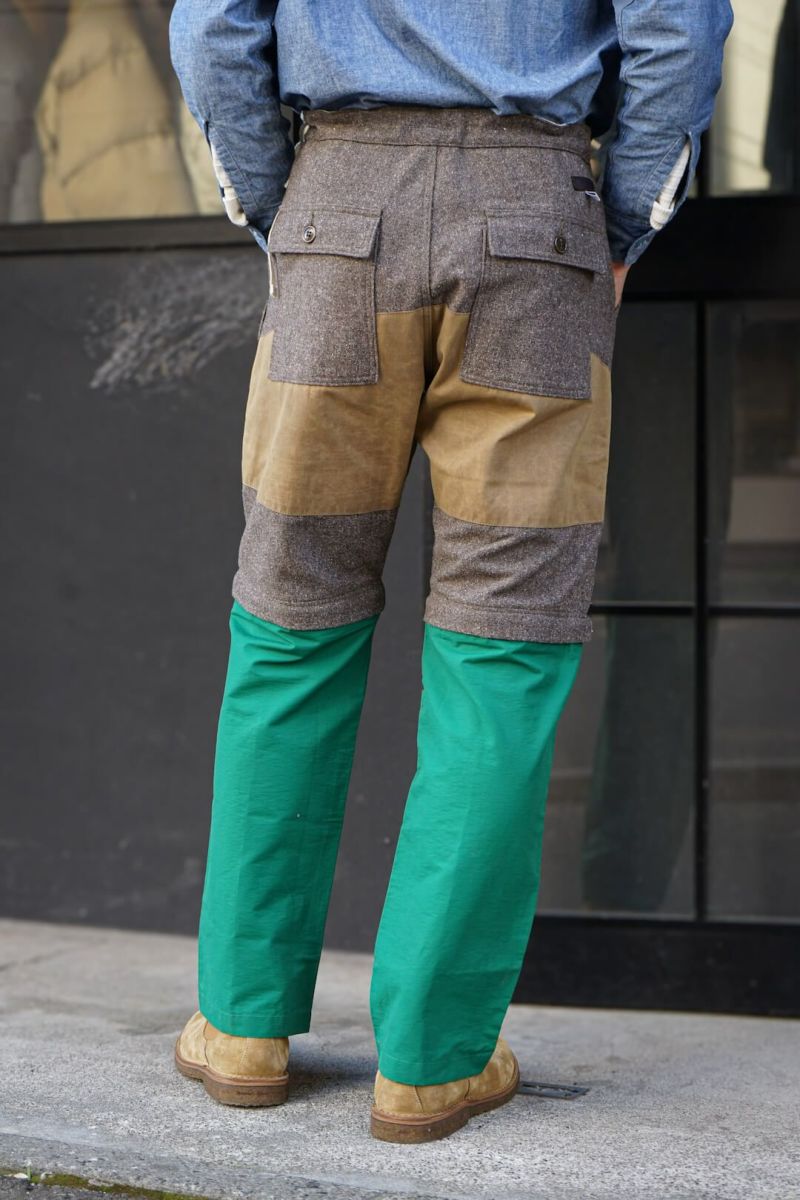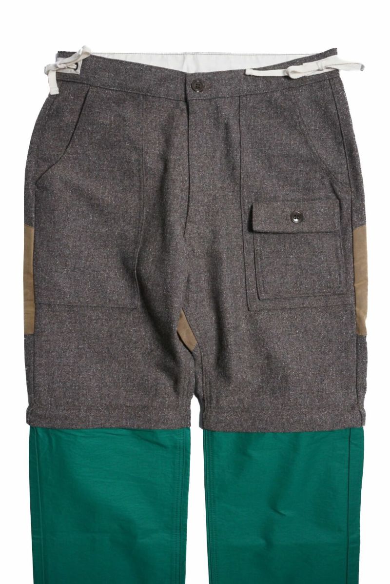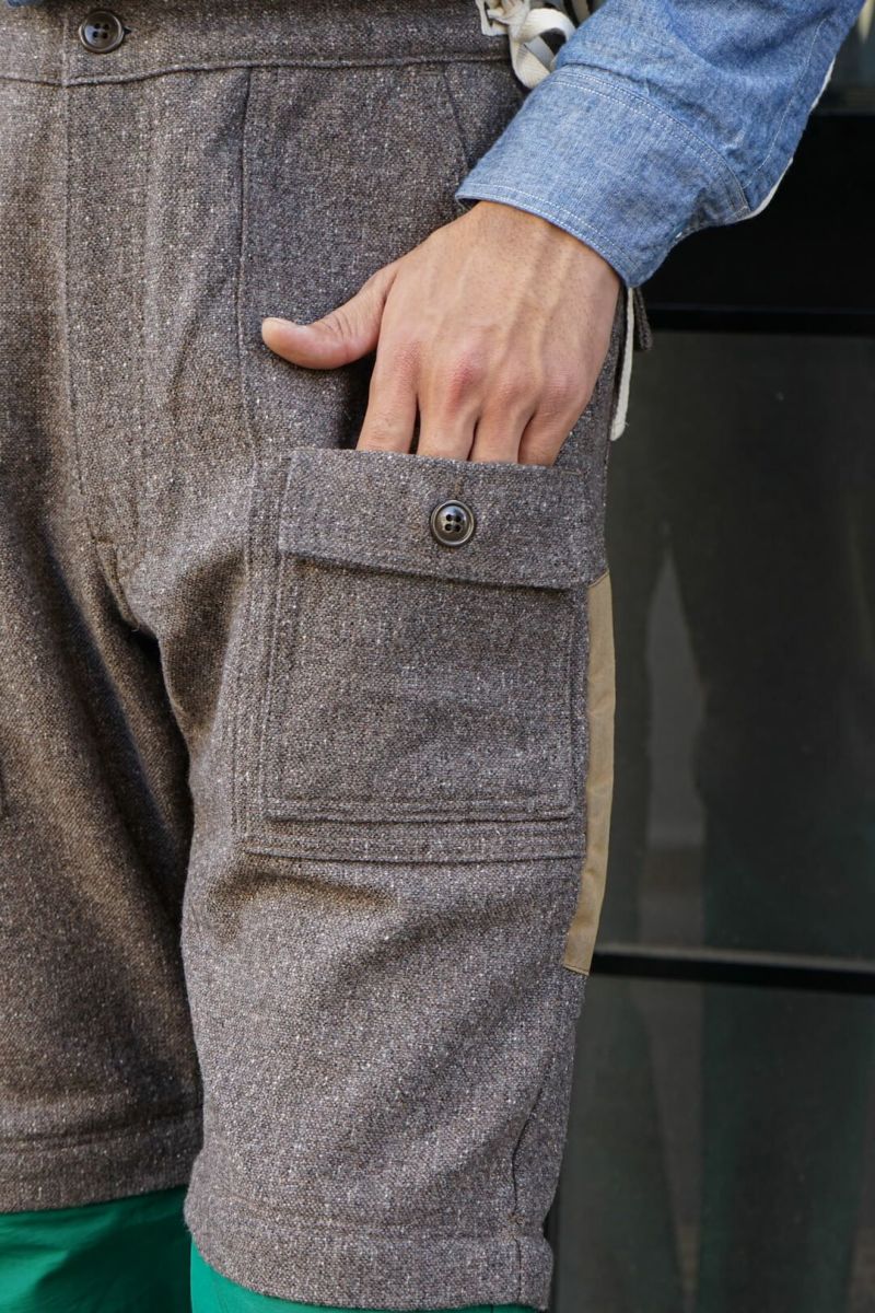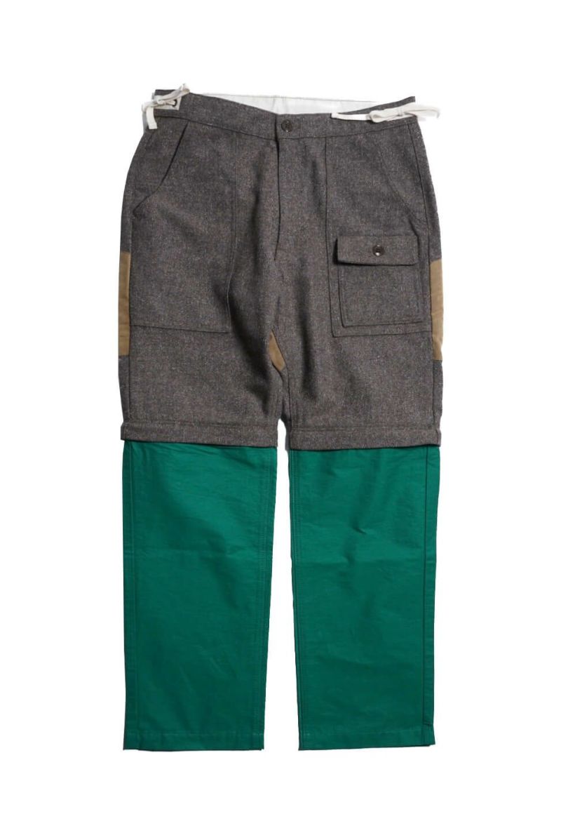 アイテム名にもあるように、フロントに5つ、バックに2つと、計7つものポケットを装備したパンツ。ウール素材とパラフィン加工が施された異素材のコンビネーションが、なんともヘヴィーデューティな雰囲気を醸し出します。膝下のコットン×ナイロン素材はジップで脱着可能なコンバーチブル仕様。