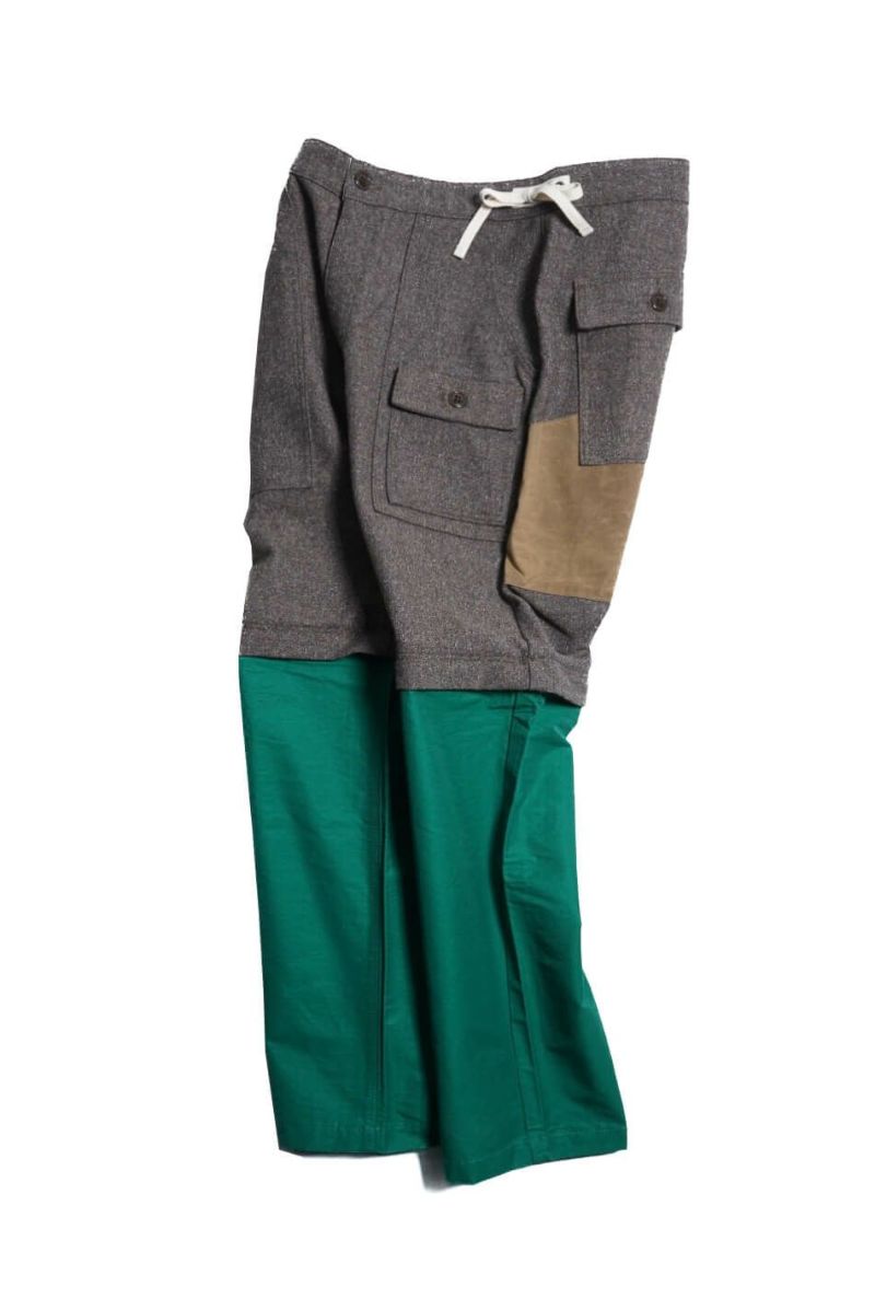 アイテム名にもあるように、フロントに5つ、バックに2つと、計7つものポケットを装備したパンツ。ウール素材とパラフィン加工が施された異素材のコンビネーションが、なんともヘヴィーデューティな雰囲気を醸し出します。膝下のコットン×ナイロン素材はジップで脱着可能なコンバーチブル仕様。
