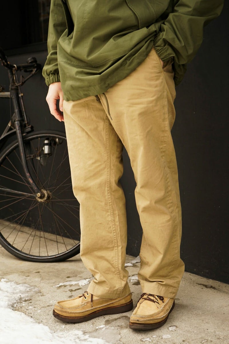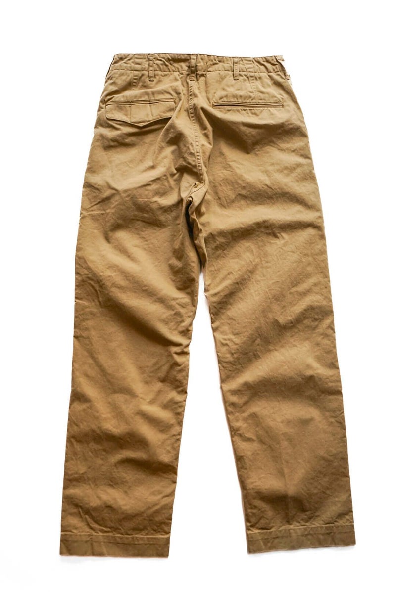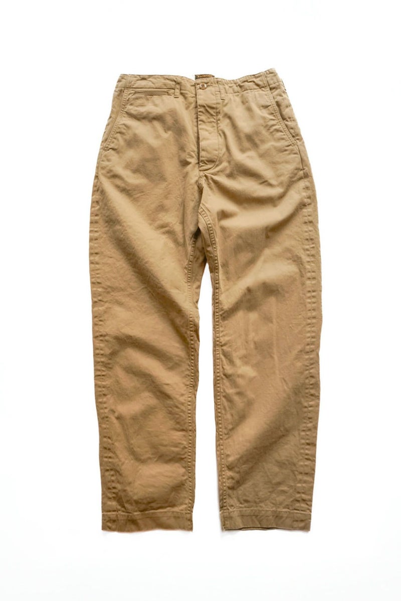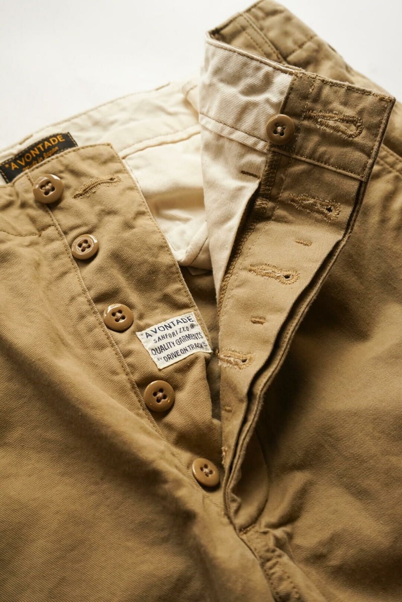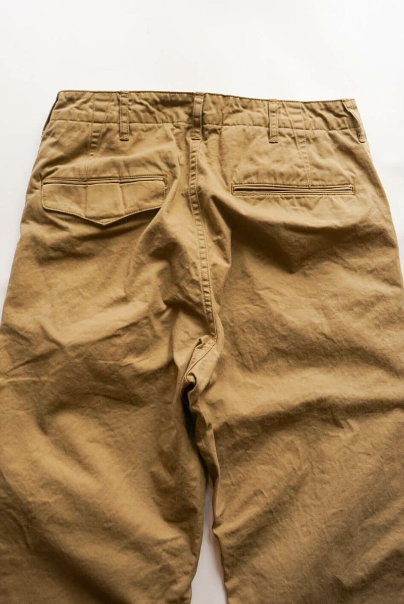 A VONTADE(アボンタージ) ブランド定番のクラシックチノトラウザースです。素材は定番の、シャトル機で高密度に織りこまれたオリジナルセルビッチチノを使用。 仕上げに天然樹脂加工を施し、コシのある素材感となっています。 比翼仕様の片フラップポケット、尻繰りと内股は巻き縫い(環縫い)仕様で、脇にはセルビッチを仕様しています。 以前のモデルより股上をやや深めに変更して、ワタリから裾にかけてナチュラルにテーバードがかかっているので革靴、スニーカー問わず合わせやすい癖のないシルエットです。 <素材> COTTON 100% <生産国> MADE IN JAPAN A VONTADE / CLASSIC CHINO TROUSERS -SELVDGE TWILL- PRICE ¥24,200(税込み) 品番 : VTD-0480-PT2