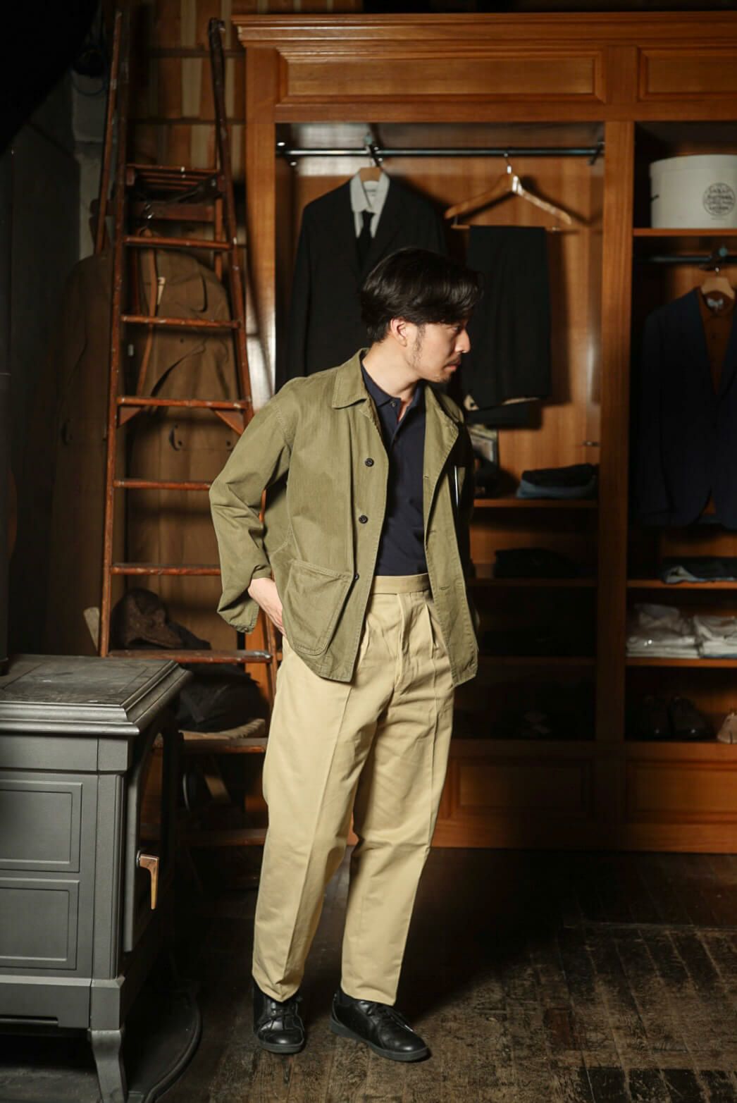 生地は、英国の名門Brisbane Moss(ブリスベン・モス)のコットンドリル(チノ)素材。その中でも季節を問わず長いシーズン着用できるミディアムウェイトの「テニソン」を採用しました。