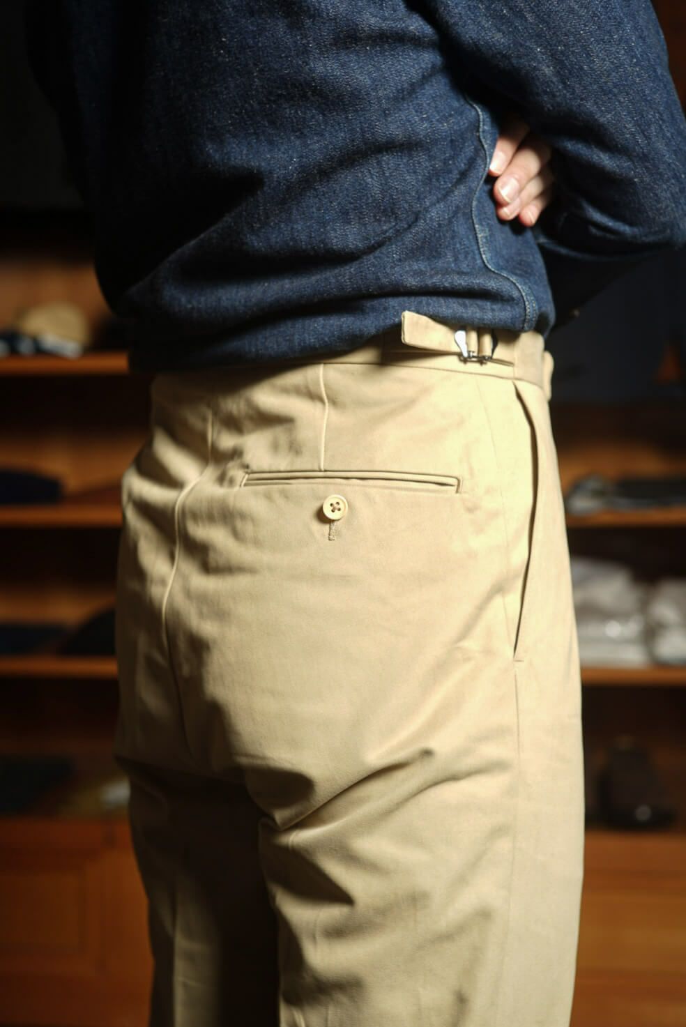 ウエストバンドはフックアンドバークロージャーの仕様で、フロントはボタンフライ、サイドにはフィット感を高めるアジャスター、そしてマーベルト(腰裏)にはブレイシーズボタンが付属するクラシックな作りです。