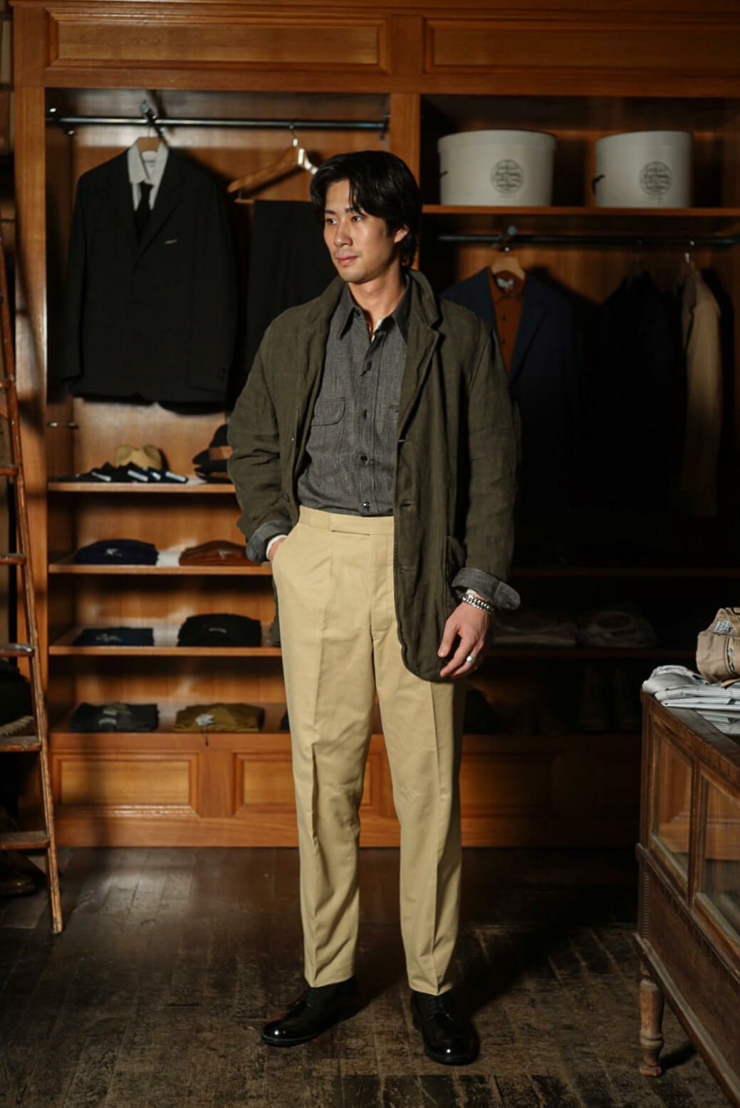 生地は、英国の名門Brisbane Moss(ブリスベン・モス)のコットンドリル(チノ)素材。その中でも季節を問わず長いシーズン着用できるミディアムウェイトの「テニソン」を採用しました。