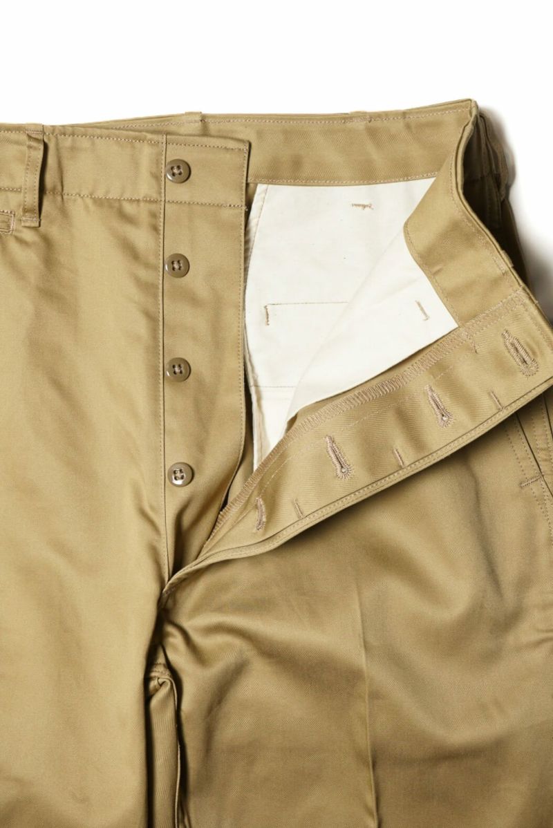 シルエットは1960年代、ディテールは1940年代にアメリカ軍に支給されていたチノトラウザースがベースとなったシルエットが綺麗な一本。高密度でコシがあり、光沢感のある上質なオリジナルチノクロスを使用。フロントはボタンフライ。
