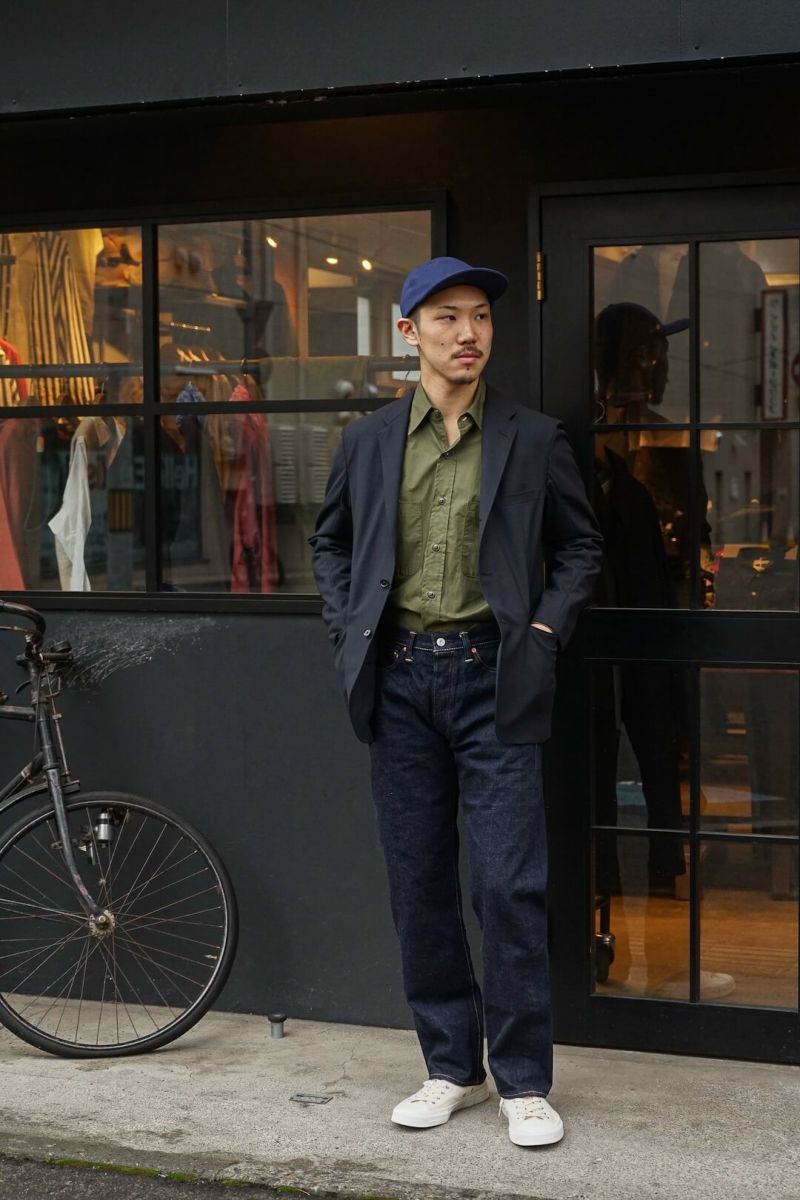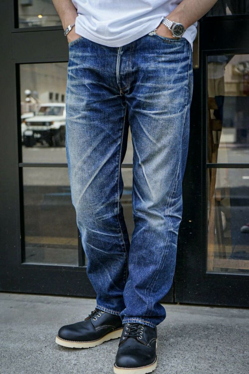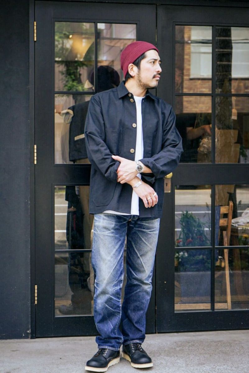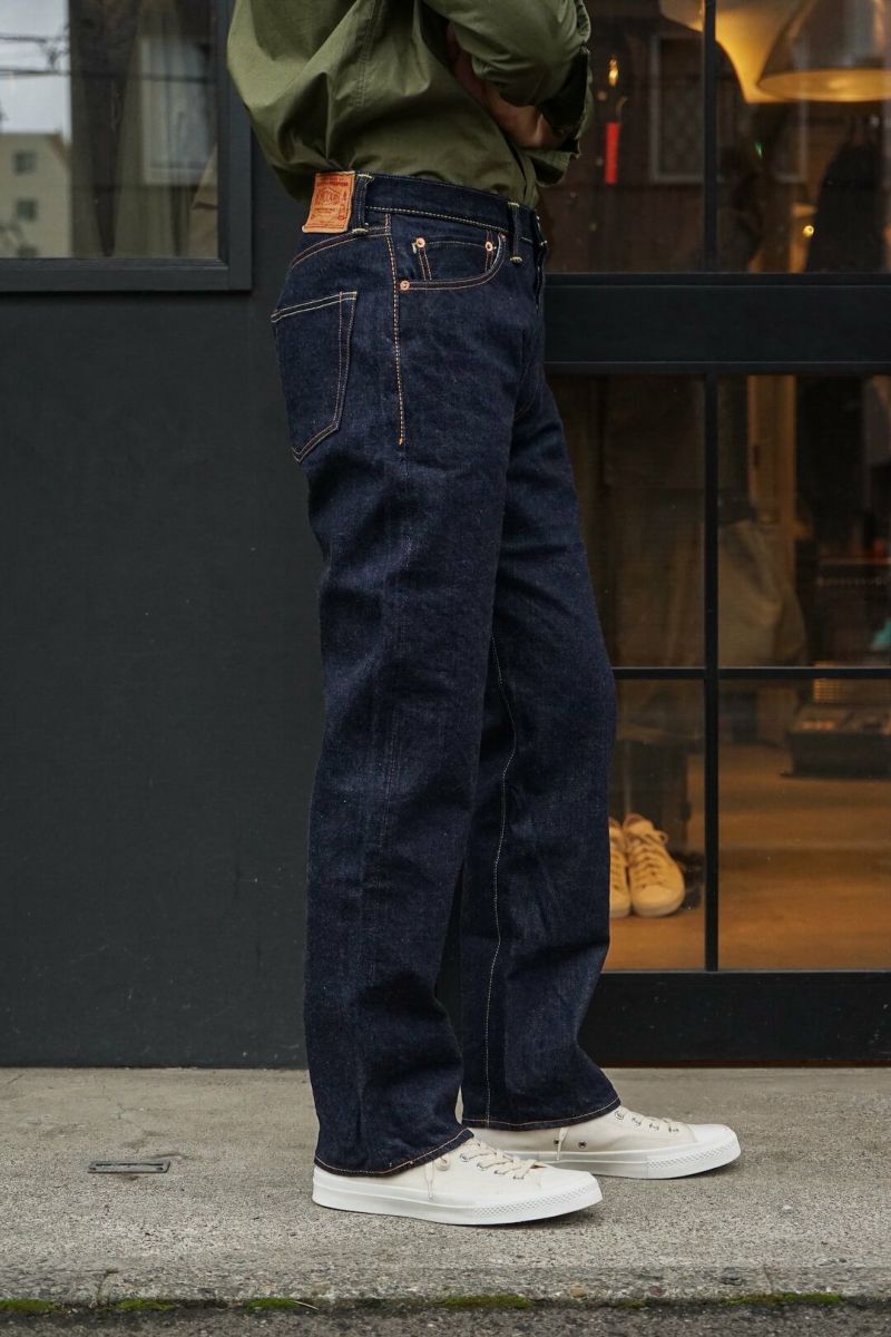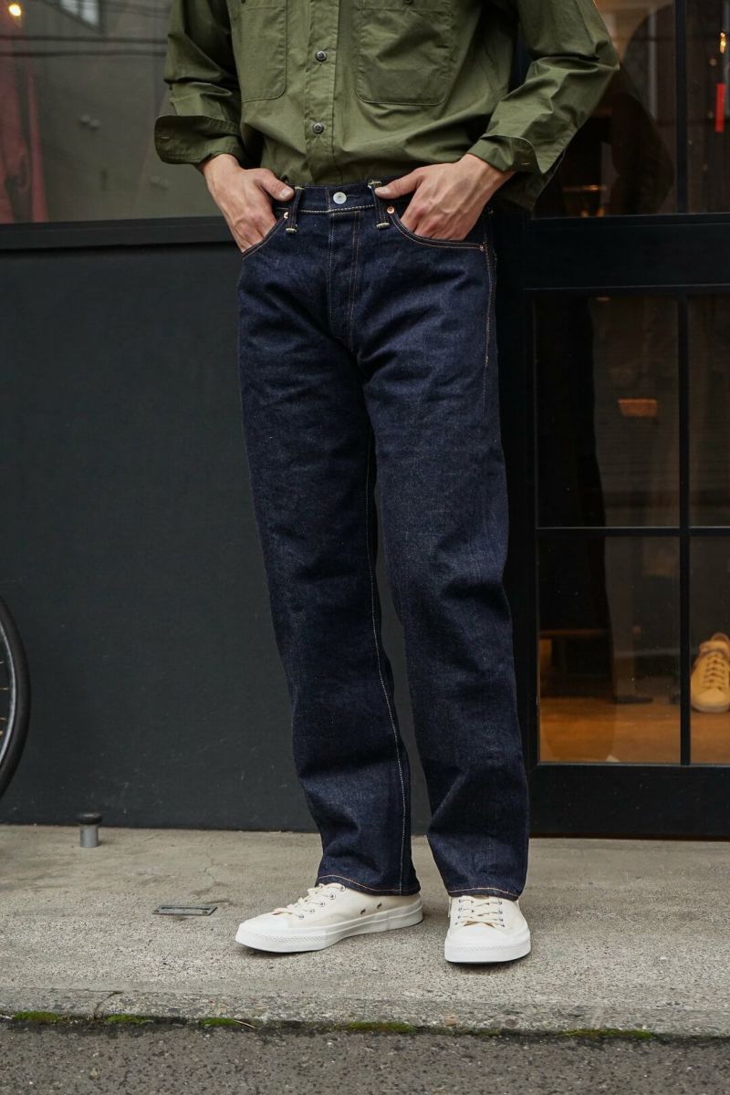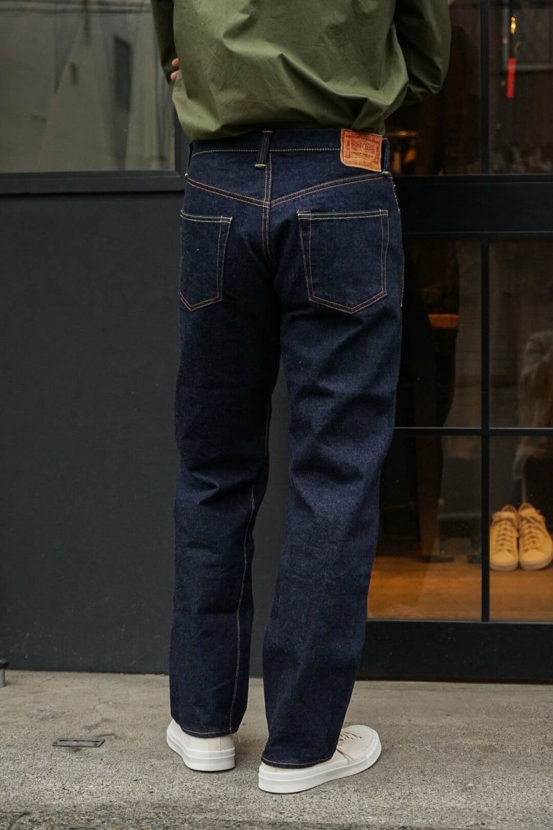 原綿の産地や配合、撚糸等紡績の部分からこだわり、ピュアインディゴで限界まで濃色に染色。旧式のBONCOURA特別仕様力織機によ織り上げられたBONCOURAオリジナルデニム生地を使用しています。ステッチはオール綿糸縫製によるもの。XXは太めのストレートシルエットで武骨な雰囲気。Vステッチや隠しリベット、打ち抜きリベットなどヴィンテージを彷彿とさせるディテールにもこだわりました。