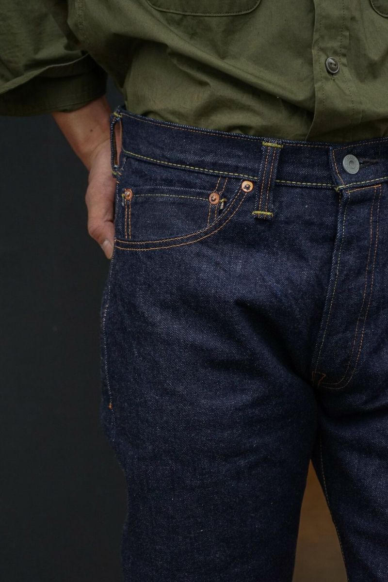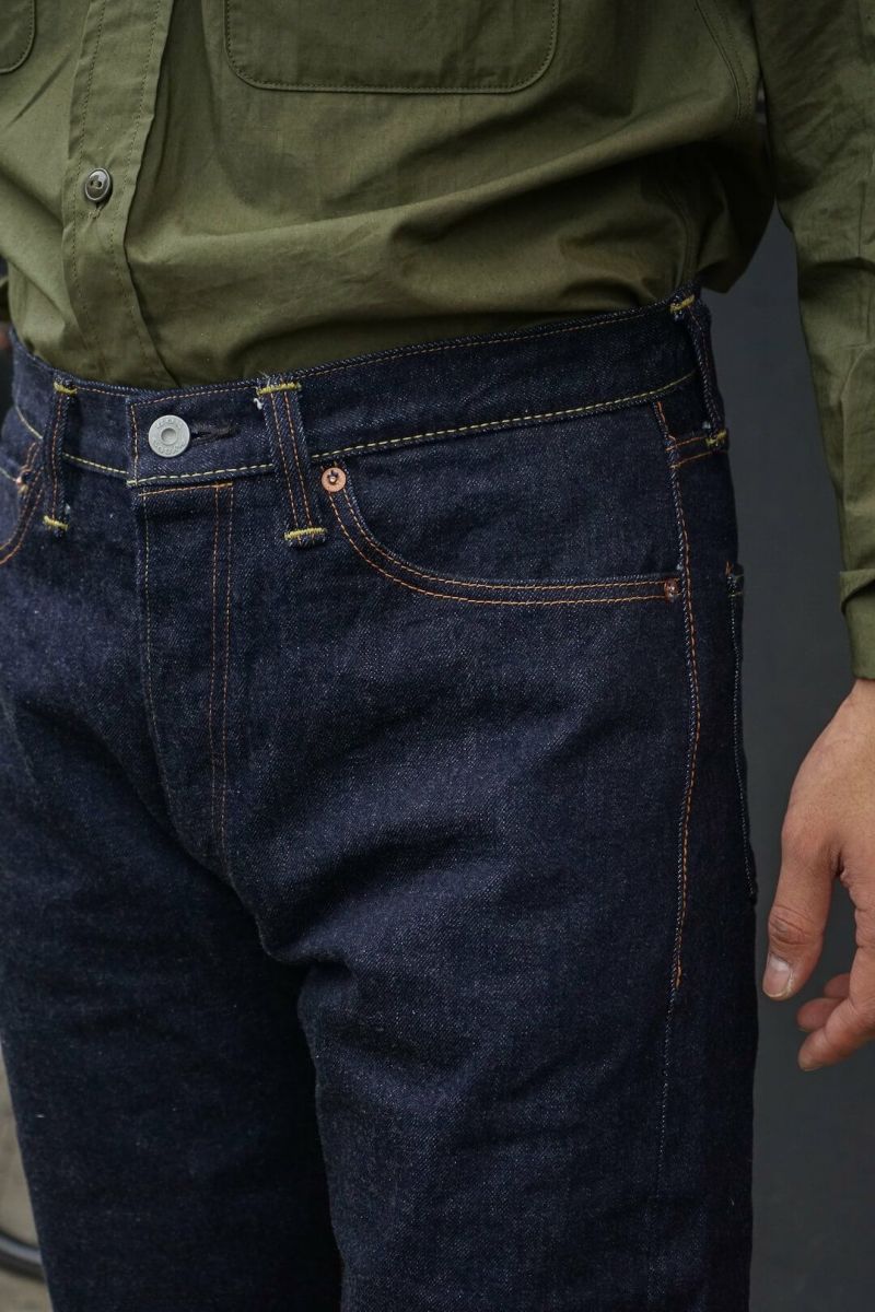 原綿の産地や配合、撚糸等紡績の部分からこだわり、ピュアインディゴで限界まで濃色に染色。旧式のBONCOURA特別仕様力織機によ織り上げられたBONCOURAオリジナルデニム生地を使用しています。ステッチはオール綿糸縫製によるもの。XXは太めのストレートシルエットで武骨な雰囲気。Vステッチや隠しリベット、打ち抜きリベットなどヴィンテージを彷彿とさせるディテールにもこだわりました。