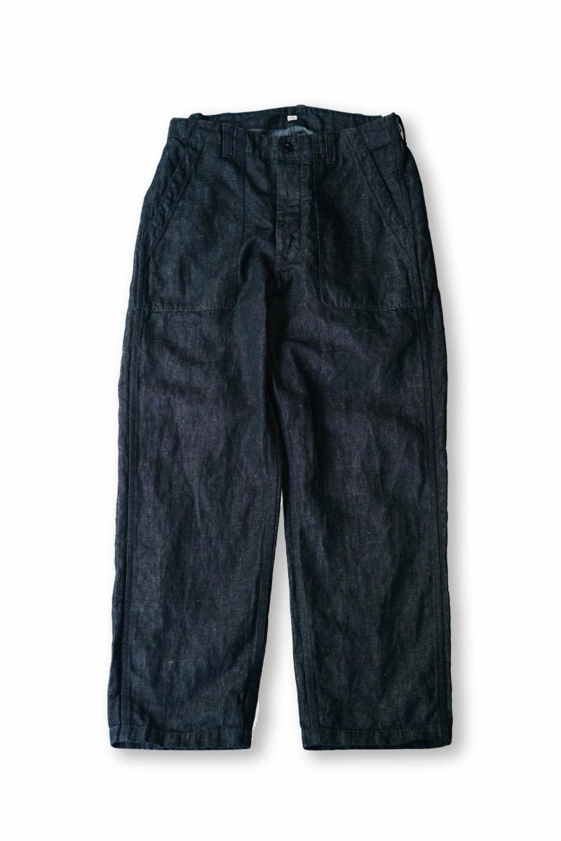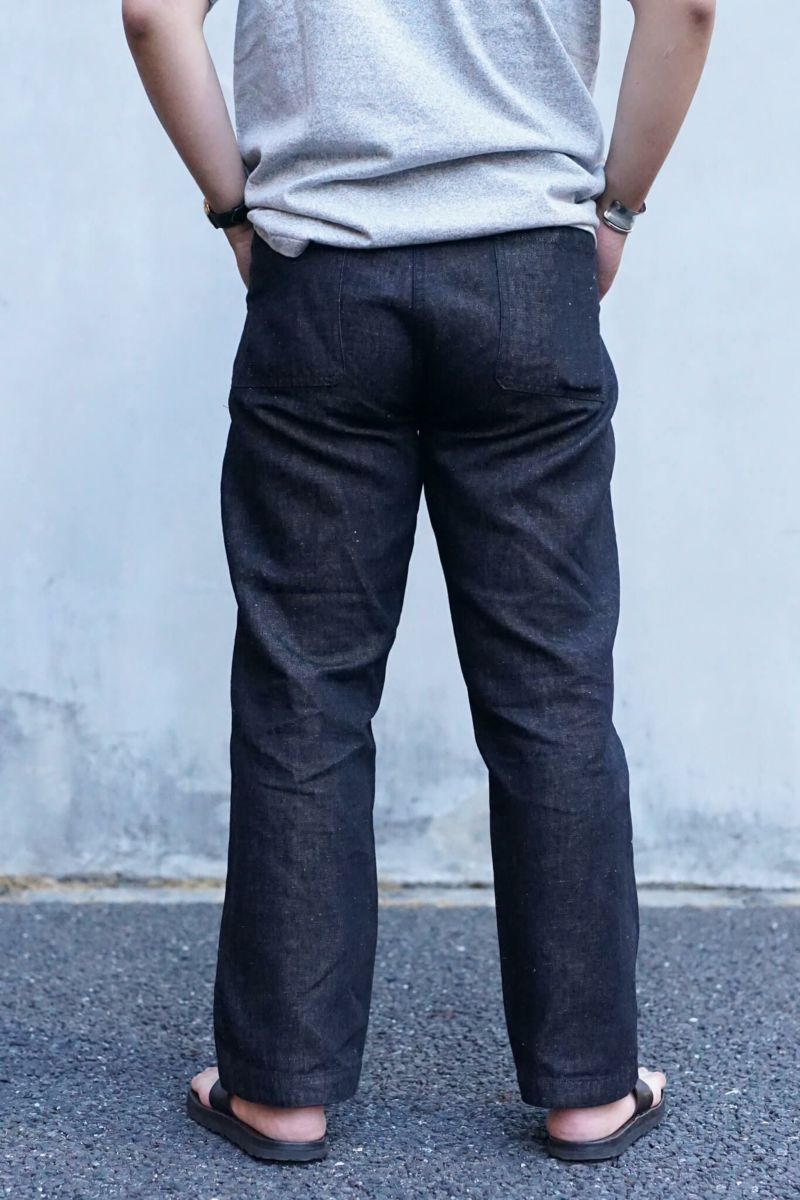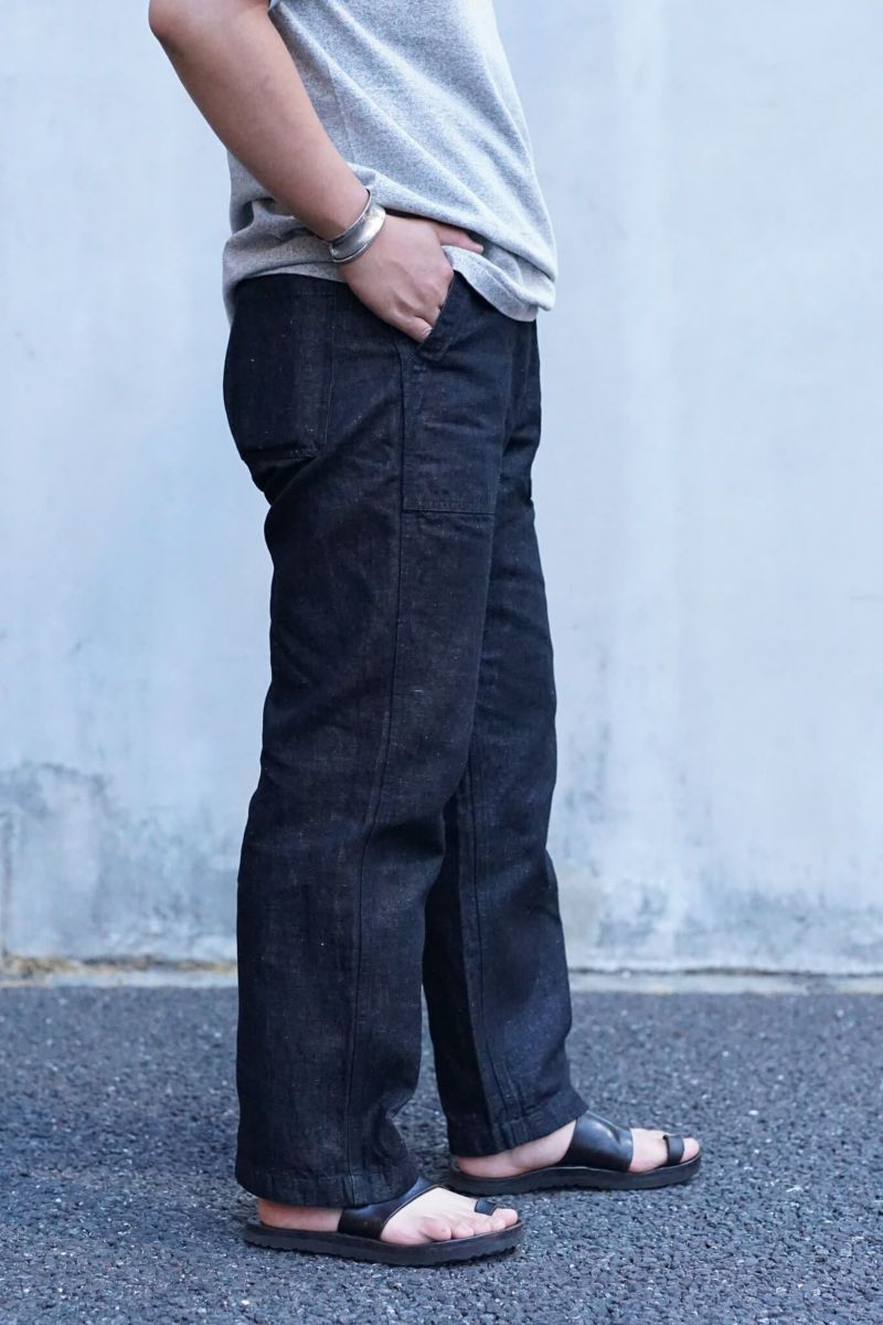 生地は、縦糸にコットン100%のロープ染色糸、緯糸にヘンプ100%を打ち込んだものを使用。緯糸にヘンプを打ち込むという非常にリスクの高い作業を経て織られた特別な生地は、ヴィンテージのワークパンツやカバーオールに近い生地感と雰囲気があります。