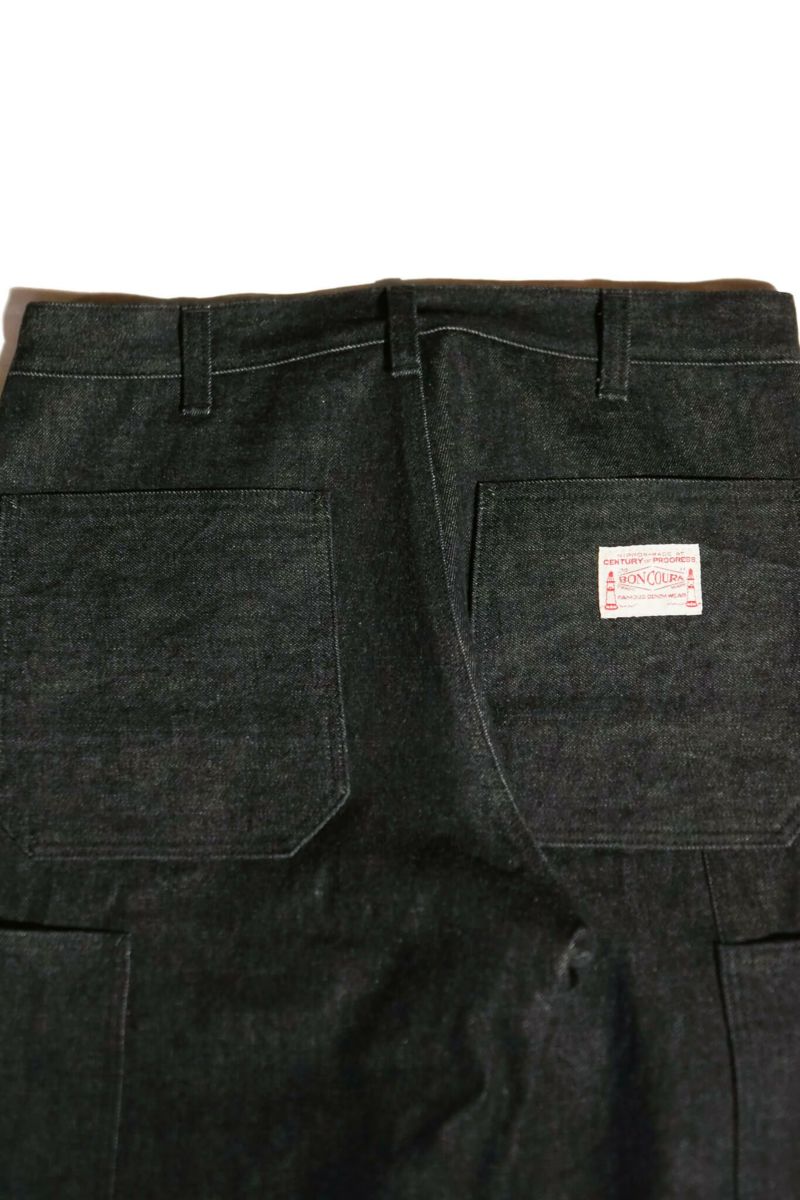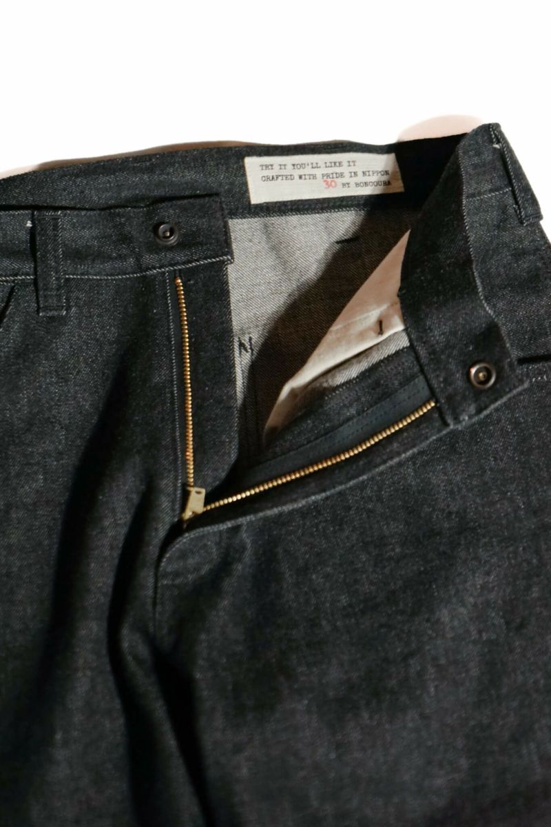 深めのハンドポケットや少し浅めのコインポケット、左右で大きさを変えたサイドポケットなどこだわりのディテールが散りばめまられています。フロントトップにはオリジナルのスナップボタンやジップが付くほか、バックのパッチポケット右側にはBONCOURAネームが入ります。