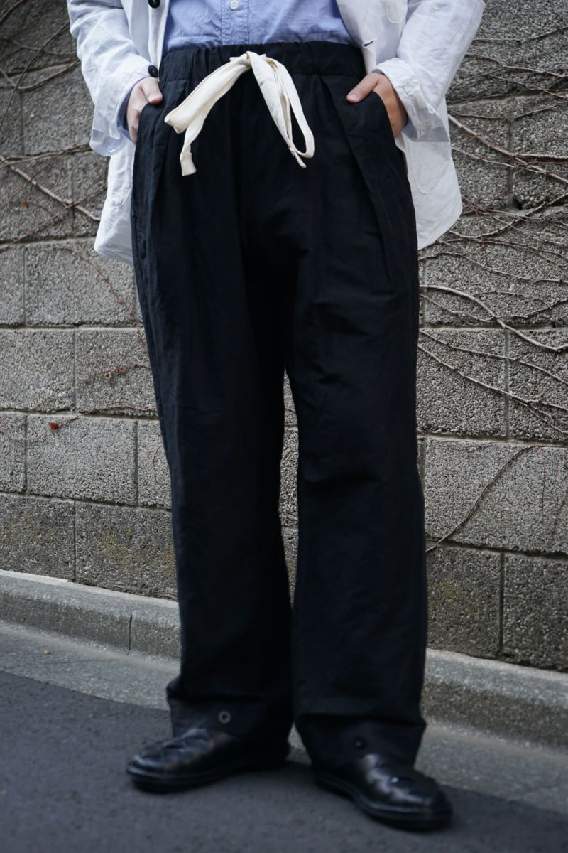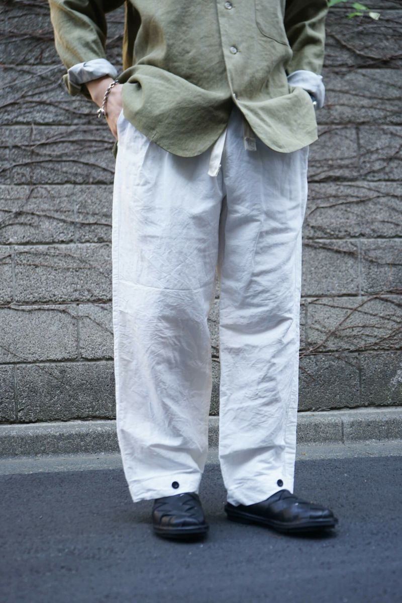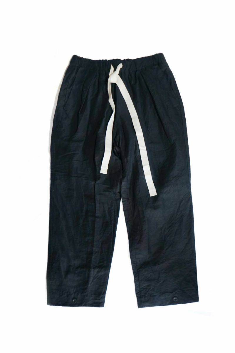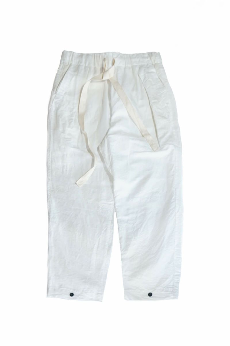 膝下から緩やかにテーパードになっている、ワイドテーパードシルエットです。ウエストはゴムと紐がになっているイージーパンツの仕様。長めのでヘリンボーンになっている紐もポイント。裾にはボタンが付いているので、シルエットに変化を持たせることもできます。 素材はヘンプとコットンを使用。春夏らしい軽さと爽やかさを感じられる一着です。