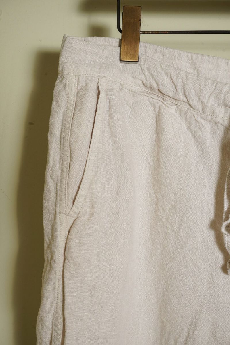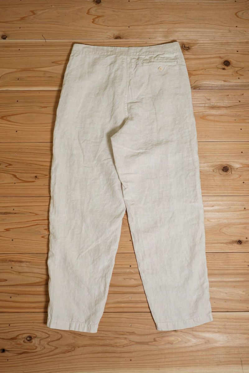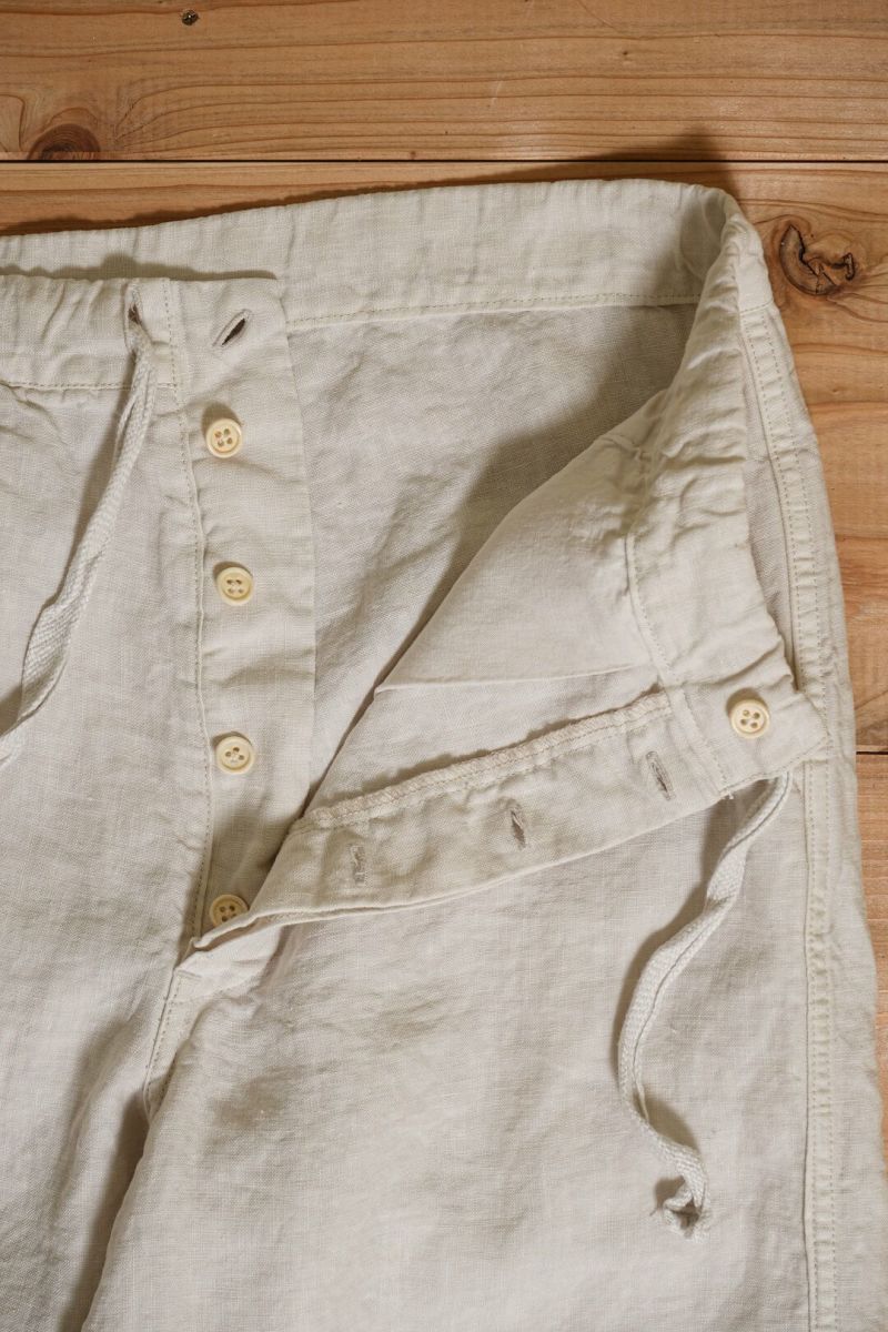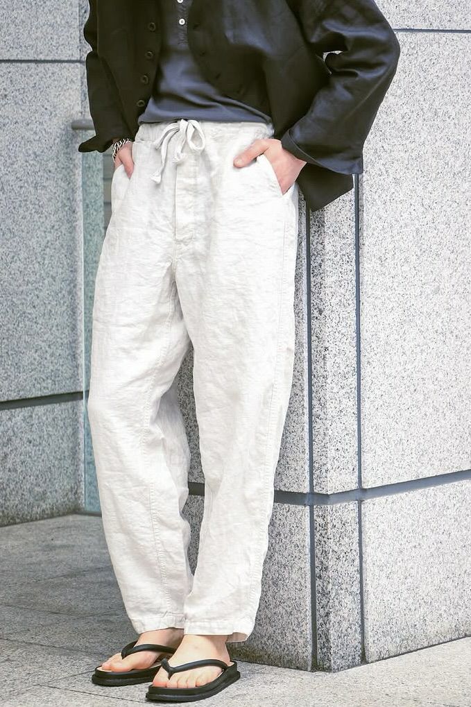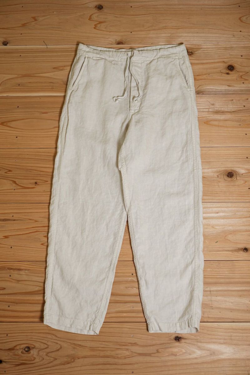 長い年月を経て変化したリネン生地の色合い、風合いを忠実に再現することに着目した「Discoloration = 変色」シリーズのイージーワークパンツ。