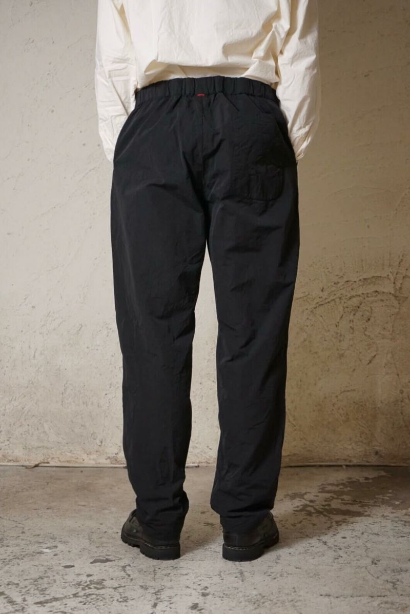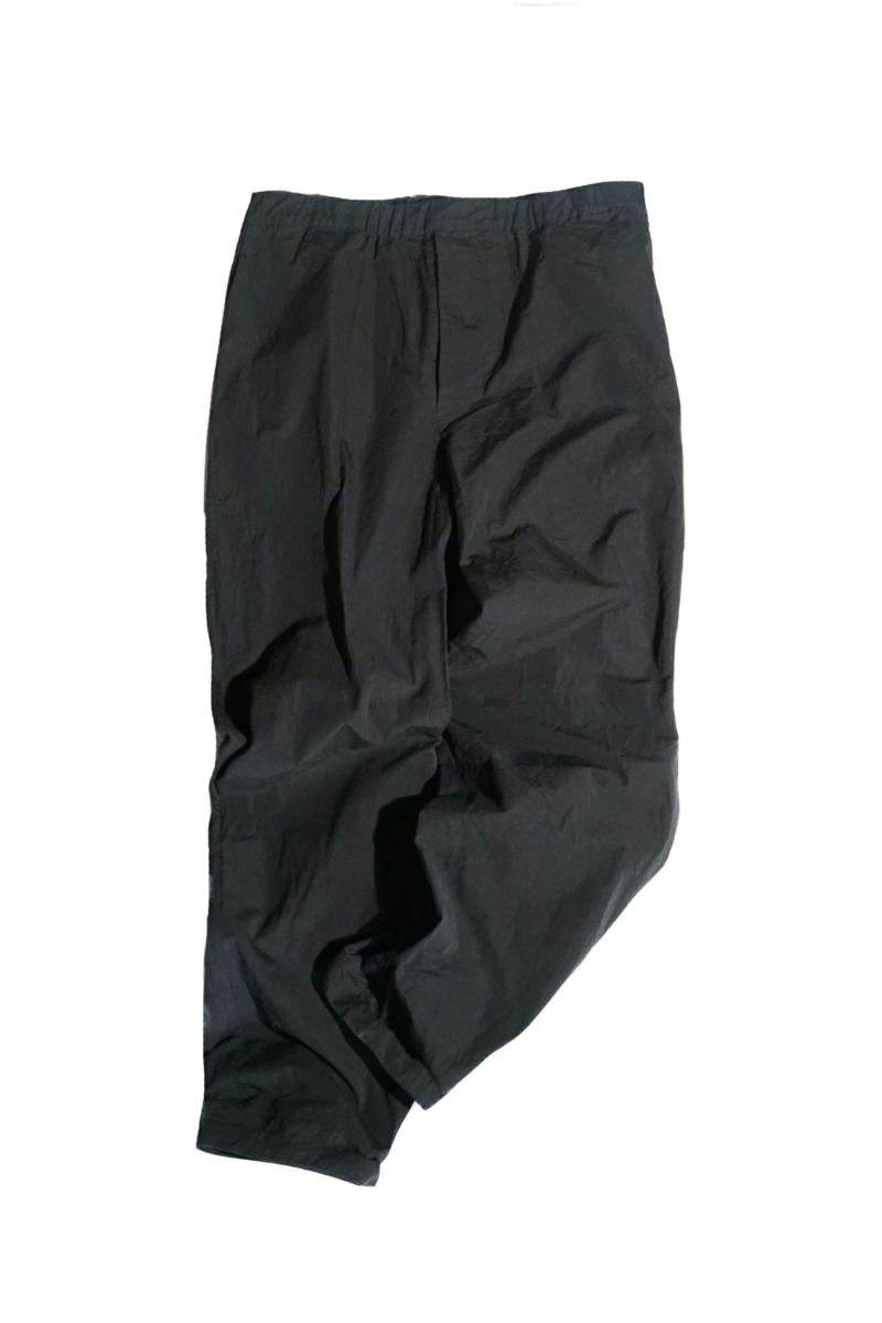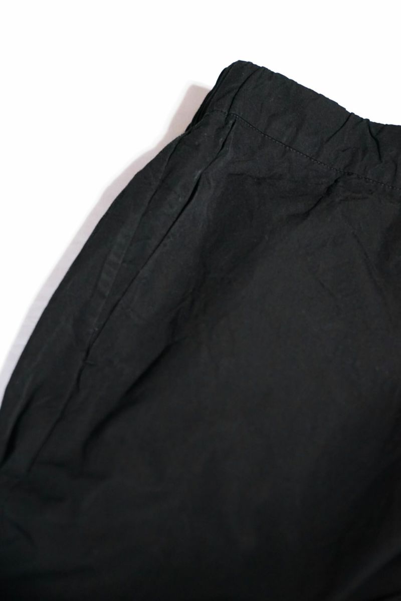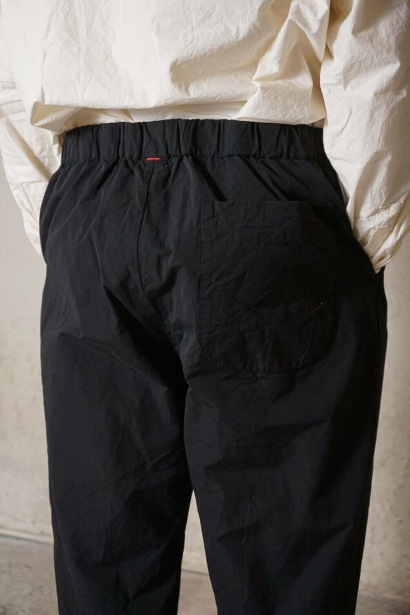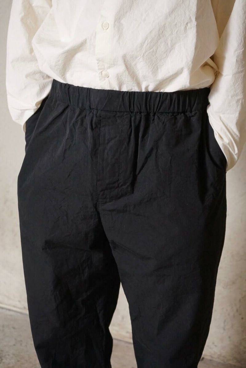 ブランドを象徴する生地であるペーパーコットンを使用したイージーパンツ。ゆとりのある腰回りに対して細めの裾幅が特徴的なシルエットを生み出しています。軽くてハリのある質感とウォッシュ仕上げによるシワ感が特徴です。リラックス感がありながらも洗練された雰囲気を醸し出す一本。