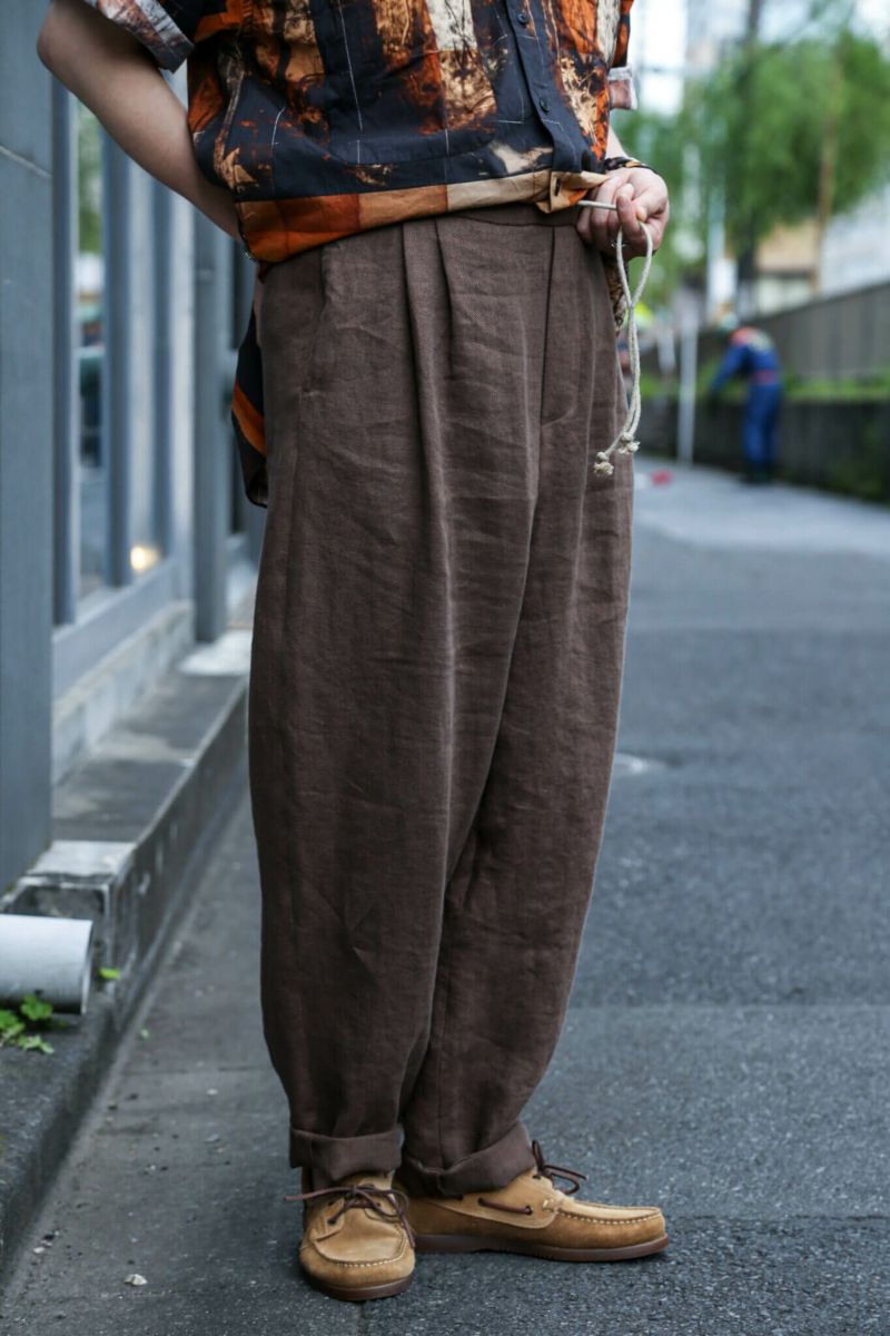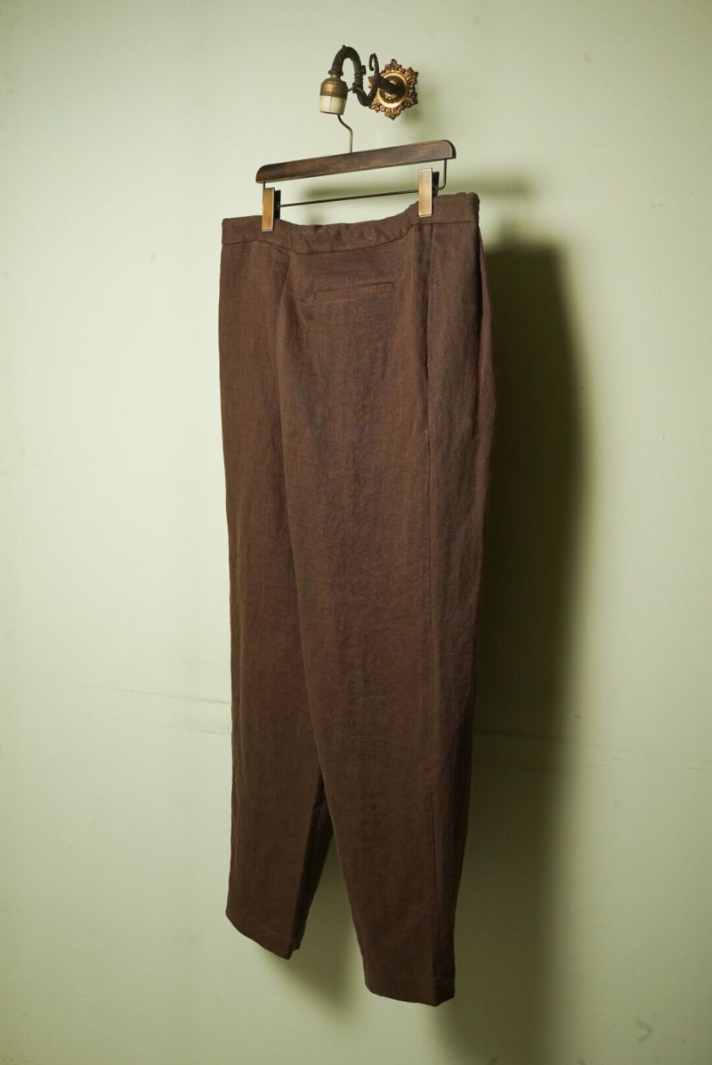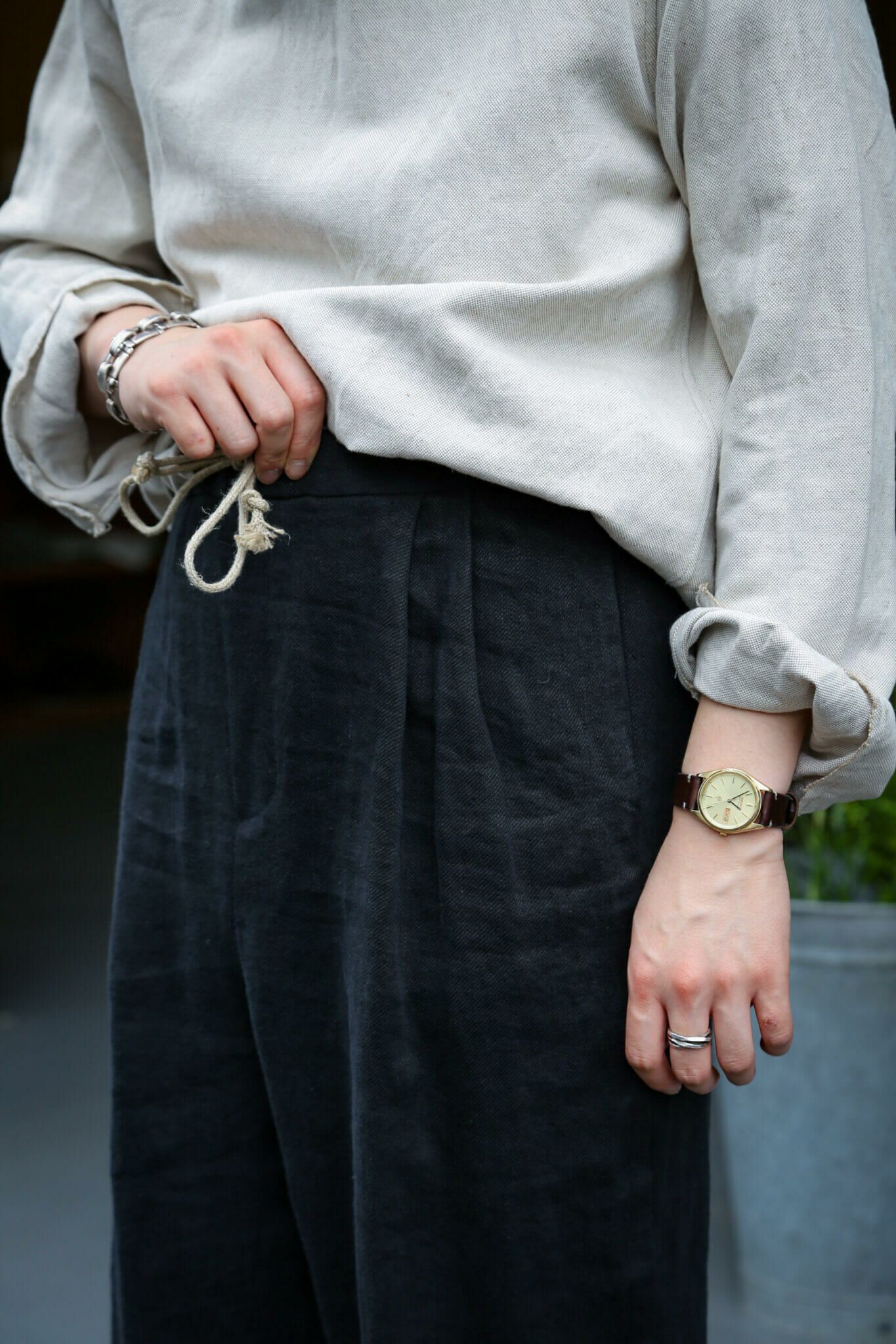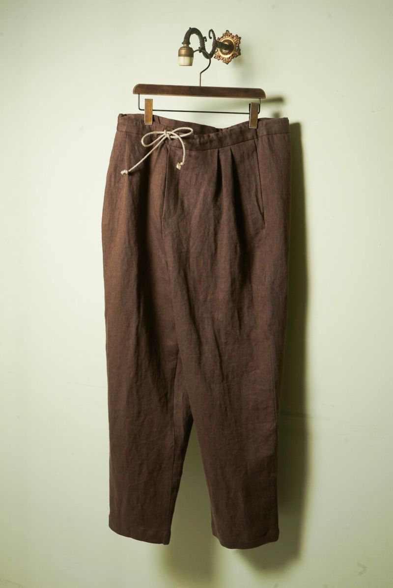FRANK LEDER(フランクリーダー) "Bernburg / Saale(ベルンブルク / ザーレ)" SPRING / SUMMER このコレクションは、LOOK BOOK を撮影した町の名前にちなんで名づけました。Bernburg/Saale ベルンプルク/ザーレ。ザーレとは、この町を流れる川のことで、その名の通り、ルネッサンス時代の城であるBurg(ブルク)はありますが、ありがたいことに、改装業者の熱心な手はあまり加えられておらず佇まいがあります。1950年代のような雰囲気のドイツの小さくて面白い町を旅する男の物語。父が健業の宇生だった頃のことを思い浮かべ、お金はなくも、過去と現在の健物の歴史と意味を学びたいと熱望し、叔父から借りた自転車と、旅の計画を立てるための道路地図、空腹に耐えるための釣りを持ち、参考にするための写真を撮りながら旅をする物語です。このように学生時代に旅をするというコンセプトは、特に戦後の1950年代に流行したものです。人間が心と知識を広げるための旅です。 旧式の織機で織り上げた風合いの良いリネンの生地を使用したイージーパンツ。 <素材> 表地 : 100% LINEN ※ 生地に多少のツレやネップがある場合がございます。 裏地 : 100% COTTON コード : HEMP <生産国> MADE IN GERMANY 商品についてのブログはこちら FRANK LEDER / WASHED OLD LINEN 2TUCK DRAWSTRING TROUSERS PRICE : ¥86,900(税込み) 品番 : 0513011 FWL 4