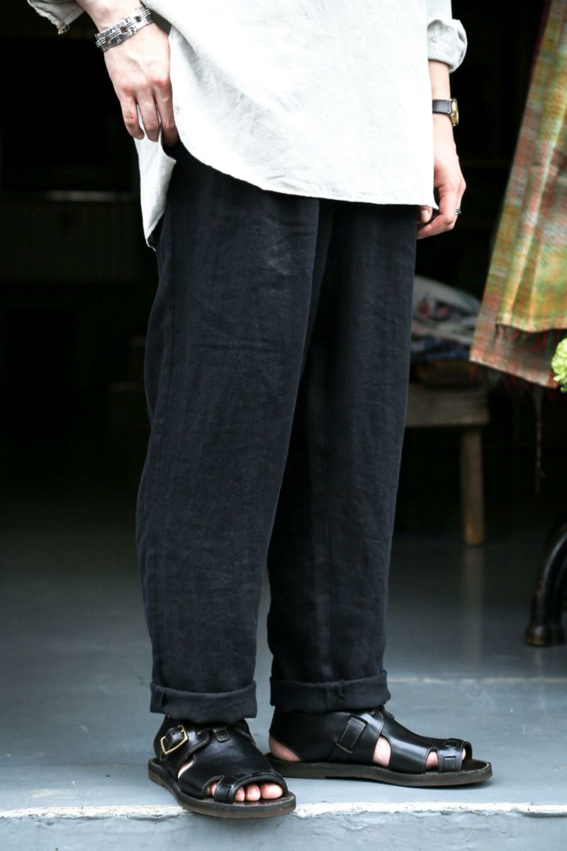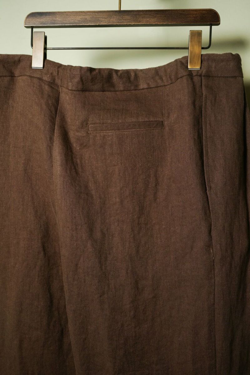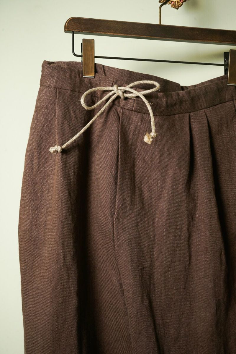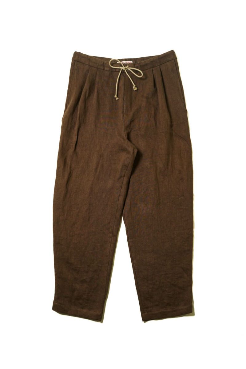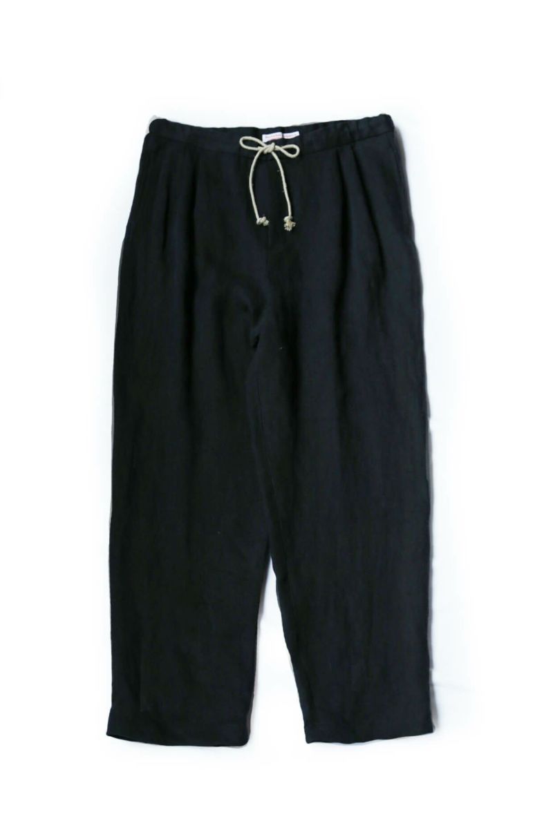 FRANK LEDER(フランクリーダー) "Bernburg / Saale(ベルンブルク / ザーレ)" SPRING / SUMMER このコレクションは、LOOK BOOK を撮影した町の名前にちなんで名づけました。Bernburg/Saale ベルンプルク/ザーレ。ザーレとは、この町を流れる川のことで、その名の通り、ルネッサンス時代の城であるBurg(ブルク)はありますが、ありがたいことに、改装業者の熱心な手はあまり加えられておらず佇まいがあります。1950年代のような雰囲気のドイツの小さくて面白い町を旅する男の物語。父が健業の宇生だった頃のことを思い浮かべ、お金はなくも、過去と現在の健物の歴史と意味を学びたいと熱望し、叔父から借りた自転車と、旅の計画を立てるための道路地図、空腹に耐えるための釣りを持ち、参考にするための写真を撮りながら旅をする物語です。このように学生時代に旅をするというコンセプトは、特に戦後の1950年代に流行したものです。人間が心と知識を広げるための旅です。 旧式の織機で織り上げた風合いの良いリネンの生地を使用したイージーパンツ。 <素材> 表地 : 100% LINEN ※ 生地に多少のツレやネップがある場合がございます。 裏地 : 100% COTTON コード : HEMP <生産国> MADE IN GERMANY 商品についてのブログはこちら FRANK LEDER / WASHED OLD LINEN 2TUCK DRAWSTRING TROUSERS PRICE : ¥86,900(税込み) 品番 : 0513011 FWL 4