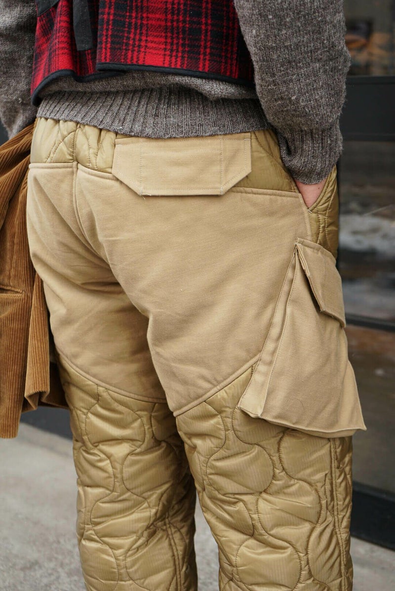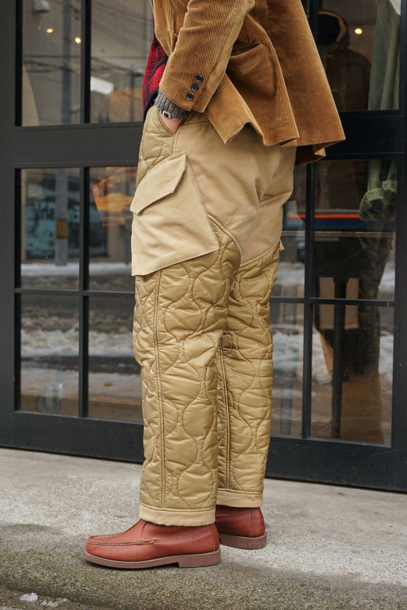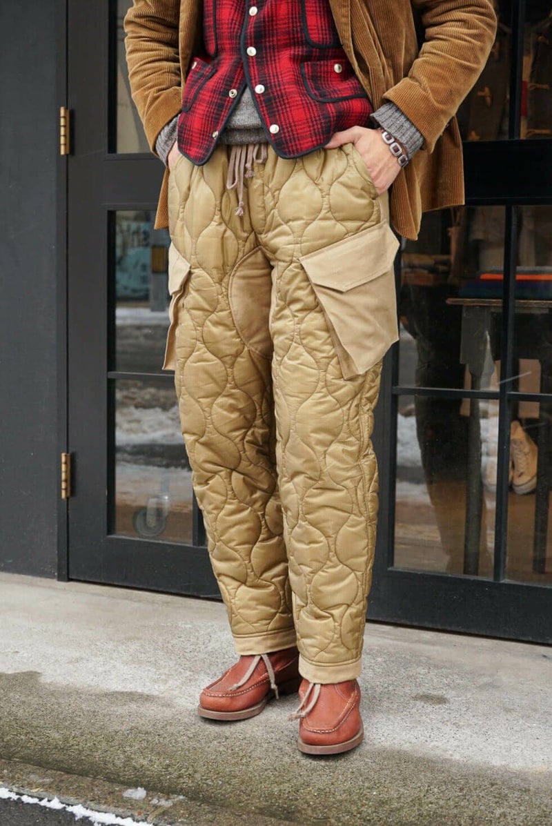 MOJITO(モヒート) 『アーネスト・ミラー・ヘミングウェイ』のライフスタイルや作品がデザインソース。ブランド名はヘミングウェイが愛したとされているモヒートに由来しています。 デザイナー山下氏が愛用されているミリタリーのキルティングライナーパンツをモチーフとした新型の中綿入りパンツ。ポケットとヒップ、裾部分には1970年代の「OG 107 Sateen Shirts」を再現されバックサテン地を使用しています。 <素材> 表地 : ナイロン 100% 裏地 : ナイロン 100% 中わた : ポリエステル 100% 別布 : コットン 100% <生産国> MADE IN JAPAN MOJITO / DUCK HUNTING PANTS PRICE : ¥61,600(税込み) 品番 : 2043-1403