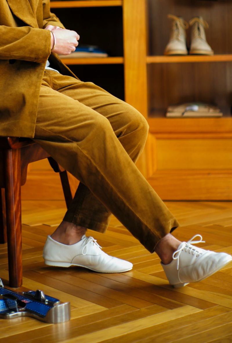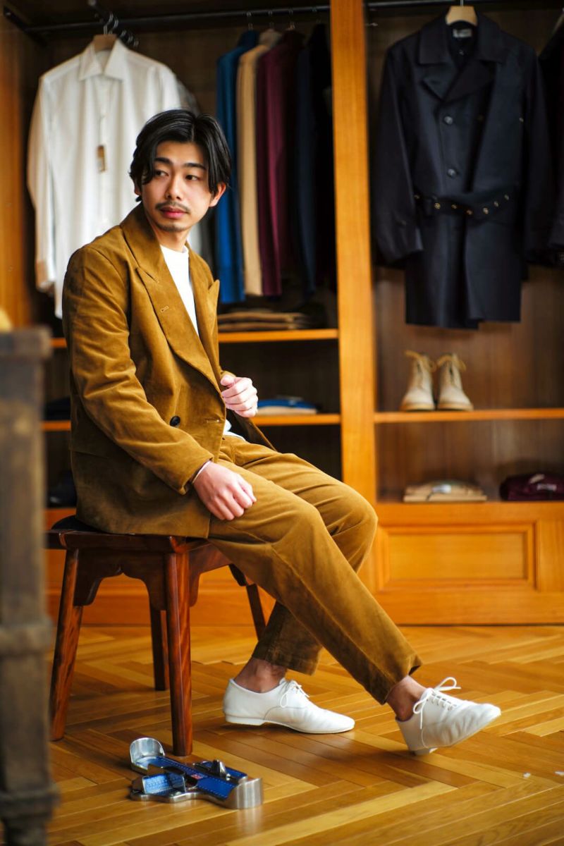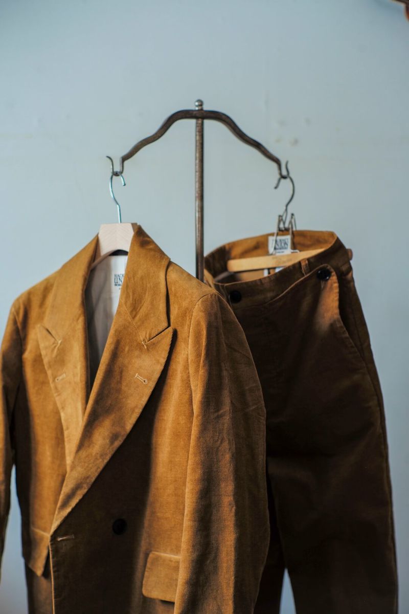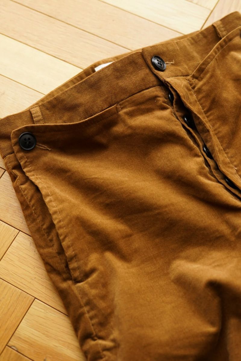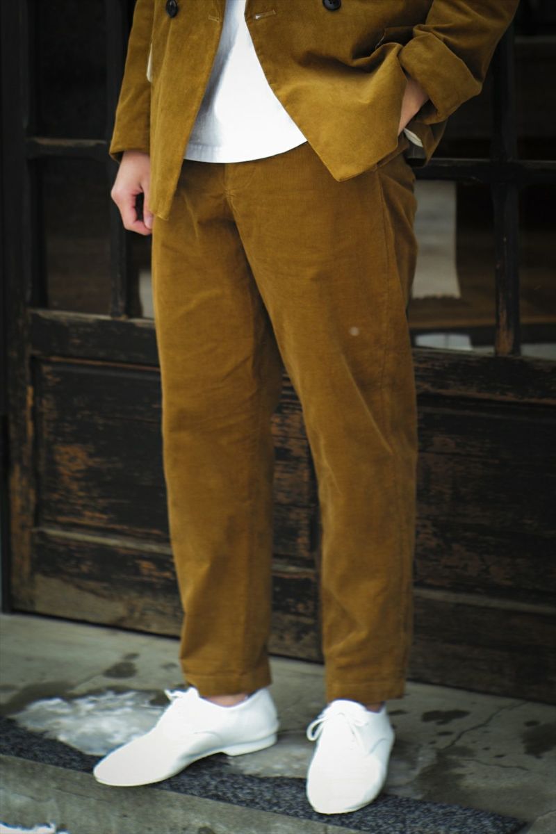 今回のコレクションは、デザイナーIggi氏が祖父から譲り受けた洋服、友人から譲り受けた1着のハンドメイドシャツからインスピレーションを受けています。ノータックの非常にすっきりとした見た目ではありながらも、適度なゆとりもあり、ストレスは感じさせません。ワタリから裾にかけて無理のないテーパードがかかっており、綺麗なシルエットを描きます。採用された生地は、サマーコーデュロイ。畝が細く、薄手でドライな肌触りで、通気性がいいのがサマーコーデュロイの特徴です。