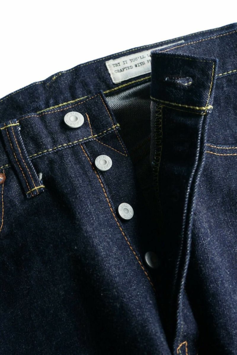 原綿の産地や配合、撚糸等紡績の部分からこだわり、ピュアインディゴで限界まで濃色に染色。旧式のBONCOURA特別仕様力織機によ織り上げられたBONCOURAオリジナルデニム生地を使用しています。ステッチはオール綿糸縫製によるもの。XXは太めのストレートシルエットで武骨な雰囲気。Vステッチや隠しリベット、打ち抜きリベットなどヴィンテージを彷彿とさせるディテールにもこだわりました。