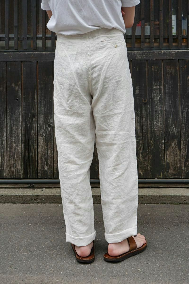 長い年月を経て変化したリネン生地の色合い、風合いを忠実に再現することに着目した「Discoloration = 変色」シリーズのイージーワークパンツ。