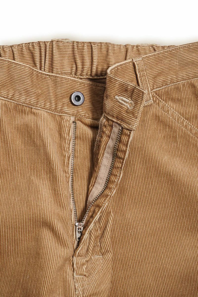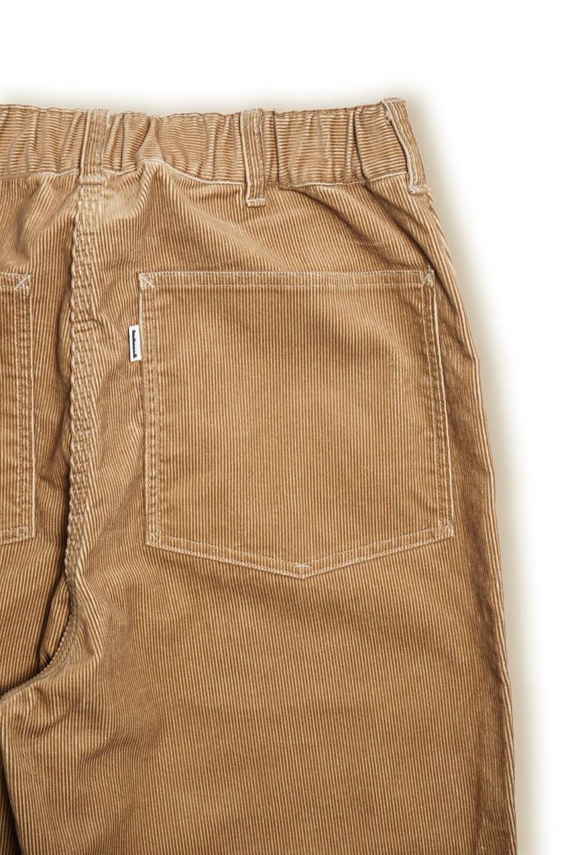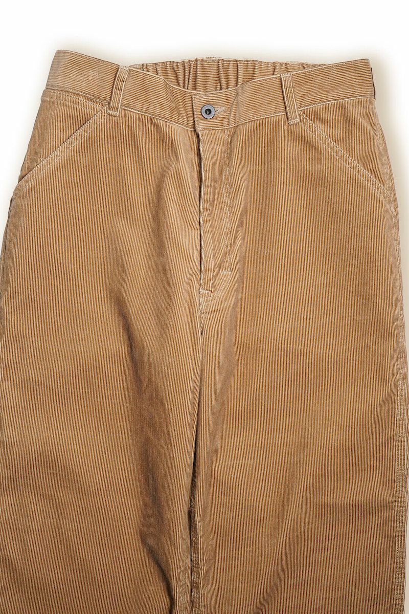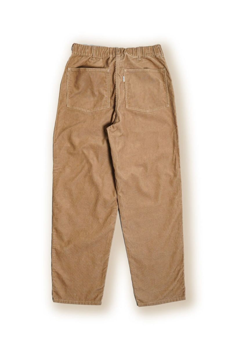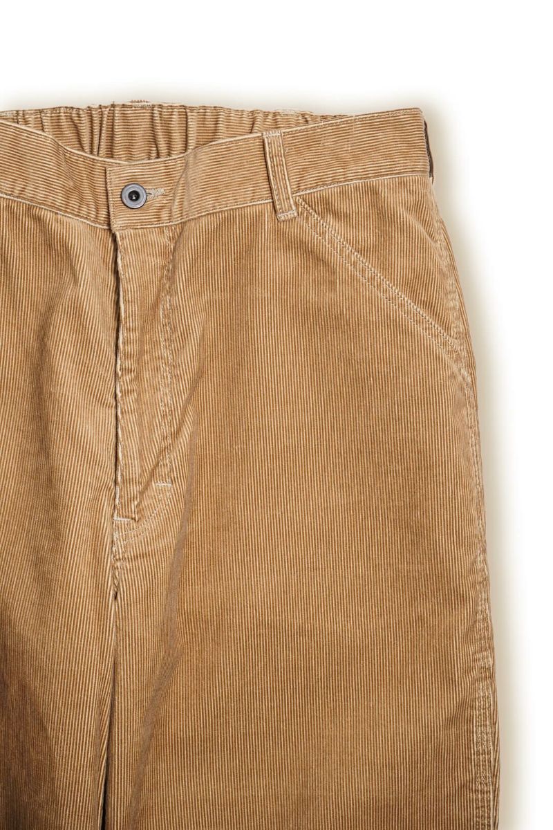 ベルトの後ろ身の部分にはゴムが入っていてコンフォータブルな使用です。すそ幅20㎝前後でややテーパードした、太くも、細くもなく様々なスタイルのトップスに合うシルエットです。生地はシーズン問わず穿きやすい厚みの14ウェルTCコーデュロイを使用しています。