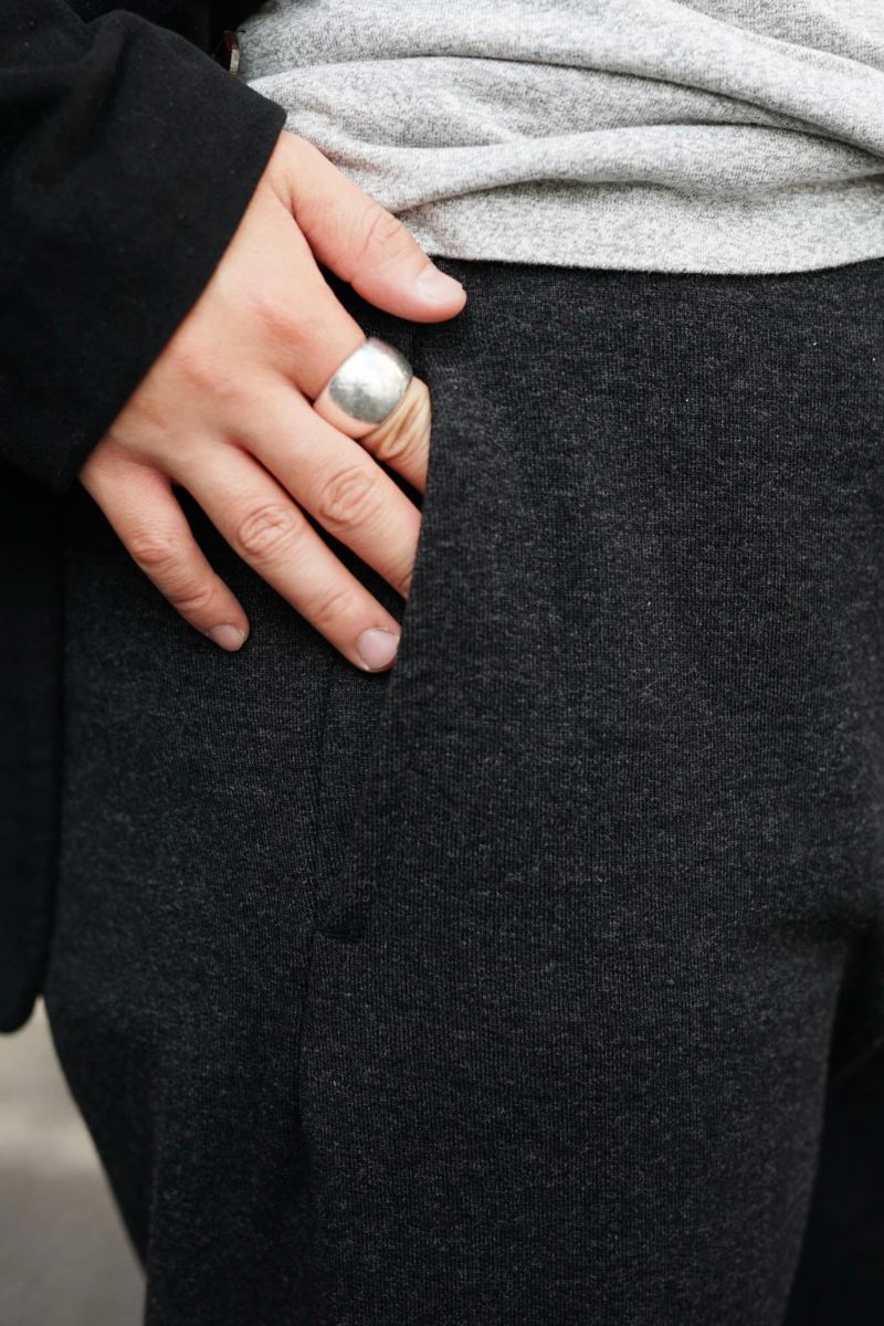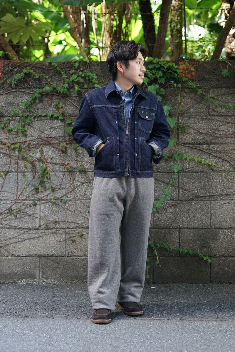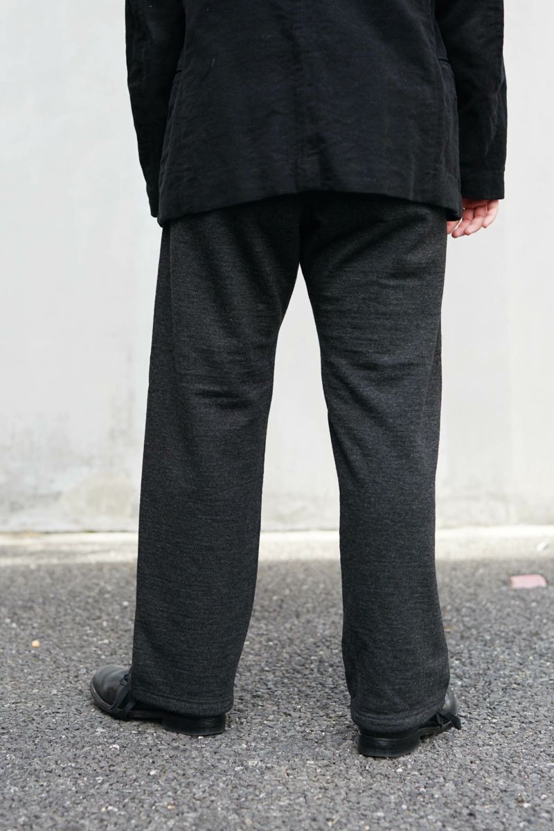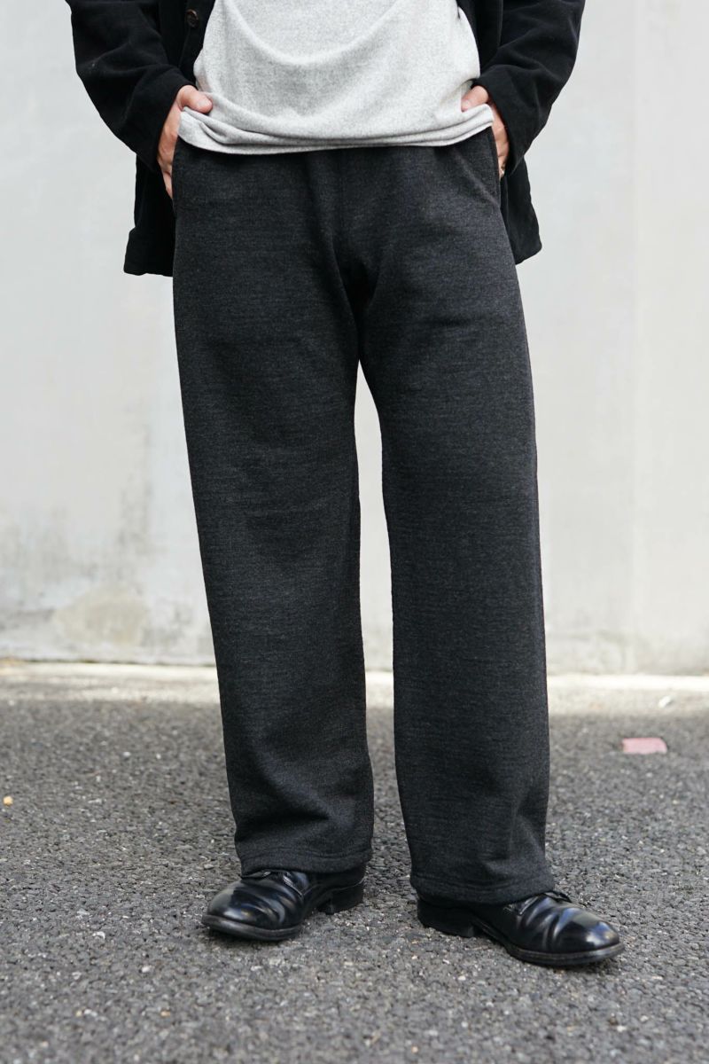ヴィンテージのトラックパンツをイメージした、股下にマチが入ったデザイン。フラットでイージーなパターンのヴィンテージのパンツとは違い、しっかりした生地の肉感を考慮し、体の動き分量を考えた前後差のあるパターンで制作させています。大きめのサイズ感のため、普段よりワンサイズダウンがおすすめです。