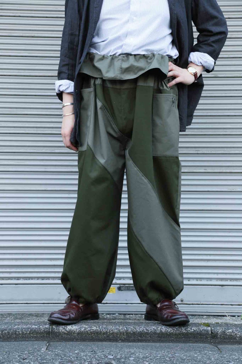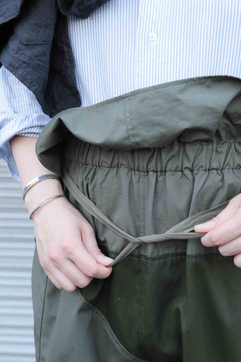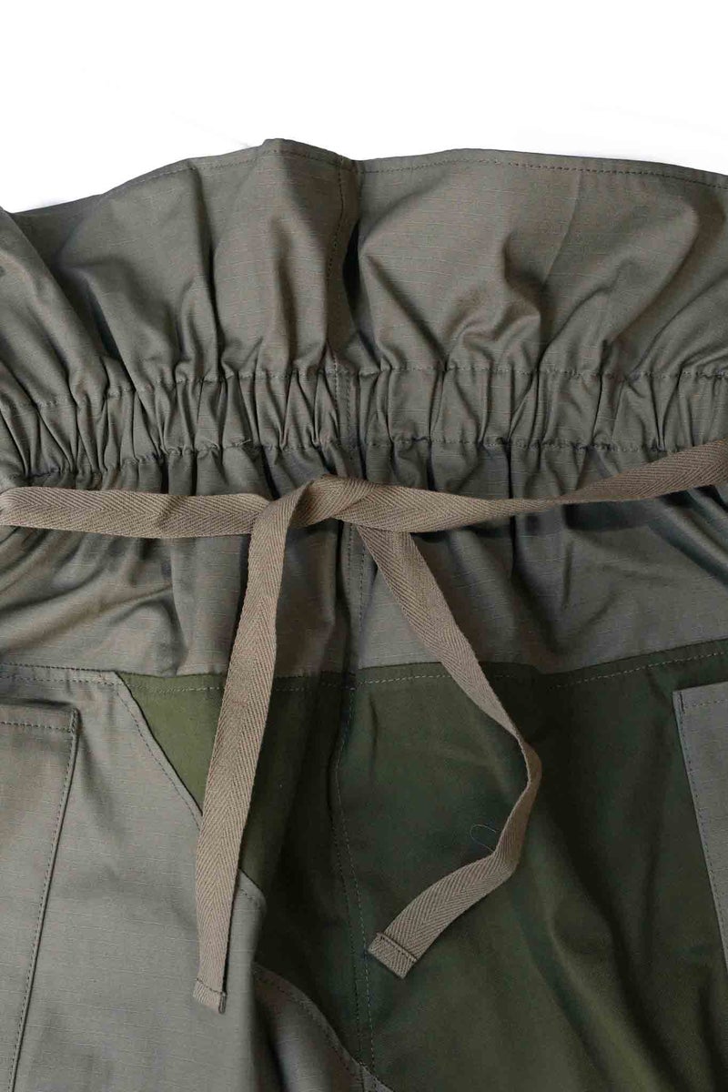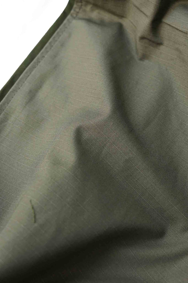 素材にはハリとコシのあるコットンを使用。リップストップ生地をベースに、同系色で切り替えた仕上がりが特徴です。