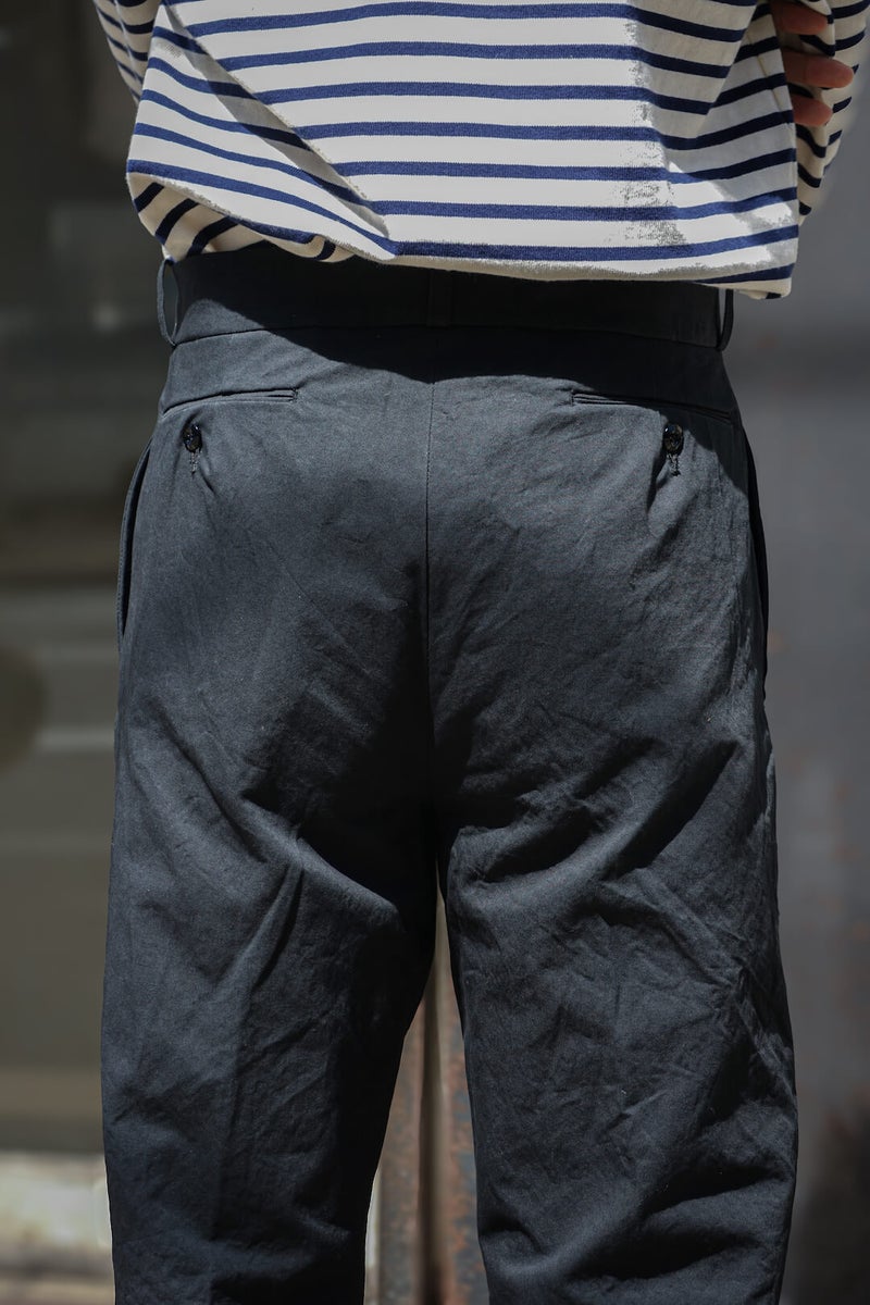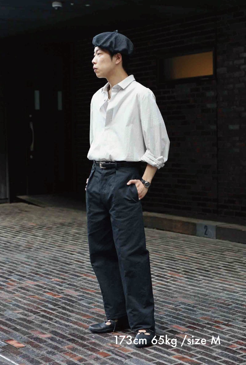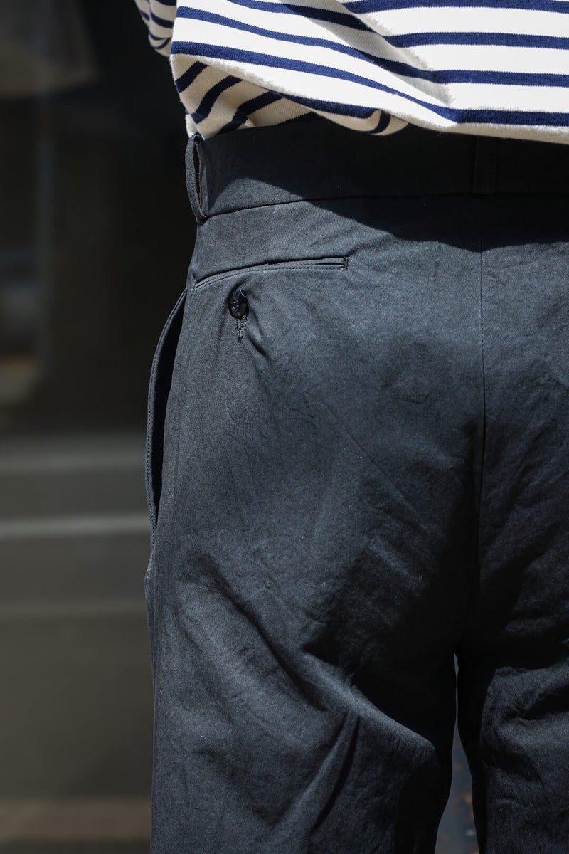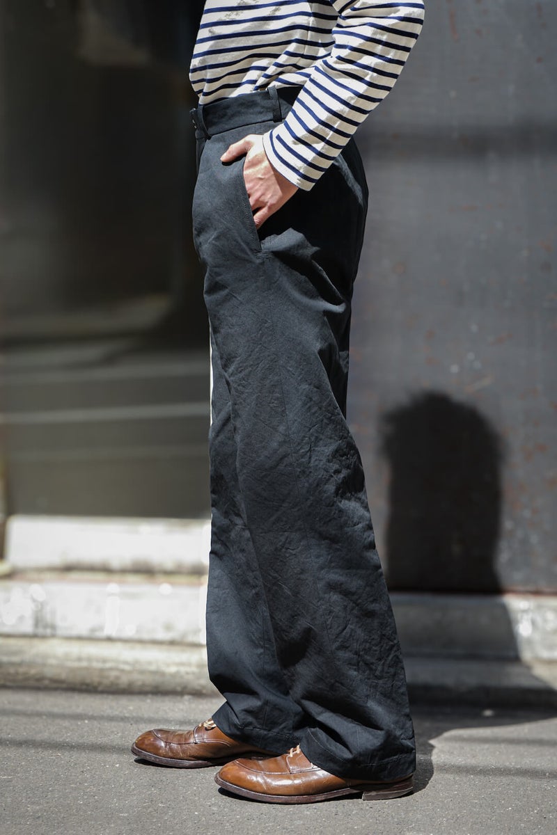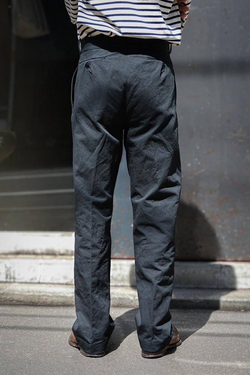 1915年にフランス軍へ支給されていたミリタリートラウザーズのフィット感、ディテールを参考に製作したトラウザーズ。ゆとりのあるフィット感でありながら、ハリ感のある生地と相まって綺麗なシルエットを描く一本です。