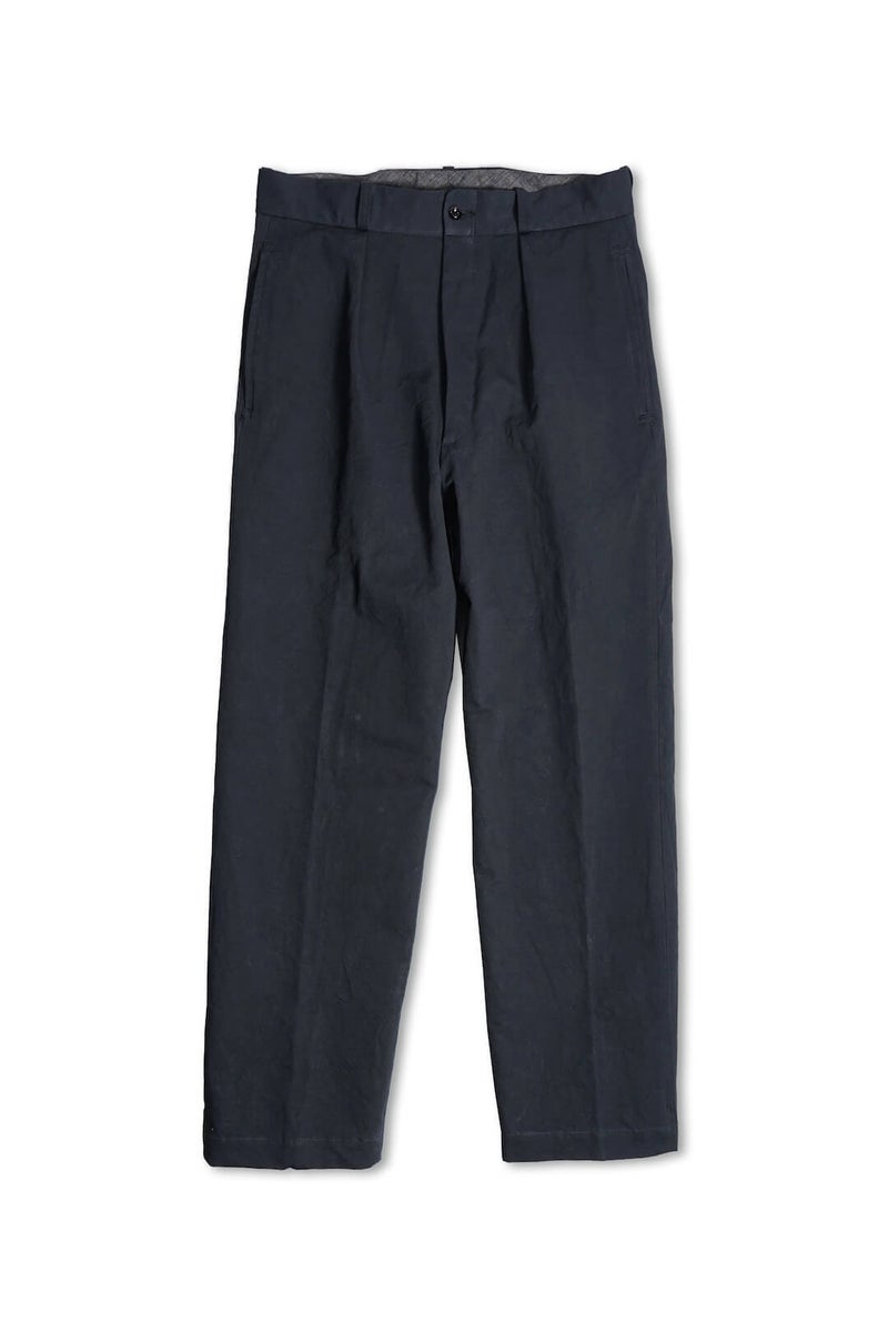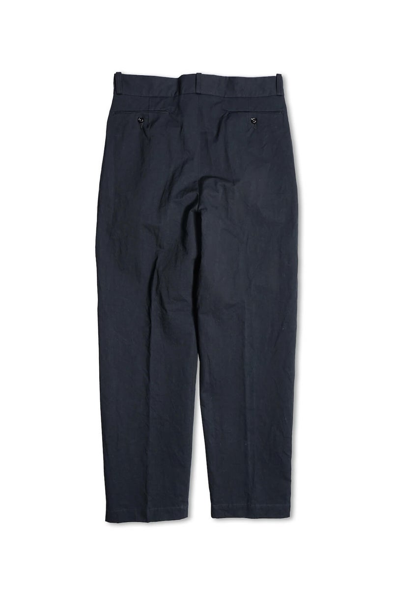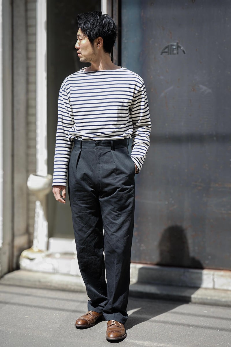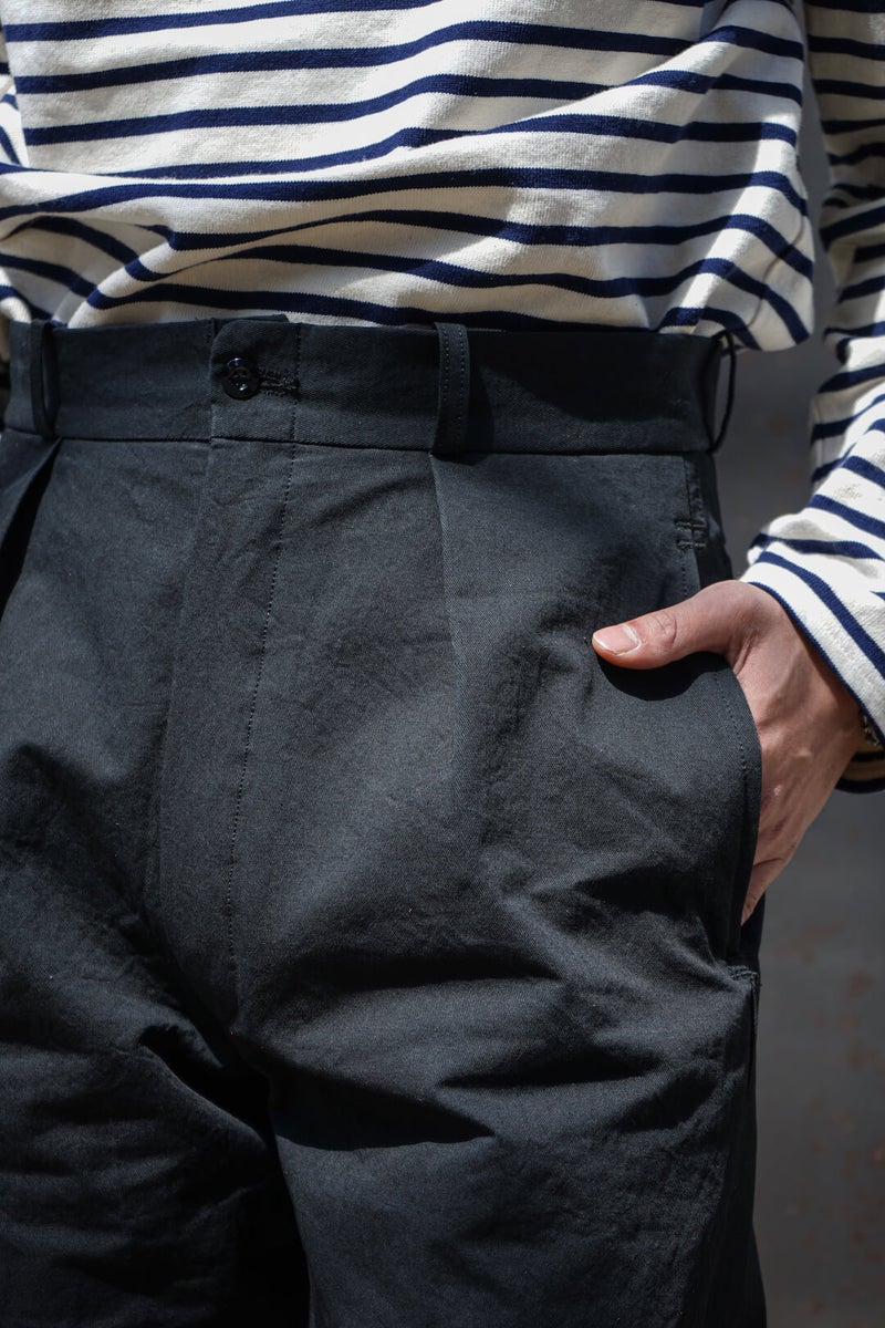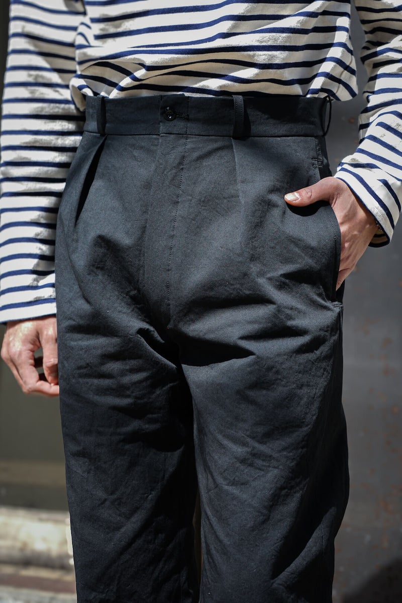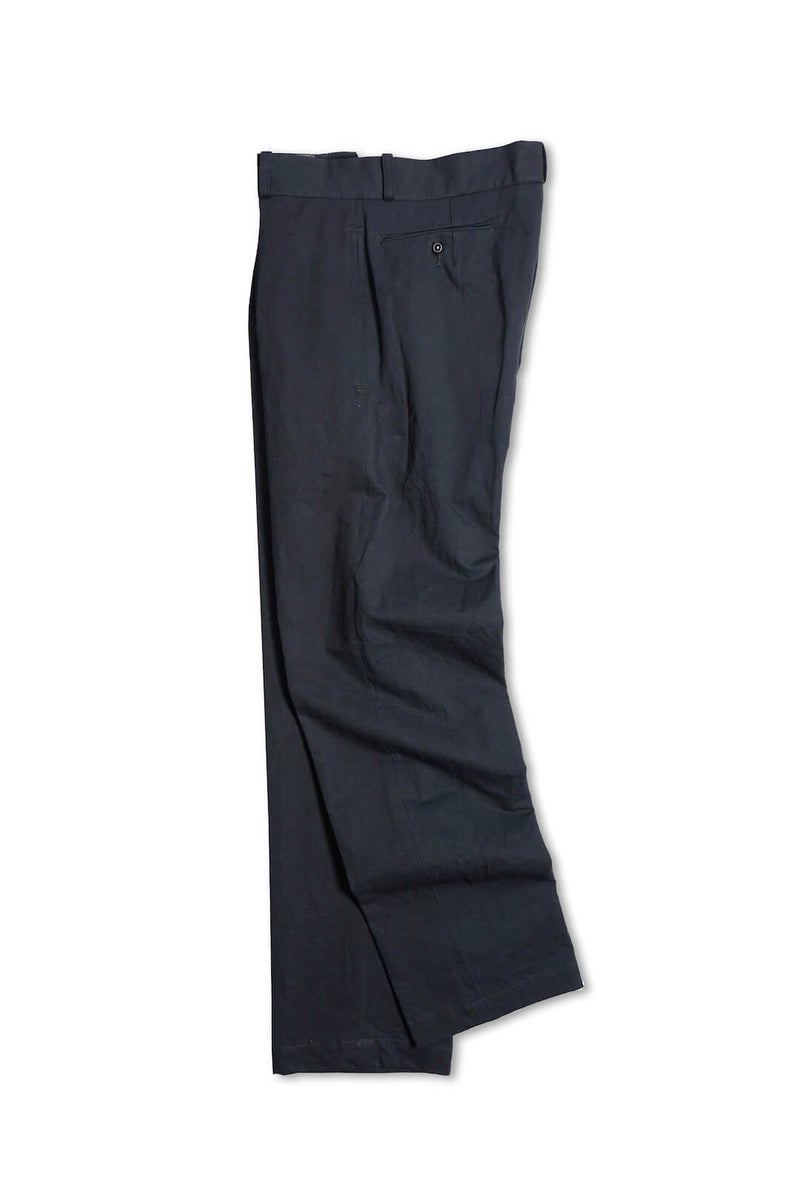 1915年にフランス軍へ支給されていたミリタリートラウザーズのフィット感、ディテールを参考に製作したトラウザーズ。ゆとりのあるフィット感でありながら、ハリ感のある生地と相まって綺麗なシルエットを描く一本です。