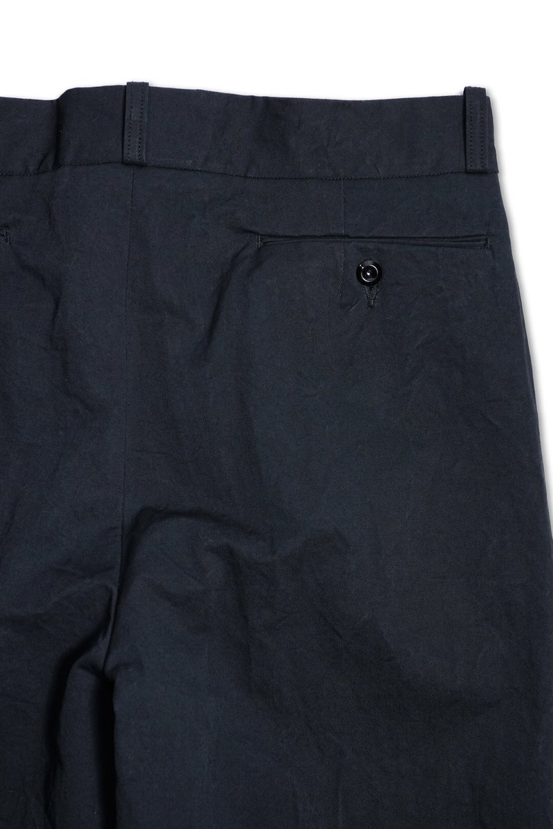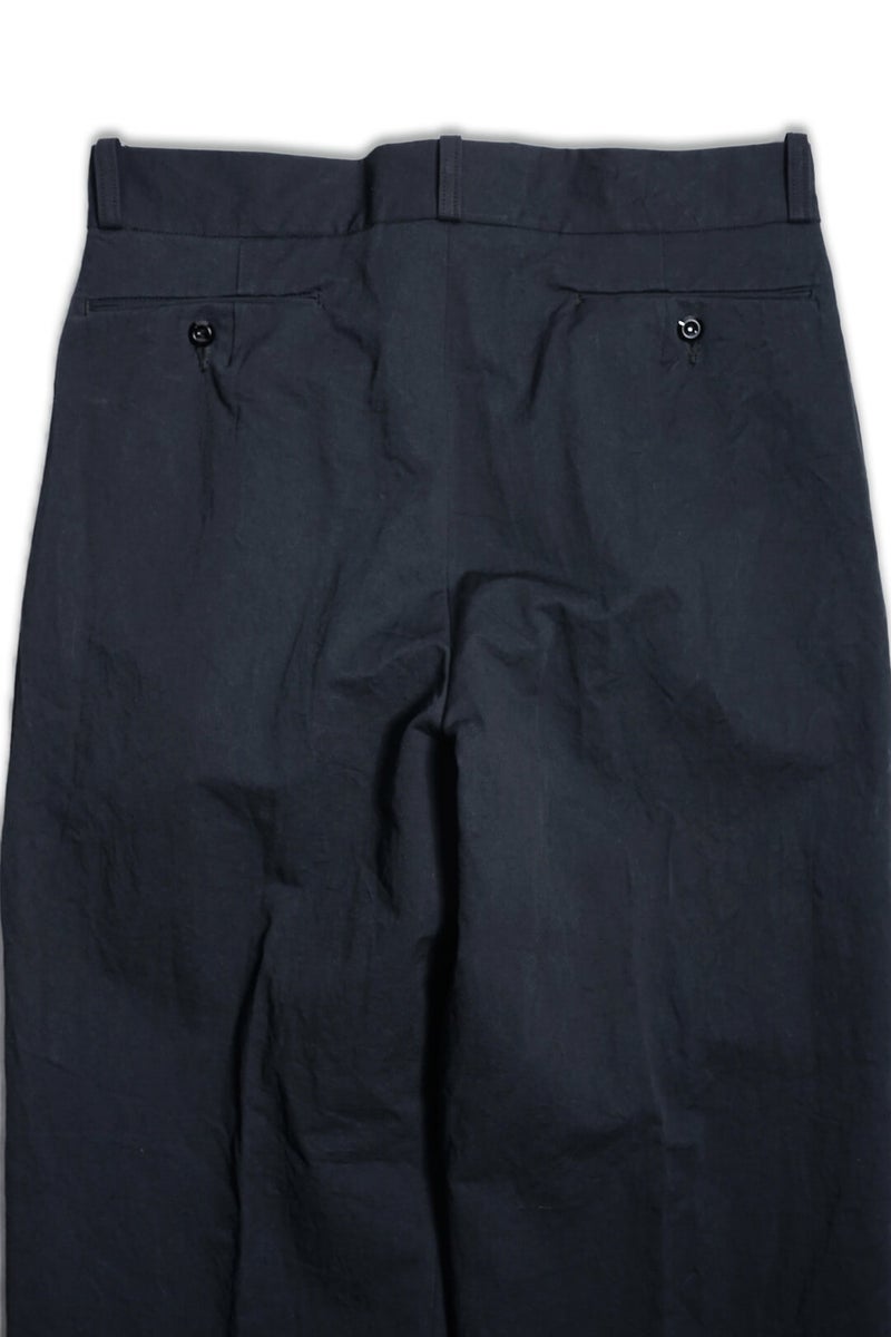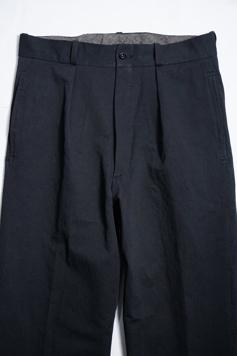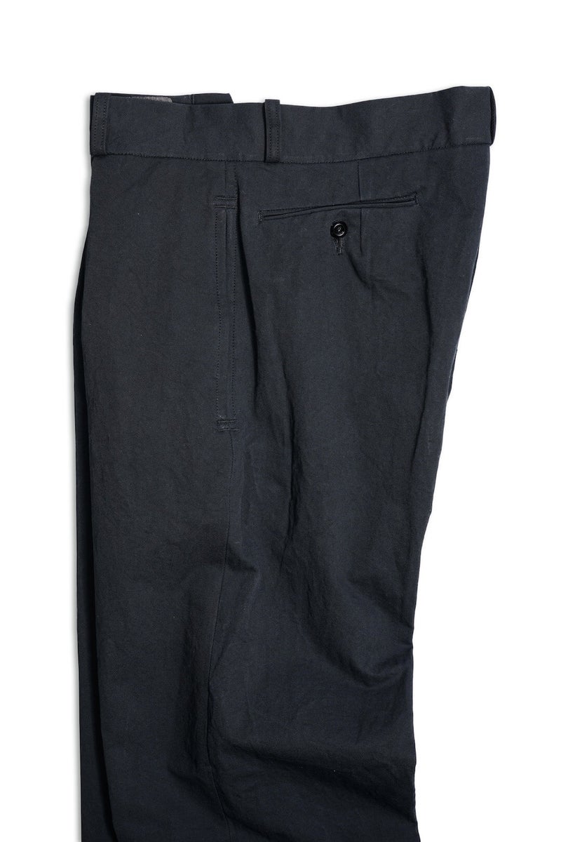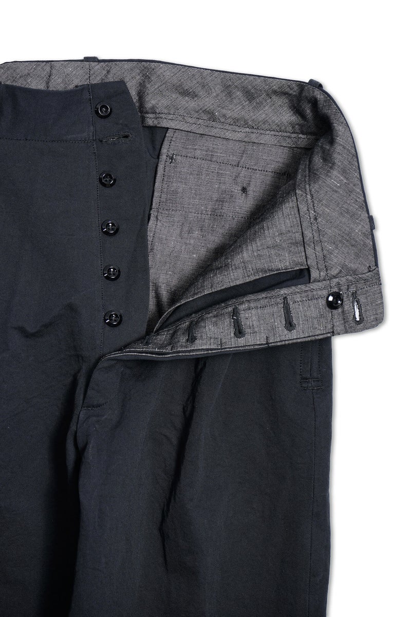 1915年にフランス軍へ支給されていたミリタリートラウザーズのフィット感、ディテールを参考に製作したトラウザーズ。ゆとりのあるフィット感でありながら、ハリ感のある生地と相まって綺麗なシルエットを描く一本です。
