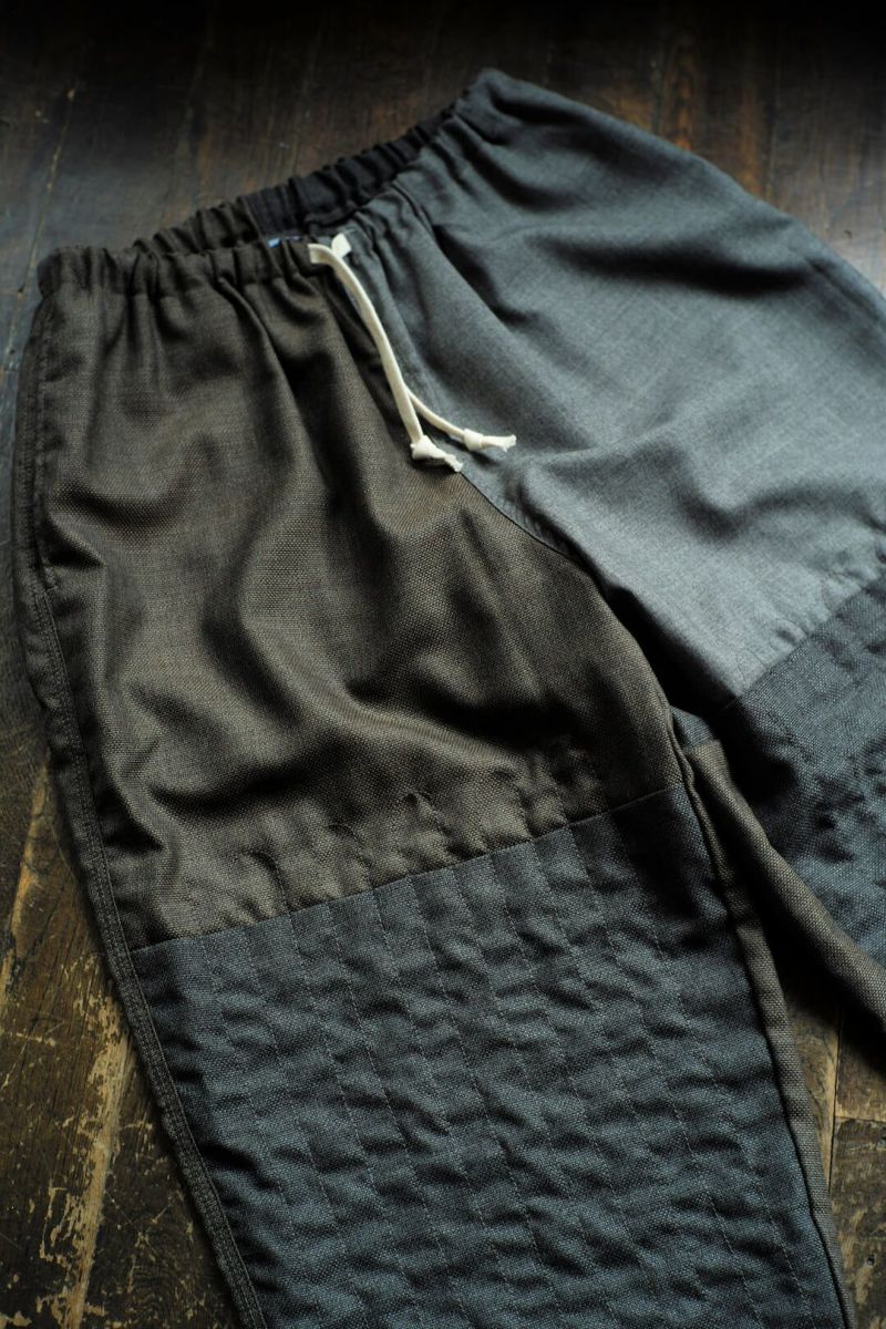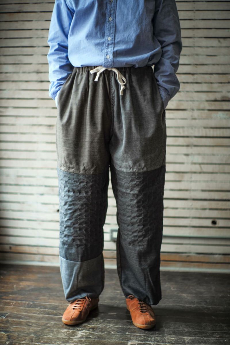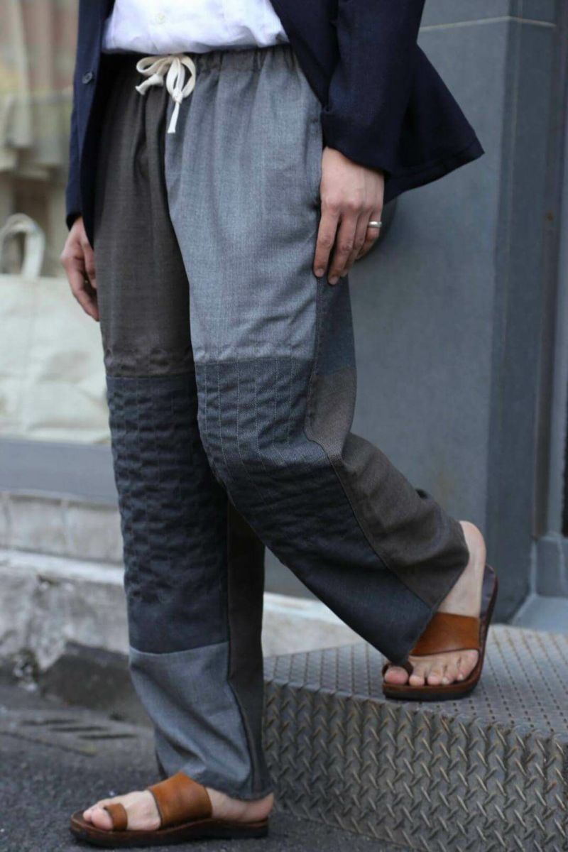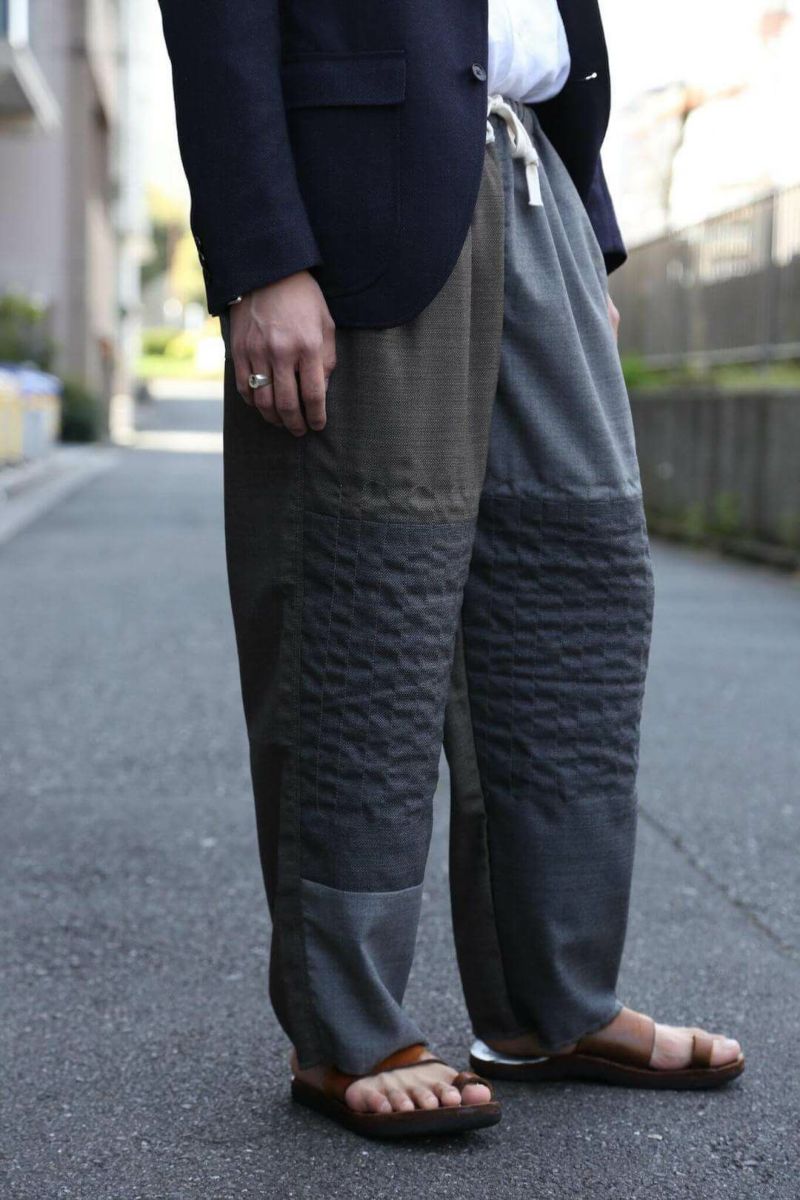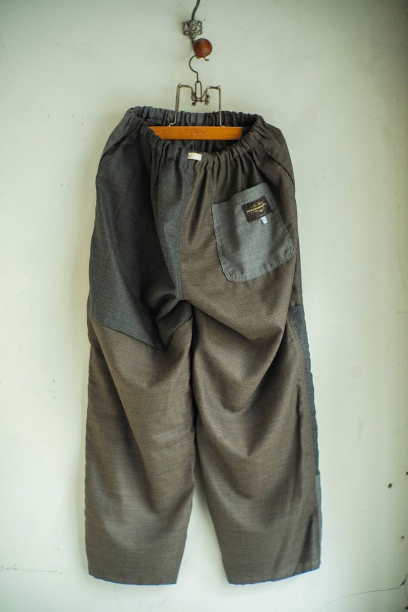 KENNETH FIELDのSPORTS COATやTROUSERSに使用しているホップサックの生地とサマーウールの生地を、パッチワークで仕上げています。グレーとブラウンの生地の組み合わせはシックでいて合わせやすい色味です。
