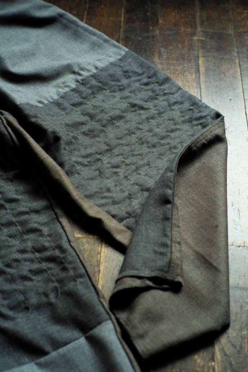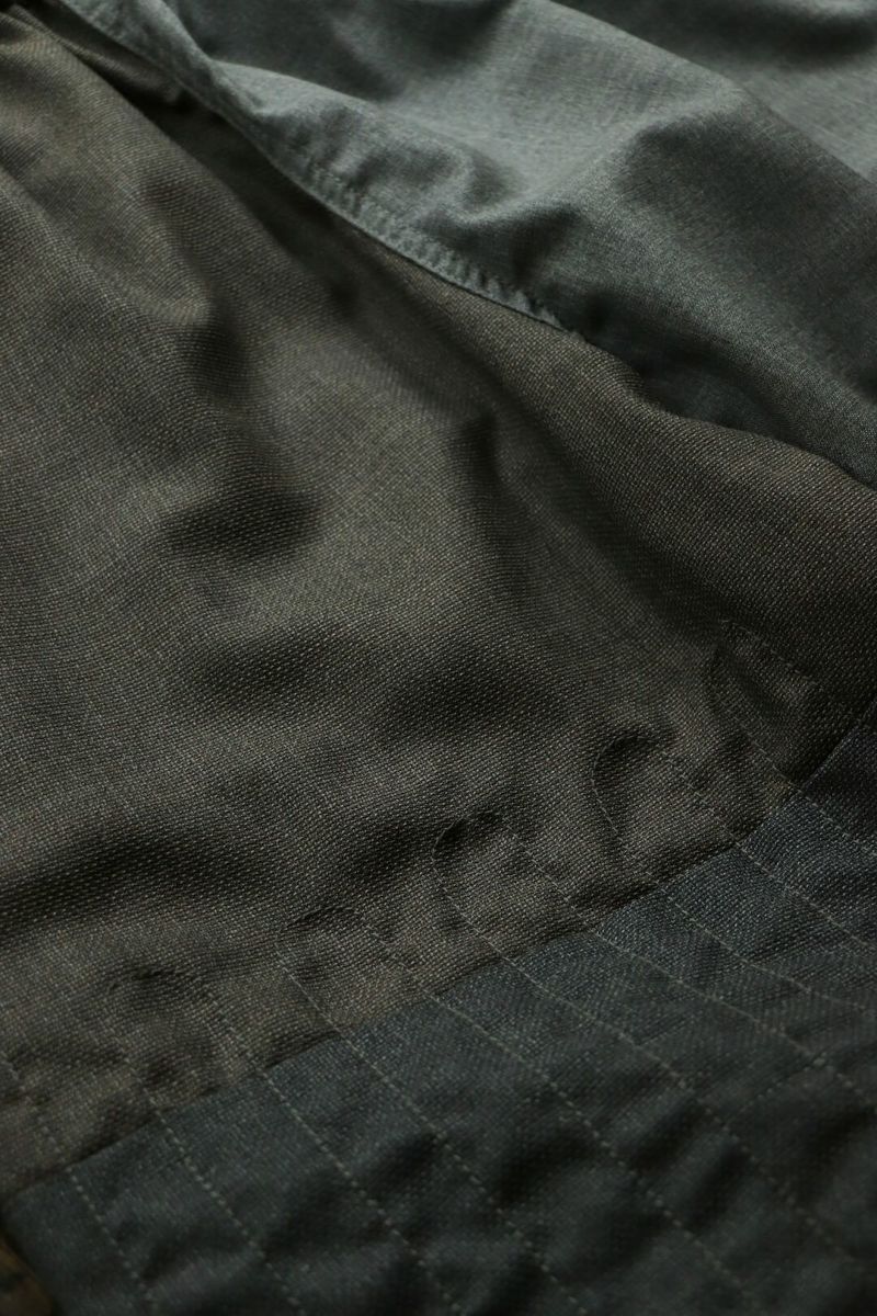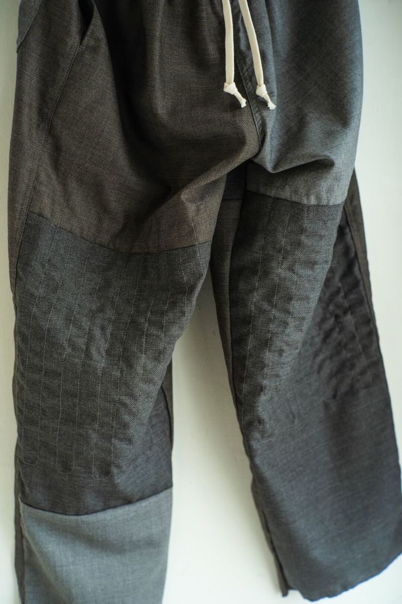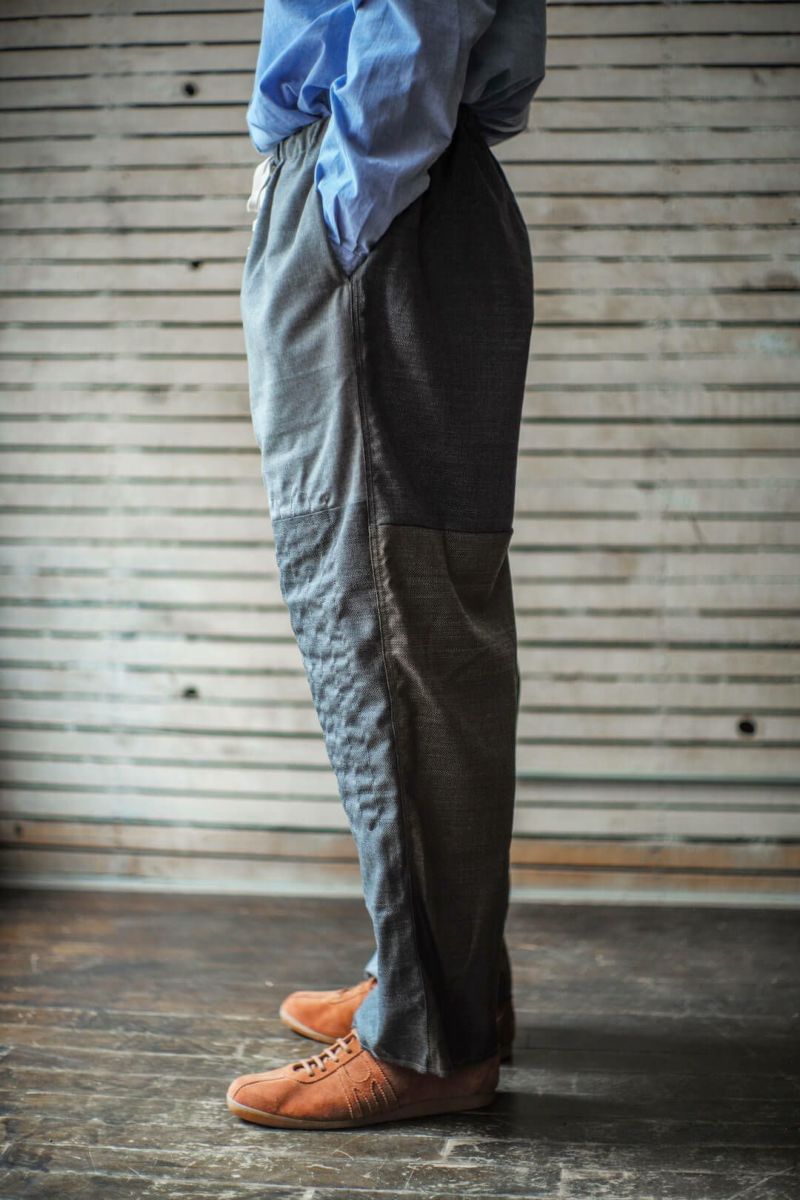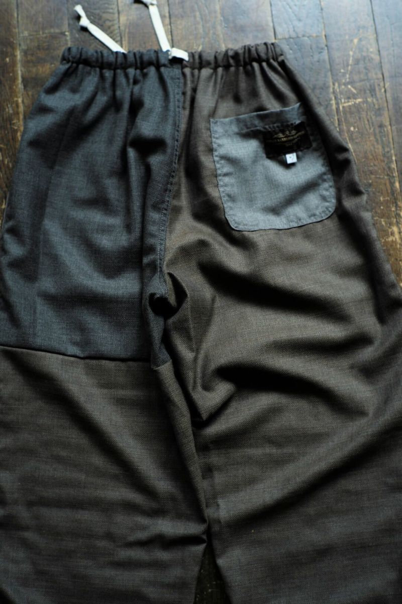 KENNETH FIELDのSPORTS COATやTROUSERSに使用しているホップサックの生地とサマーウールの生地を、パッチワークで仕上げています。グレーとブラウンの生地の組み合わせはシックでいて合わせやすい色味です。
