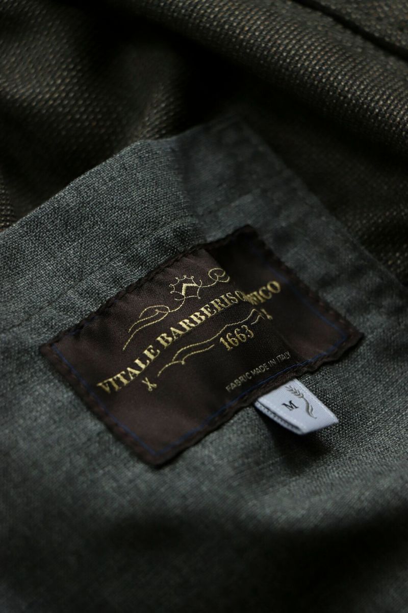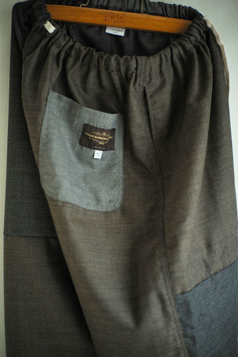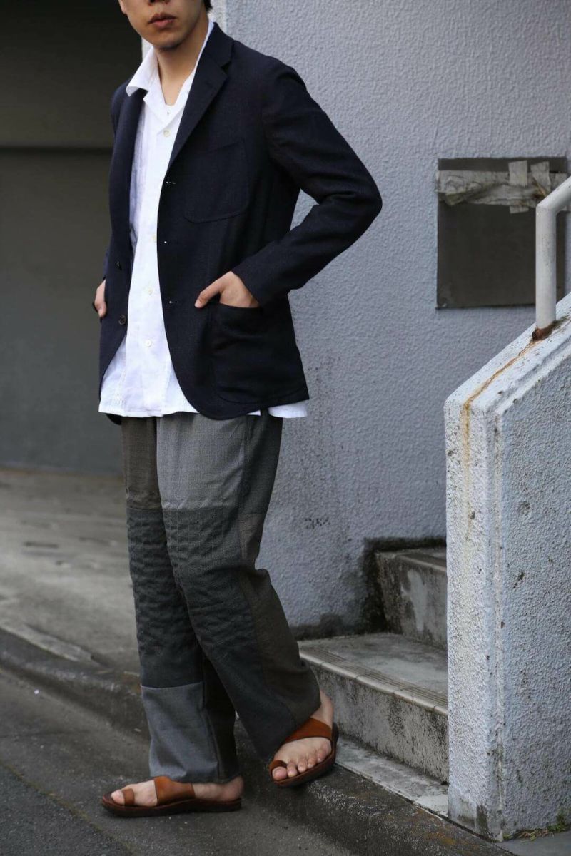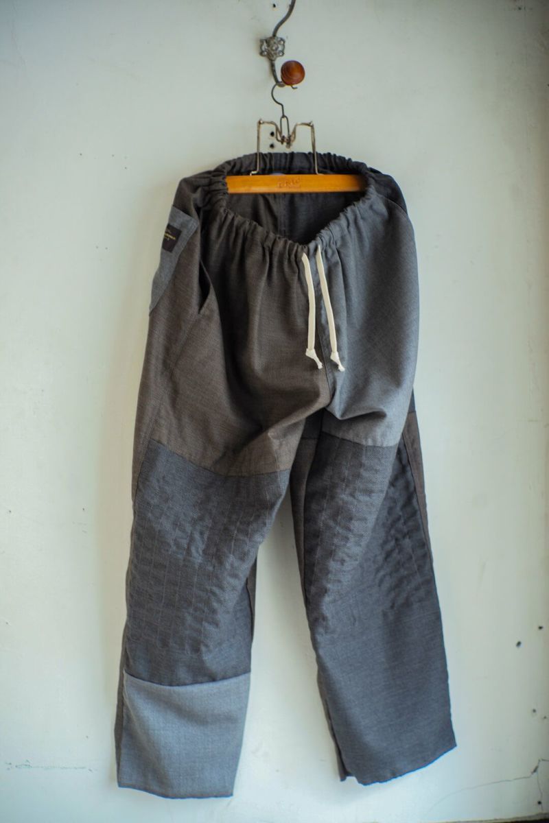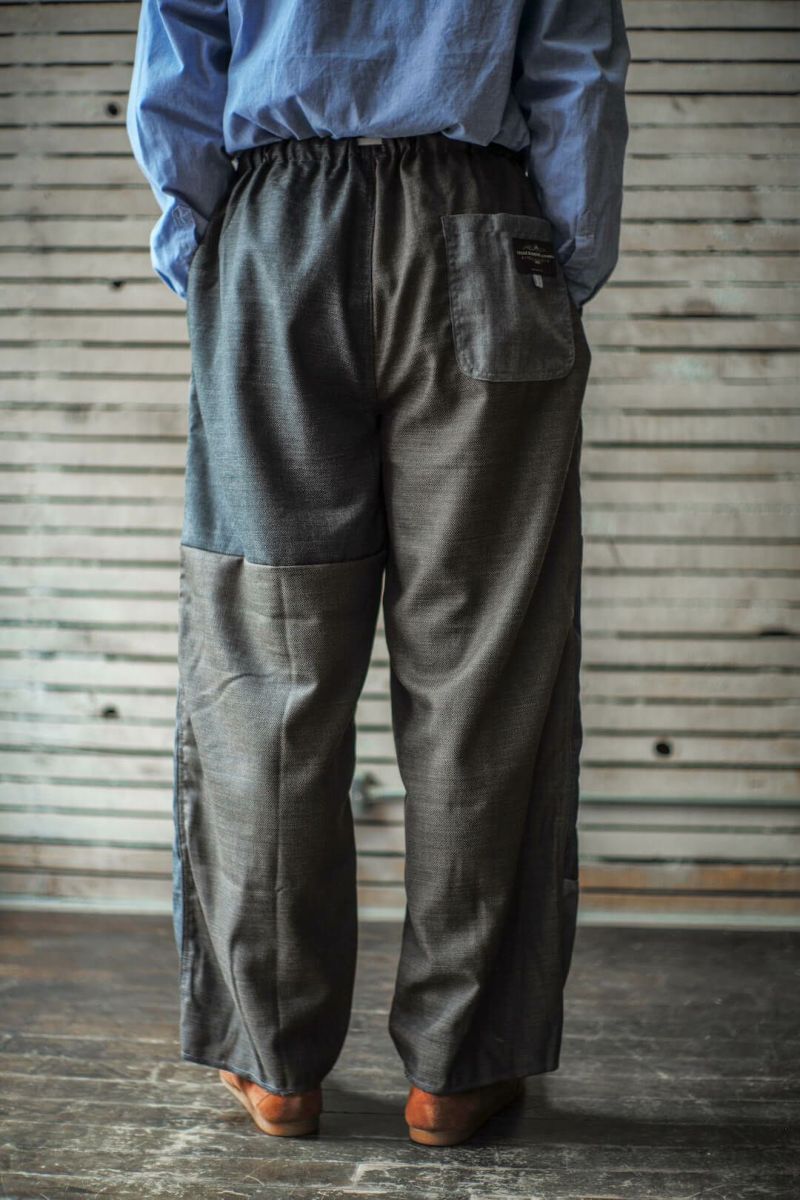 KENNETH FIELDのSPORTS COATやTROUSERSに使用しているホップサックの生地とサマーウールの生地を、パッチワークで仕上げています。グレーとブラウンの生地の組み合わせはシックでいて合わせやすい色味です。