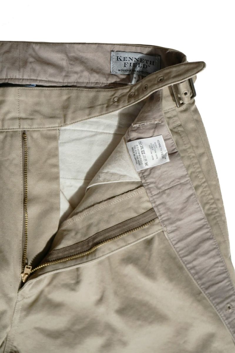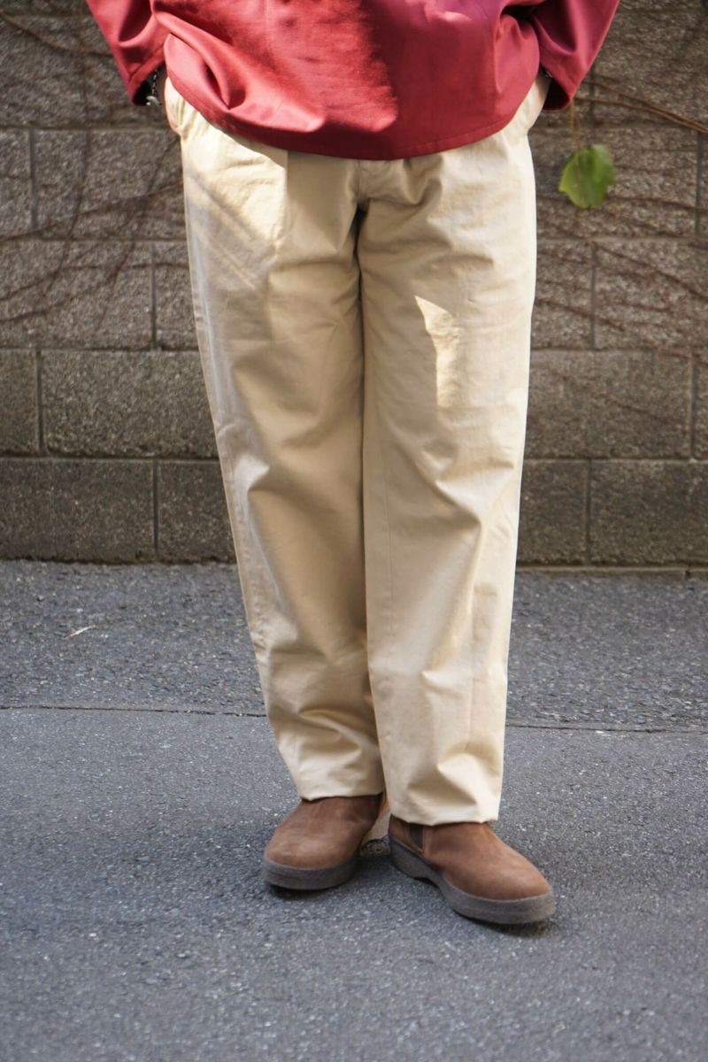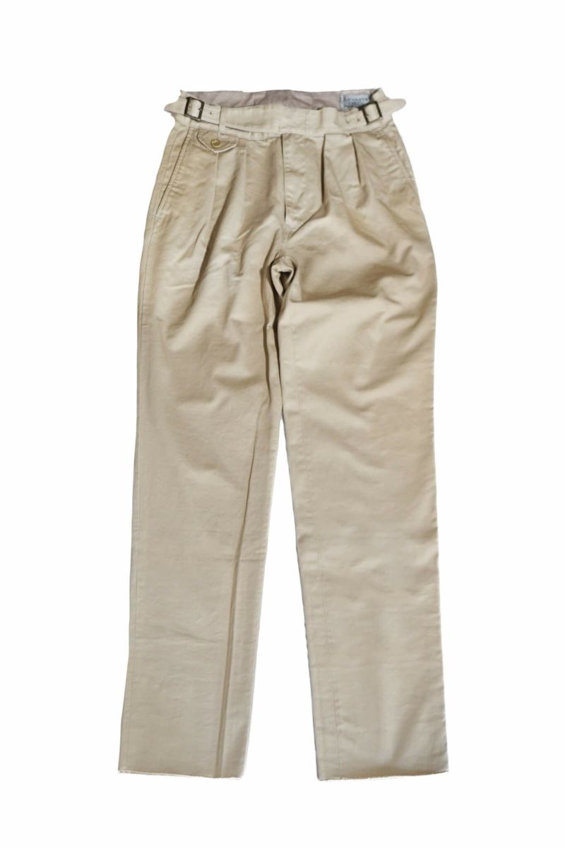 イギリスのミリタリーパンツがベースで、両サイドで留めるウエストバンドでミリタリーの匂いを残しなが、プリーツ、コインポケットでチノトラウザーズのデザインをミックスしています。