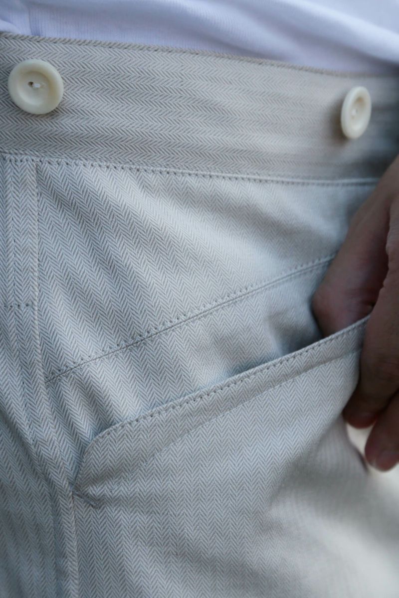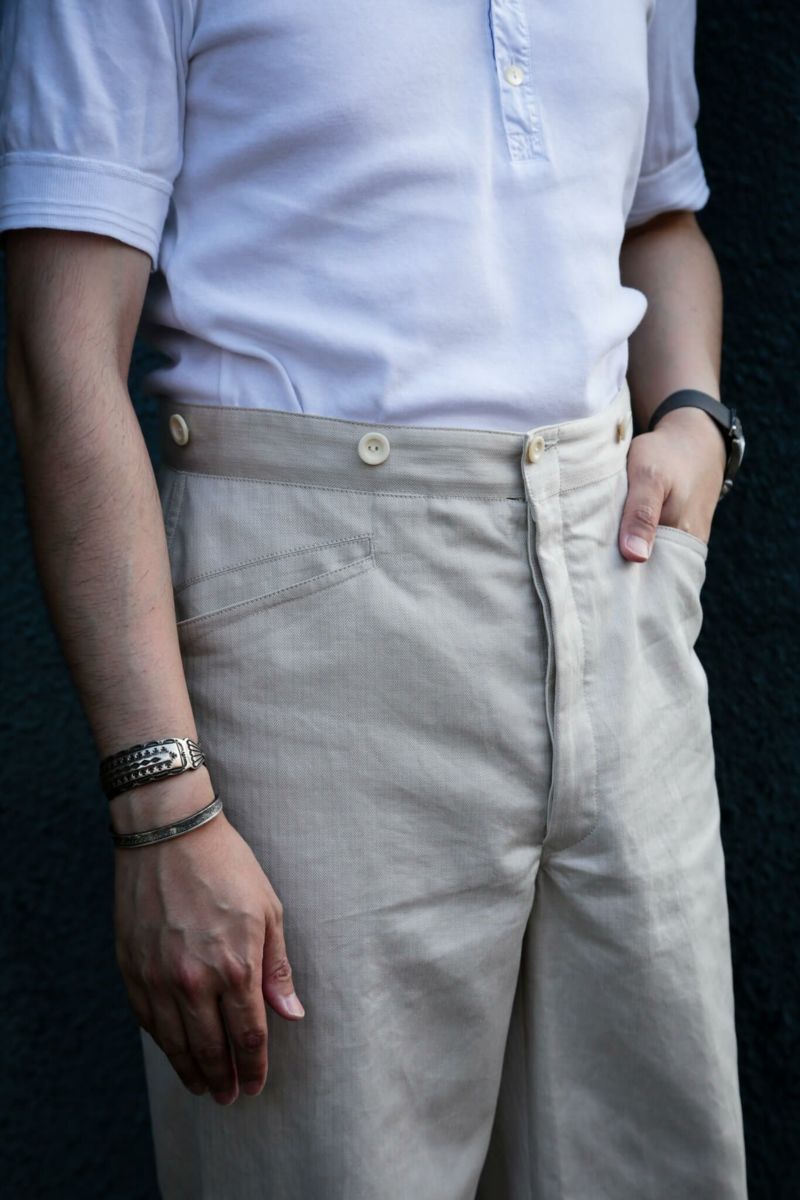 デザインベースはARCHが所有しているブージュロン。数あるブージュロンのディテール・ボタン・シルエットを細かくチェックし製作しました。生地はカリビアンシーアイランドコットンのヘリンボーンを使用。なので夏場はもちろん寒くなってきても穿くことが可能のため、様々なスタイリングを楽しむことができます。