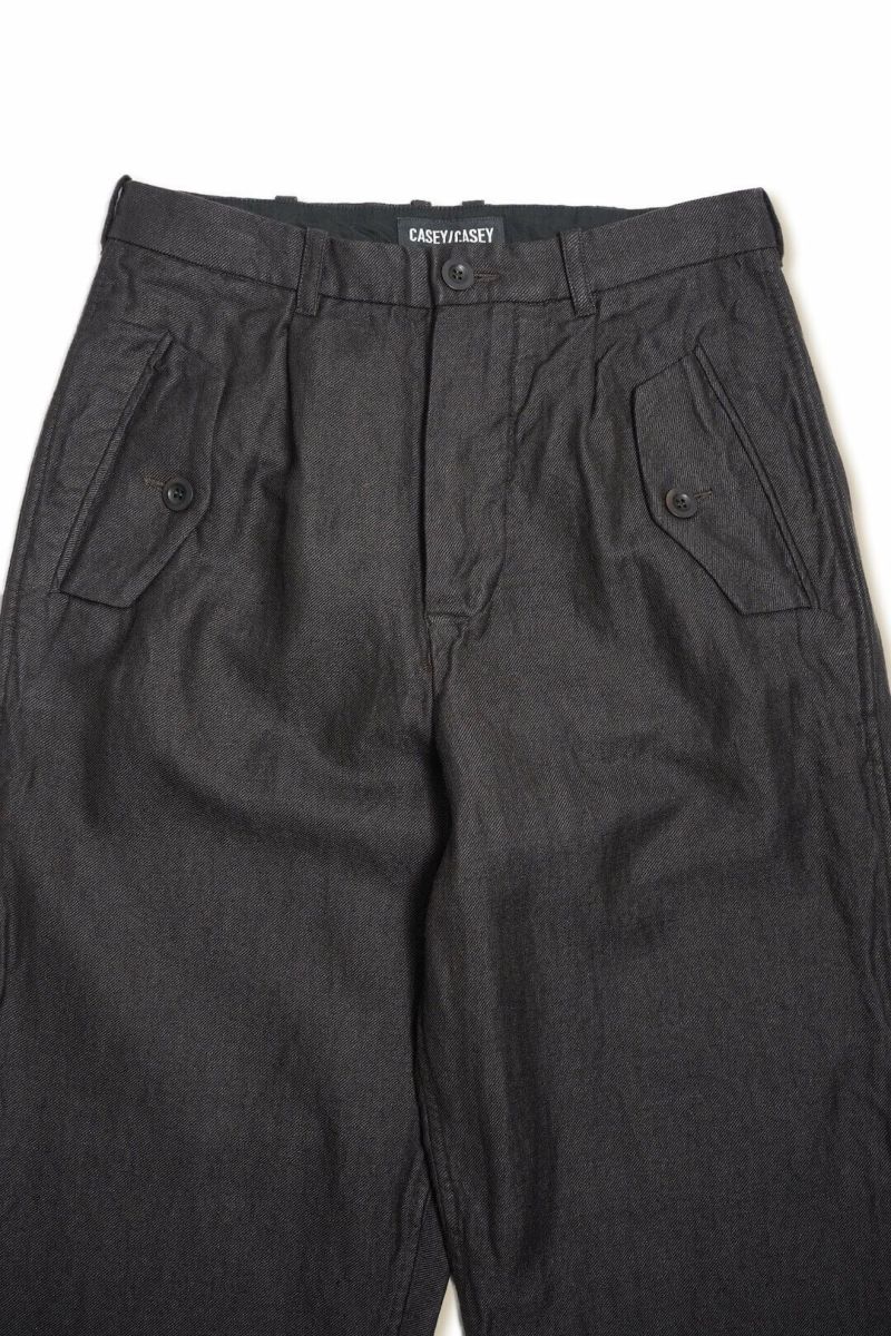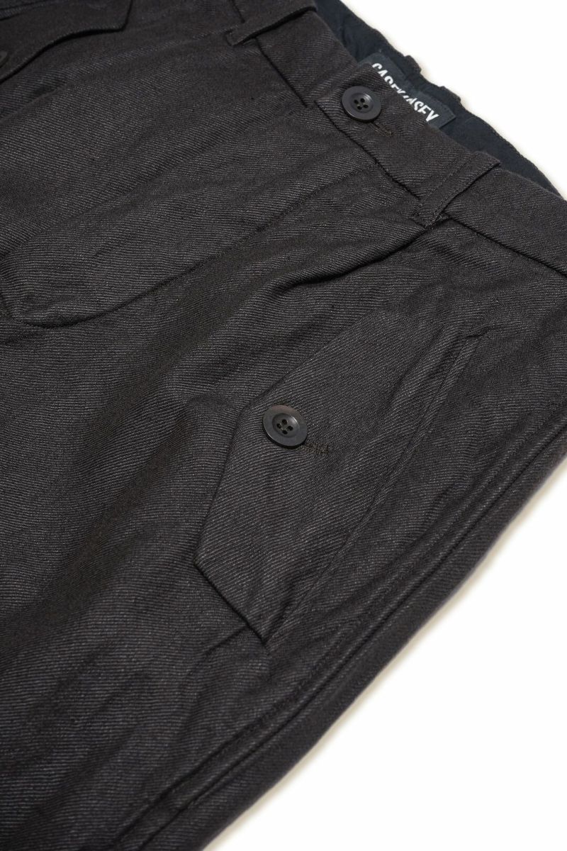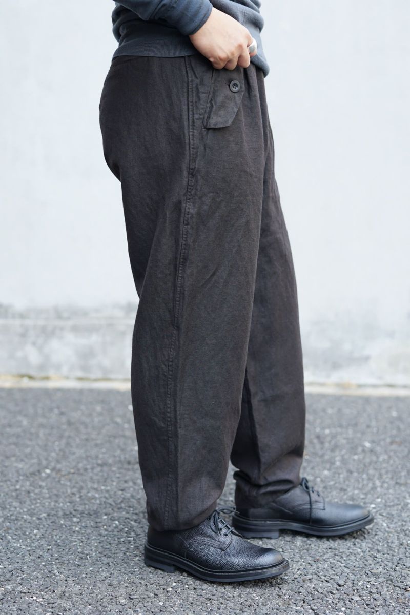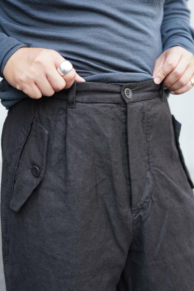 ミリタリーパンツを彷彿とさせるデザインとスタイリッシュなシルエットを備えたパンツ。素材はリネンの通気性とバージンウールの暖かさを両立した混紡生地を使用しています。深みのある風合い豊かな生地感が魅力的です。