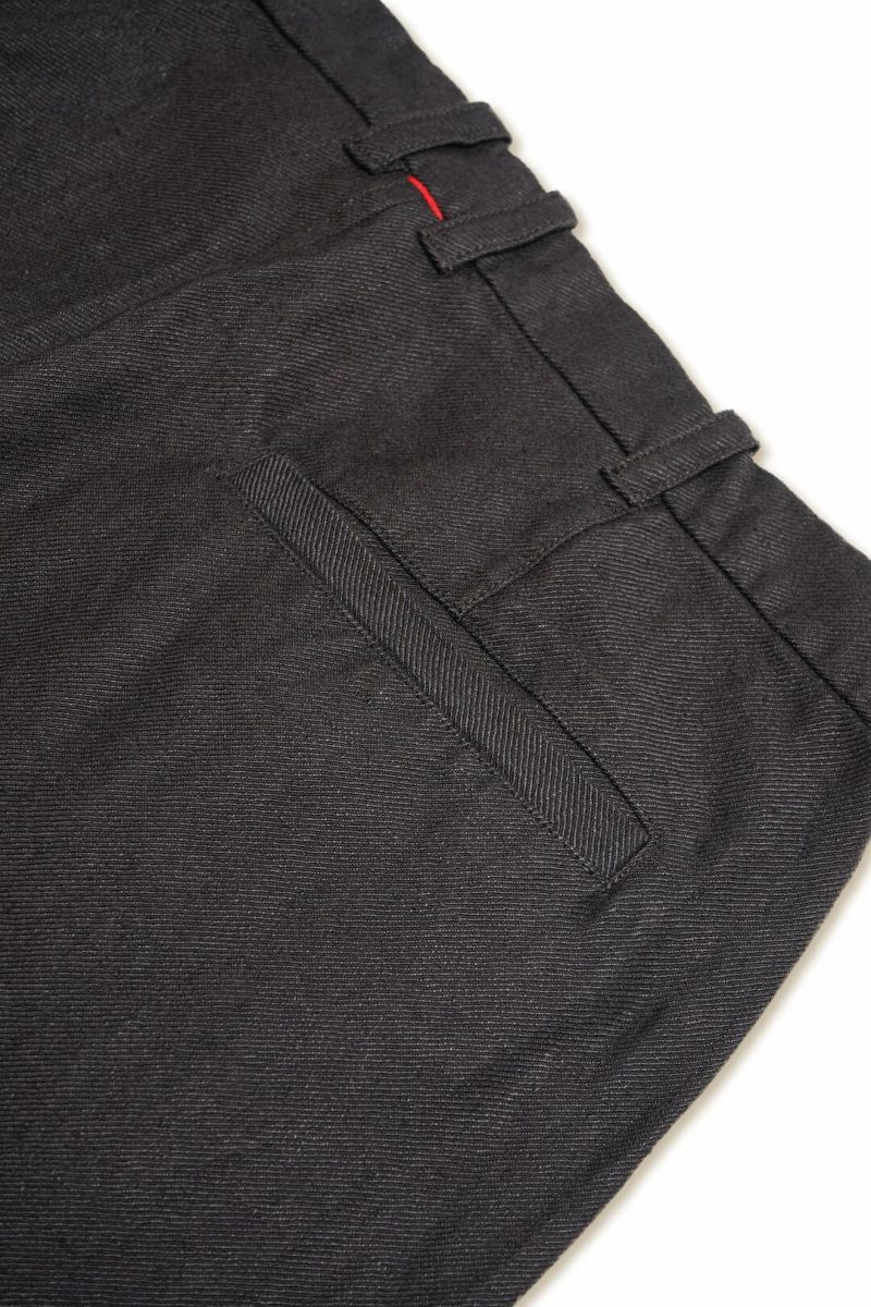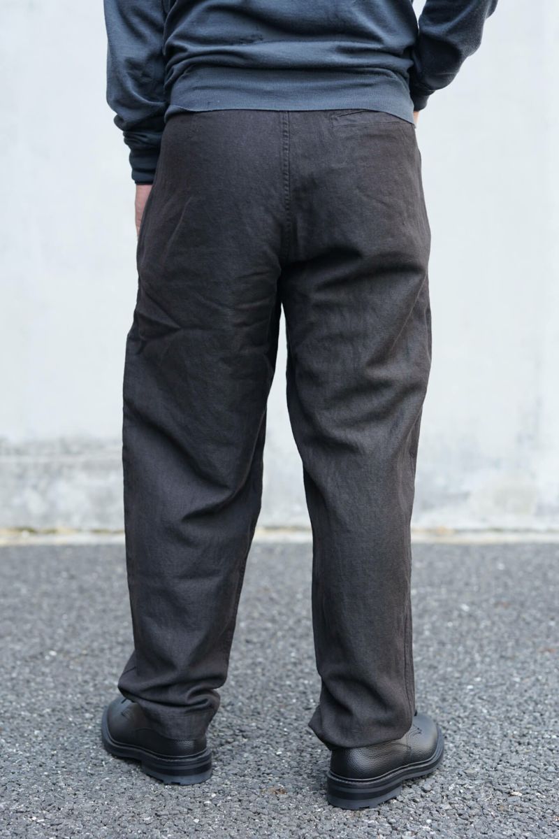 ミリタリーパンツを彷彿とさせるデザインとスタイリッシュなシルエットを備えたパンツ。素材はリネンの通気性とバージンウールの暖かさを両立した混紡生地を使用しています。深みのある風合い豊かな生地感が魅力的です。