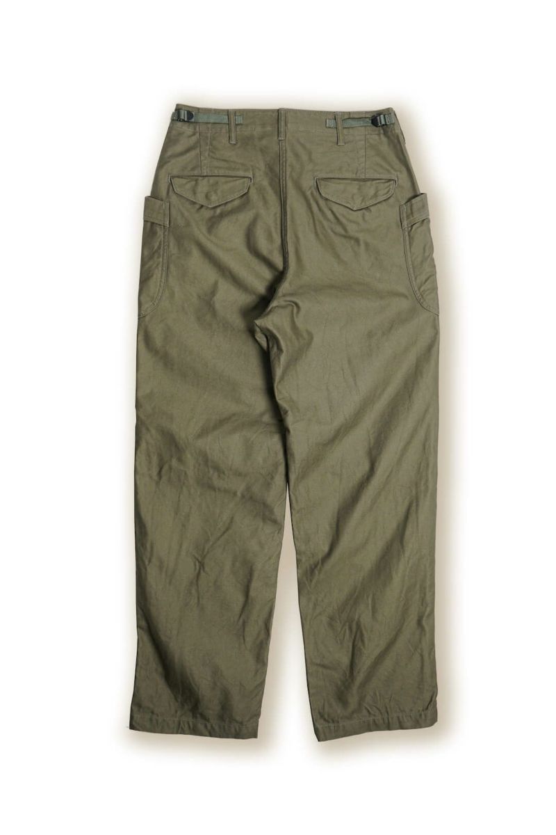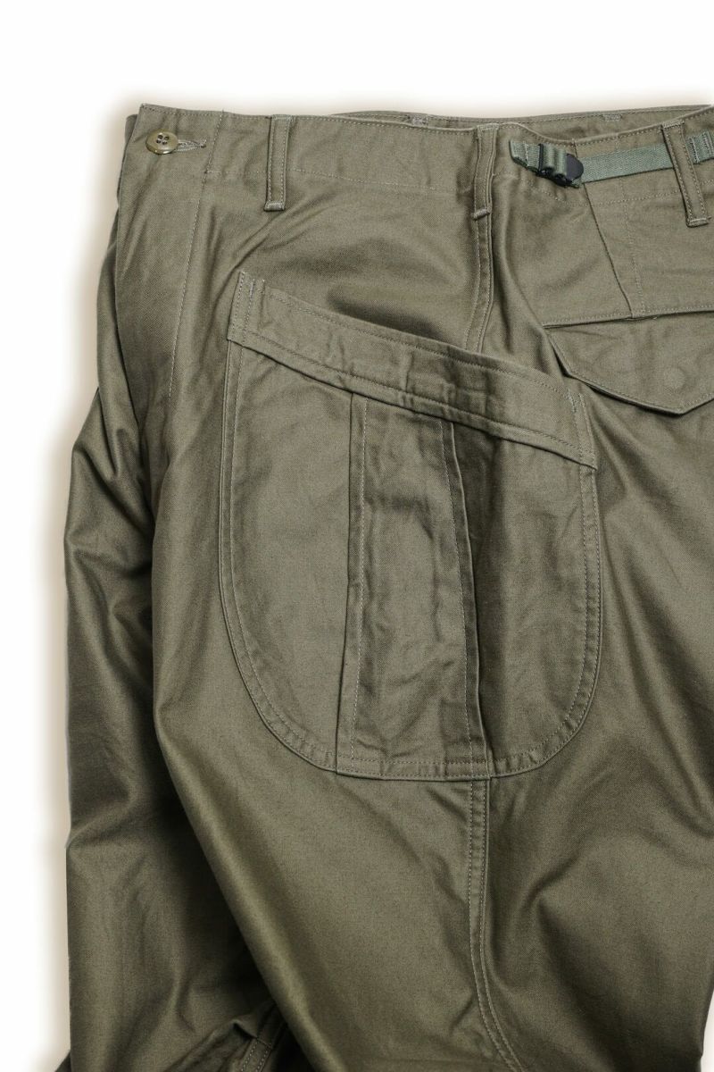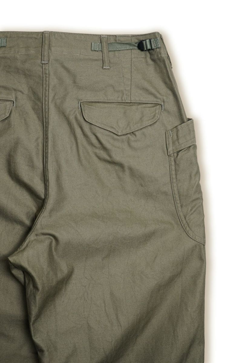 フロントに大きなマチ付きポケットを配した定番のファティーグトラウザーです。素材は緯糸にムラ糸を打ち込み、スレンで染めた高密度バックサテン。初めは若干艶感がありますが、履きこむことで自然なエイジングが楽しめる素材です。膝に4か所タックを入れた立体的なパターンに。