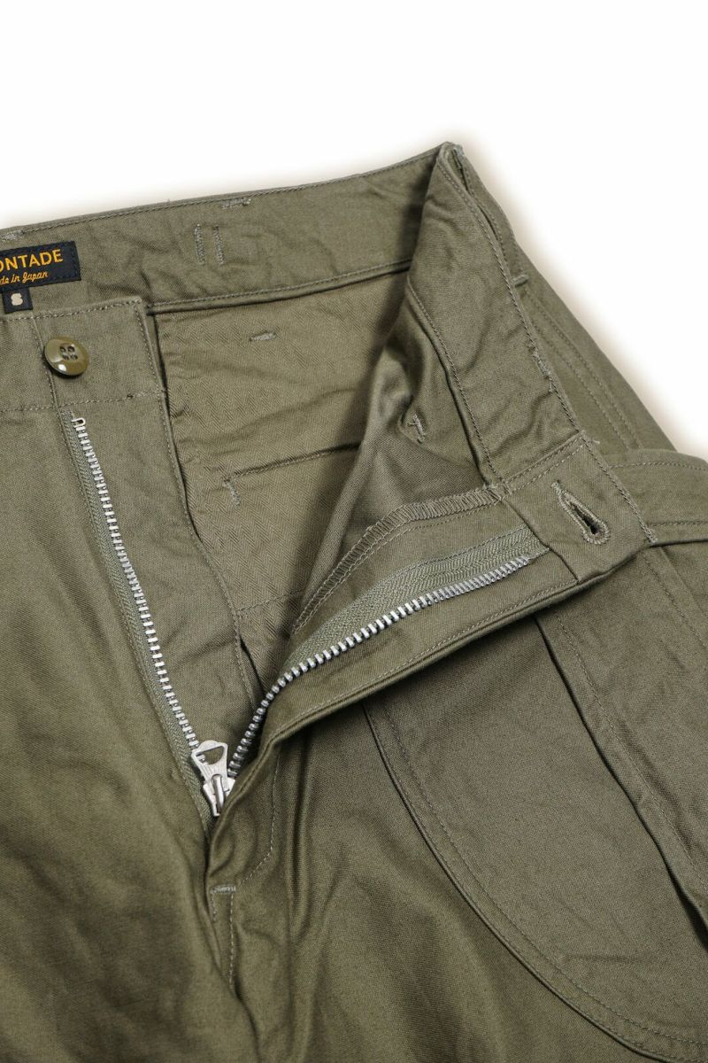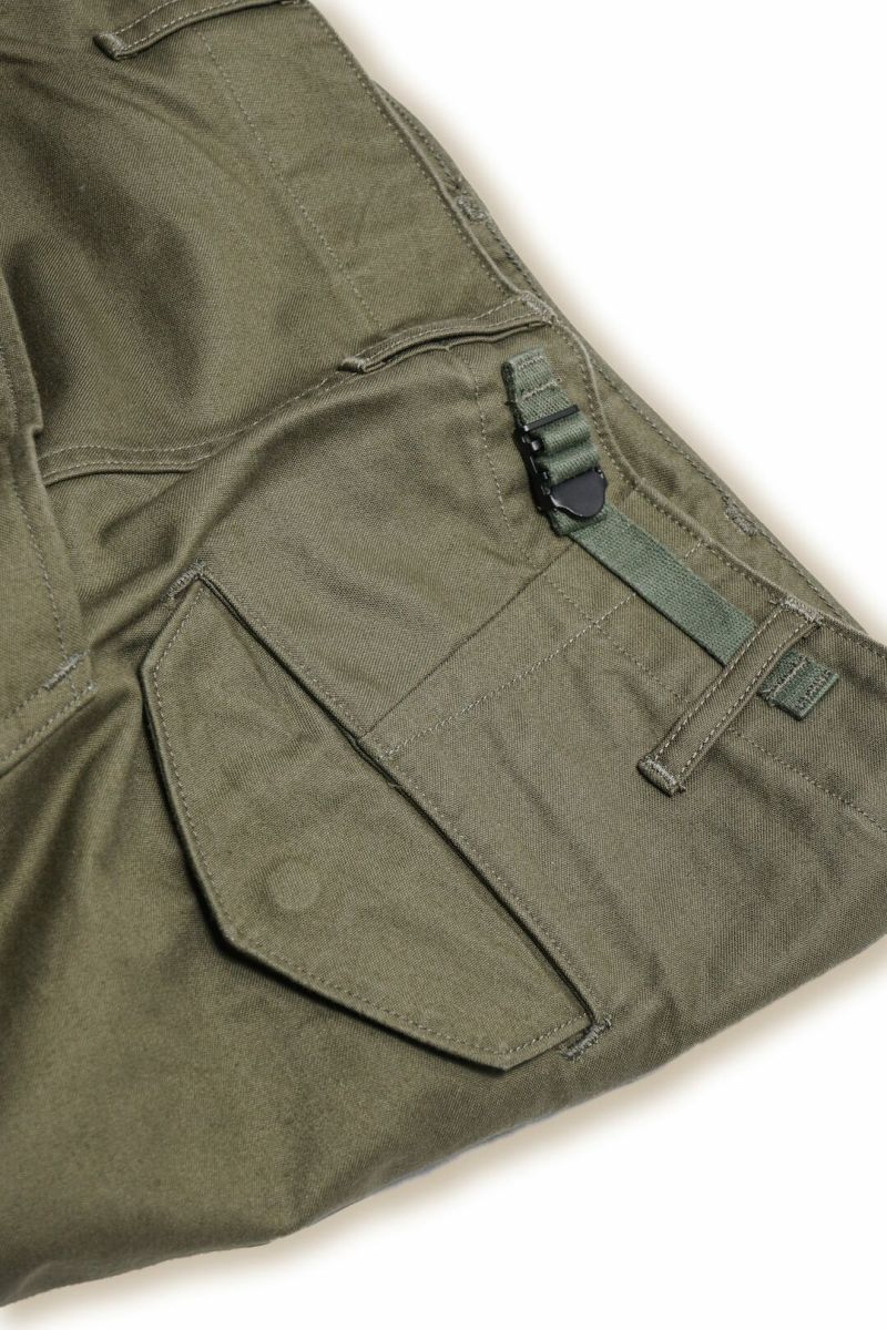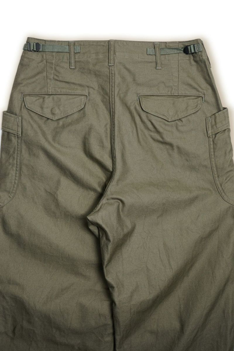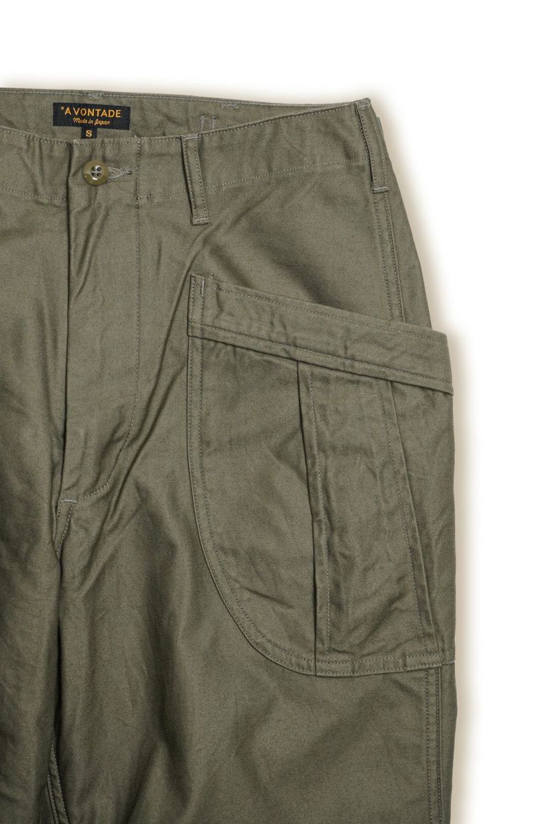 フロントに大きなマチ付きポケットを配した定番のファティーグトラウザーです。素材は緯糸にムラ糸を打ち込み、スレンで染めた高密度バックサテン。初めは若干艶感がありますが、履きこむことで自然なエイジングが楽しめる素材です。膝に4か所タックを入れた立体的なパターンに。