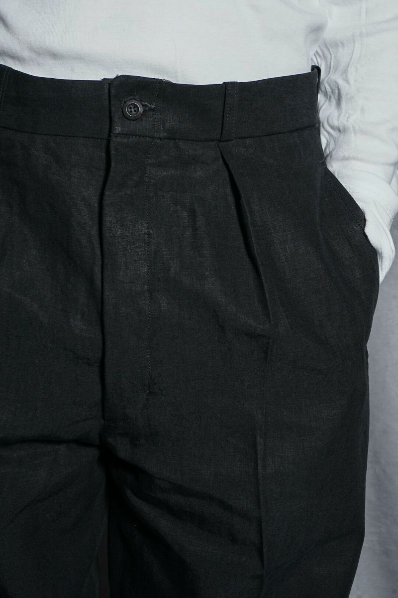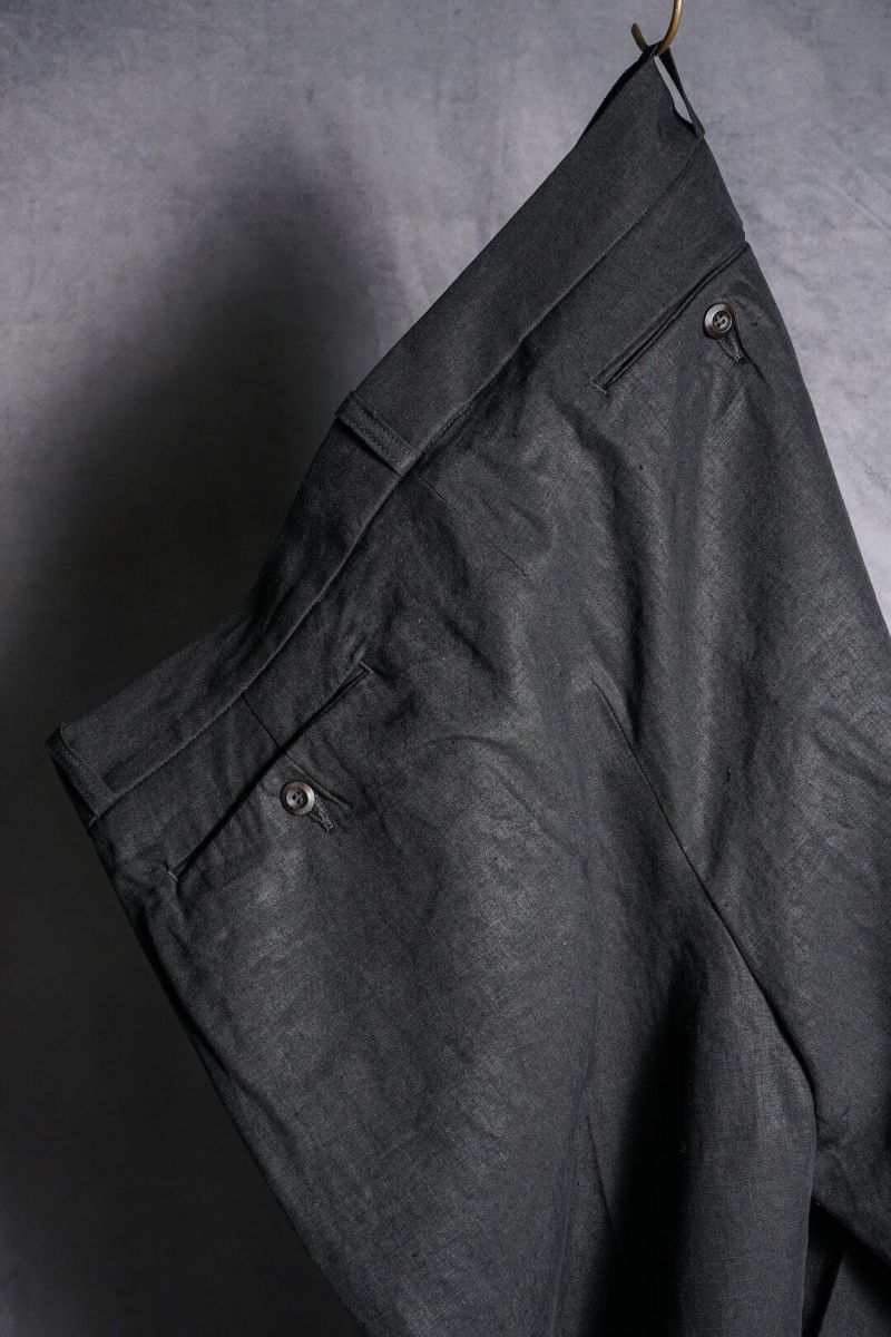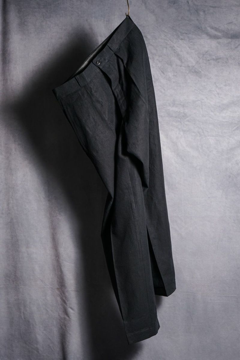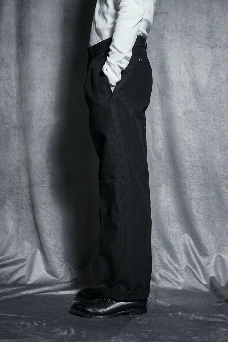 1915年にフランス軍へ支給されていたミリタリートラウザーズのフィット感、ディテールを参考に製作したトラウザーズ。ゆとりのあるフィット感でありながら、ハリ感のある生地と相まって綺麗なシルエットを描く一本です。